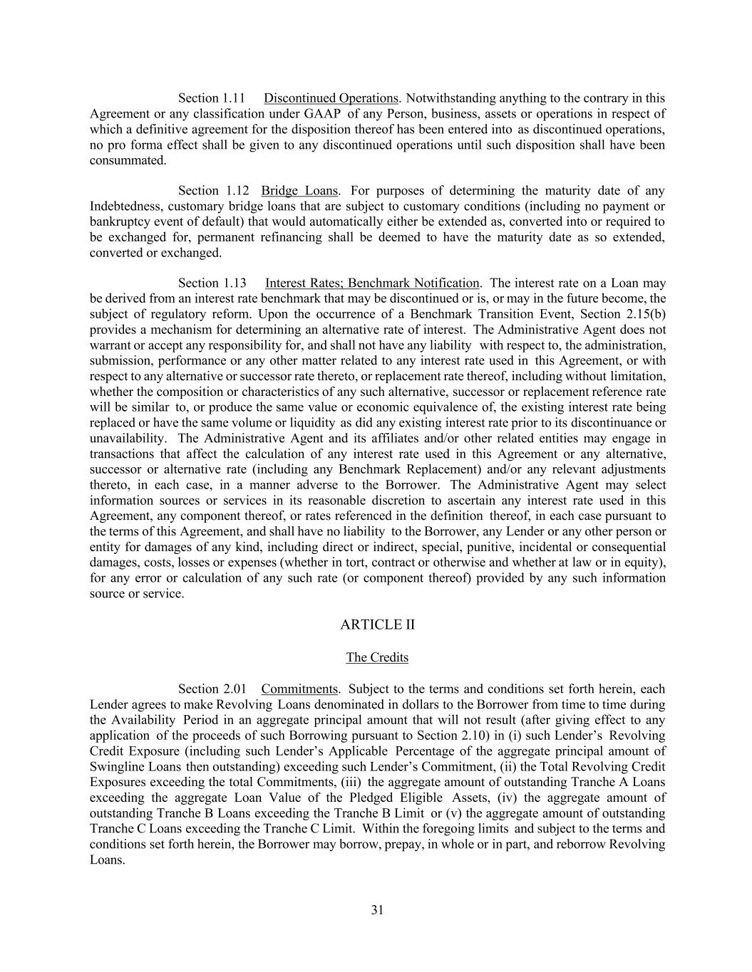 31 Section 1.11 Discontinued Operations. Notwithstanding anything to the contrary in this Agreement or any classification under GAAP of any Person, business, assets or operations in respect of which a definitive agreement for the disposition thereof has been entered into as discontinued operations, no pro forma effect shall be given to any discontinued operations until such disposition shall have been consummated. Section 1.12 Bridge Loans. For purposes of determining the maturity date of any Indebtedness, customary bridge loans that are subject to customary conditions (including no payment or bankruptcy event of default) that would automatically either be extended as, converted into or required to be exchanged for, permanent refinancing shall be deemed to have the maturity date as so extended, converted or exchanged. Section 1.13 Interest Rates; Benchmark Notification. The interest rate on a Loan may be derived from an interest rate benchmark that may be discontinued or is, or may in the future become, the subject of regulatory reform. Upon the occurrence of a Benchmark Transition Event, Section 2.15(b) provides a mechanism for determining an alternative rate of interest. The Administrative Agent does not warrant or accept any responsibility for, and shall not have any liability with respect to, the administration, submission, performance or any other matter related to any interest rate used in this Agreement, or with respect to any alternative or successor rate thereto, or replacement rate thereof, including without limitation, whether the composition or characteristics of any such alternative, successor or replacement reference rate will be similar to, or produce the same value or economic equivalence of, the existing interest rate being replaced or have the same volume or liquidity as did any existing interest rate prior to its discontinuance or unavailability. The Administrative Agent and its affiliates and/or other related entities may engage in transactions that affect the calculation of any interest rate used in this Agreement or any alternative, successor or alternative rate (including any Benchmark Replacement) and/or any relevant adjustments thereto, in each case, in a manner adverse to the Borrower. The Administrative Agent may select information sources or services in its reasonable discretion to ascertain any interest rate used in this Agreement, any component thereof, or rates referenced in the definition thereof, in each case pursuant to the terms of this Agreement, and shall have no liability to the Borrower, any Lender or any other person or entity for damages of any kind, including direct or indirect, special, punitive, incidental or consequential damages, costs, losses or expenses (whether in tort, contract or otherwise and whether at law or in equity), for any error or calculation of any such rate (or component thereof) provided by any such information source or service. ARTICLE II The Credits Section 2.01 Commitments. Subject to the terms and conditions set forth herein, each Lender agrees to make Revolving Loans denominated in dollars to the Borrower from time to time during the Availability Period in an aggregate principal amount that will not result (after giving effect to any application of the proceeds of such Borrowing pursuant to Section 2.10) in (i) such Lender’s Revolving Credit Exposure (including such Lender’s Applicable Percentage of the aggregate principal amount of Swingline Loans then outstanding) exceeding such Lender’s Commitment, (ii) the Total Revolving Credit Exposures exceeding the total Commitments, (iii) the aggregate amount of outstanding Tranche A Loans exceeding the aggregate Loan Value of the Pledged Eligible Assets, (iv) the aggregate amount of outstanding Tranche B Loans exceeding the Tranche B Limit or (v) the aggregate amount of outstanding Tranche C Loans exceeding the Tranche C Limit. Within the foregoing limits and subject to the terms and conditions set forth herein, the Borrower may borrow, prepay, in whole or in part, and reborrow Revolving Loans.