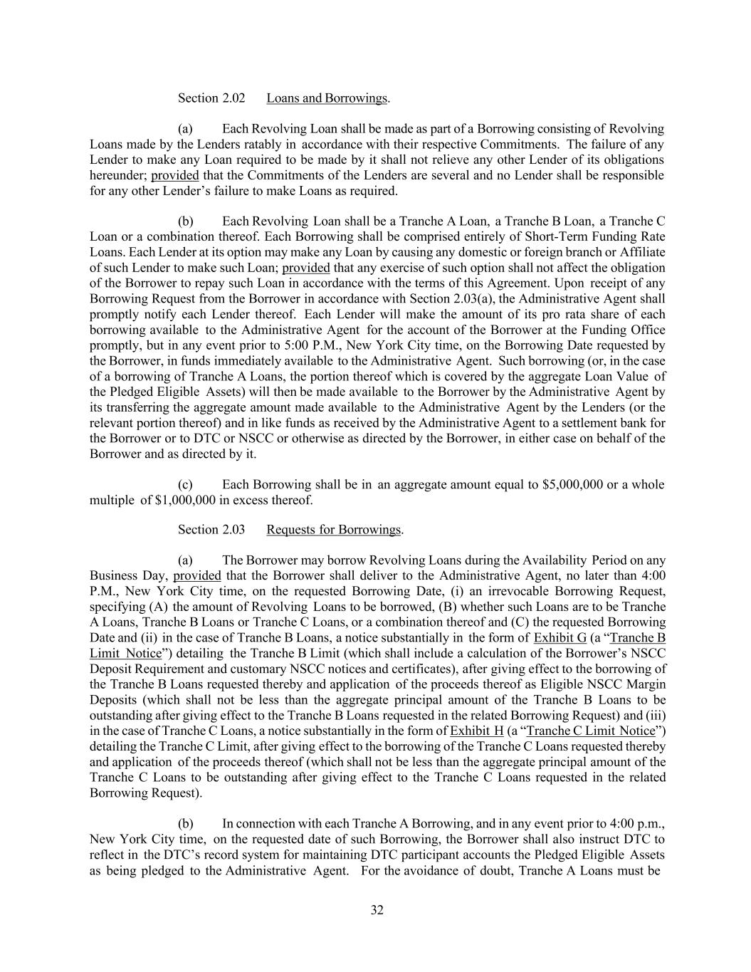 32 Section 2.02 Loans and Borrowings. (a) Each Revolving Loan shall be made as part of a Borrowing consisting of Revolving Loans made by the Lenders ratably in accordance with their respective Commitments. The failure of any Lender to make any Loan required to be made by it shall not relieve any other Lender of its obligations hereunder; provided that the Commitments of the Lenders are several and no Lender shall be responsible for any other Lender’s failure to make Loans as required. (b) Each Revolving Loan shall be a Tranche A Loan, a Tranche B Loan, a Tranche C Loan or a combination thereof. Each Borrowing shall be comprised entirely of Short-Term Funding Rate Loans. Each Lender at its option may make any Loan by causing any domestic or foreign branch or Affiliate of such Lender to make such Loan; provided that any exercise of such option shall not affect the obligation of the Borrower to repay such Loan in accordance with the terms of this Agreement. Upon receipt of any Borrowing Request from the Borrower in accordance with Section 2.03(a), the Administrative Agent shall promptly notify each Lender thereof. Each Lender will make the amount of its pro rata share of each borrowing available to the Administrative Agent for the account of the Borrower at the Funding Office promptly, but in any event prior to 5:00 P.M., New York City time, on the Borrowing Date requested by the Borrower, in funds immediately available to the Administrative Agent. Such borrowing (or, in the case of a borrowing of Tranche A Loans, the portion thereof which is covered by the aggregate Loan Value of the Pledged Eligible Assets) will then be made available to the Borrower by the Administrative Agent by its transferring the aggregate amount made available to the Administrative Agent by the Lenders (or the relevant portion thereof) and in like funds as received by the Administrative Agent to a settlement bank for the Borrower or to DTC or NSCC or otherwise as directed by the Borrower, in either case on behalf of the Borrower and as directed by it. (c) Each Borrowing shall be in an aggregate amount equal to $5,000,000 or a whole multiple of $1,000,000 in excess thereof. Section 2.03 Requests for Borrowings. (a) The Borrower may borrow Revolving Loans during the Availability Period on any Business Day, provided that the Borrower shall deliver to the Administrative Agent, no later than 4:00 P.M., New York City time, on the requested Borrowing Date, (i) an irrevocable Borrowing Request, specifying (A) the amount of Revolving Loans to be borrowed, (B) whether such Loans are to be Tranche A Loans, Tranche B Loans or Tranche C Loans, or a combination thereof and (C) the requested Borrowing Date and (ii) in the case of Tranche B Loans, a notice substantially in the form of Exhibit G (a “Tranche B Limit Notice”) detailing the Tranche B Limit (which shall include a calculation of the Borrower’s NSCC Deposit Requirement and customary NSCC notices and certificates), after giving effect to the borrowing of the Tranche B Loans requested thereby and application of the proceeds thereof as Eligible NSCC Margin Deposits (which shall not be less than the aggregate principal amount of the Tranche B Loans to be outstanding after giving effect to the Tranche B Loans requested in the related Borrowing Request) and (iii) in the case of Tranche C Loans, a notice substantially in the form of Exhibit H (a “Tranche C Limit Notice”) detailing the Tranche C Limit, after giving effect to the borrowing of the Tranche C Loans requested thereby and application of the proceeds thereof (which shall not be less than the aggregate principal amount of the Tranche C Loans to be outstanding after giving effect to the Tranche C Loans requested in the related Borrowing Request). (b) In connection with each Tranche A Borrowing, and in any event prior to 4:00 p.m., New York City time, on the requested date of such Borrowing, the Borrower shall also instruct DTC to reflect in the DTC’s record system for maintaining DTC participant accounts the Pledged Eligible Assets as being pledged to the Administrative Agent. For the avoidance of doubt, Tranche A Loans must be