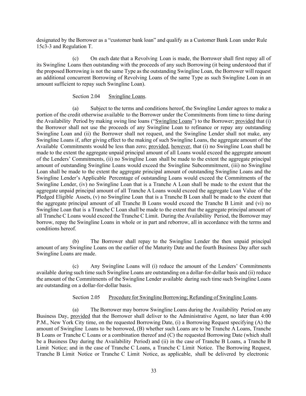33 designated by the Borrower as a “customer bank loan” and qualify as a Customer Bank Loan under Rule 15c3-3 and Regulation T. (c) On each date that a Revolving Loan is made, the Borrower shall first repay all of its Swingline Loans then outstanding with the proceeds of any such Borrowing (it being understood that if the proposed Borrowing is not the same Type as the outstanding Swingline Loan, the Borrower will request an additional concurrent Borrowing of Revolving Loans of the same Type as such Swingline Loan in an amount sufficient to repay such Swingline Loan). Section 2.04 Swingline Loans. (a) Subject to the terms and conditions hereof, the Swingline Lender agrees to make a portion of the credit otherwise available to the Borrower under the Commitments from time to time during the Availability Period by making swing line loans (“Swingline Loans”) to the Borrower; provided that (i) the Borrower shall not use the proceeds of any Swingline Loan to refinance or repay any outstanding Swingline Loan and (ii) the Borrower shall not request, and the Swingline Lender shall not make, any Swingline Loans if, after giving effect to the making of such Swingline Loans, the aggregate amount of the Available Commitments would be less than zero; provided, however, that (i) no Swingline Loan shall be made to the extent the aggregate unpaid principal amount of all Loans would exceed the aggregate amount of the Lenders’ Commitments, (ii) no Swingline Loan shall be made to the extent the aggregate principal amount of outstanding Swingline Loans would exceed the Swingline Subcommitment, (iii) no Swingline Loan shall be made to the extent the aggregate principal amount of outstanding Swingline Loans and the Swingline Lender’s Applicable Percentage of outstanding Loans would exceed the Commitments of the Swingline Lender, (iv) no Swingline Loan that is a Tranche A Loan shall be made to the extent that the aggregate unpaid principal amount of all Tranche A Loans would exceed the aggregate Loan Value of the Pledged Eligible Assets, (v) no Swingline Loan that is a Tranche B Loan shall be made to the extent that the aggregate principal amount of all Tranche B Loans would exceed the Tranche B Limit and (vi) no Swingline Loan that is a Tranche C Loan shall be made to the extent that the aggregate principal amount of all Tranche C Loans would exceed the Tranche C Limit. During the Availability Period, the Borrower may borrow, repay the Swingline Loans in whole or in part and reborrow, all in accordance with the terms and conditions hereof. (b) The Borrower shall repay to the Swingline Lender the then unpaid principal amount of any Swingline Loans on the earlier of the Maturity Date and the fourth Business Day after such Swingline Loans are made. (c) Any Swingline Loans will (i) reduce the amount of the Lenders’ Commitments available during such time such Swingline Loans are outstanding on a dollar-for-dollar basis and (ii) reduce the amount of the Commitments of the Swingline Lender available during such time such Swingline Loans are outstanding on a dollar-for-dollar basis. Section 2.05 Procedure for Swingline Borrowing; Refunding of Swingline Loans. (a) The Borrower may borrow Swingline Loans during the Availability Period on any Business Day, provided that the Borrower shall deliver to the Administrative Agent, no later than 4:00 P.M., New York City time, on the requested Borrowing Date, (i) a Borrowing Request specifying (A) the amount of Swingline Loans to be borrowed, (B) whether such Loans are to be Tranche A Loans, Tranche B Loans or Tranche C Loans or a combination thereof and (C) the requested Borrowing Date (which shall be a Business Day during the Availability Period) and (ii) in the case of Tranche B Loans, a Tranche B Limit Notice; and in the case of Tranche C Loans, a Tranche C Limit Notice. The Borrowing Request, Tranche B Limit Notice or Tranche C Limit Notice, as applicable, shall be delivered by electronic
