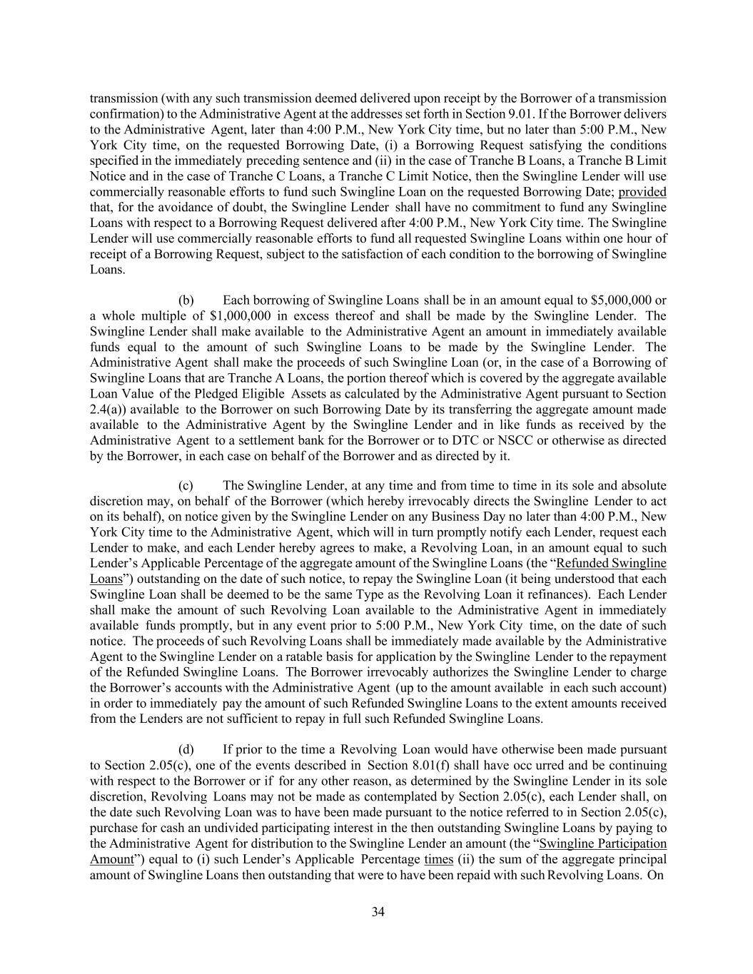34 transmission (with any such transmission deemed delivered upon receipt by the Borrower of a transmission confirmation) to the Administrative Agent at the addresses set forth in Section 9.01. If the Borrower delivers to the Administrative Agent, later than 4:00 P.M., New York City time, but no later than 5:00 P.M., New York City time, on the requested Borrowing Date, (i) a Borrowing Request satisfying the conditions specified in the immediately preceding sentence and (ii) in the case of Tranche B Loans, a Tranche B Limit Notice and in the case of Tranche C Loans, a Tranche C Limit Notice, then the Swingline Lender will use commercially reasonable efforts to fund such Swingline Loan on the requested Borrowing Date; provided that, for the avoidance of doubt, the Swingline Lender shall have no commitment to fund any Swingline Loans with respect to a Borrowing Request delivered after 4:00 P.M., New York City time. The Swingline Lender will use commercially reasonable efforts to fund all requested Swingline Loans within one hour of receipt of a Borrowing Request, subject to the satisfaction of each condition to the borrowing of Swingline Loans. (b) Each borrowing of Swingline Loans shall be in an amount equal to $5,000,000 or a whole multiple of $1,000,000 in excess thereof and shall be made by the Swingline Lender. The Swingline Lender shall make available to the Administrative Agent an amount in immediately available funds equal to the amount of such Swingline Loans to be made by the Swingline Lender. The Administrative Agent shall make the proceeds of such Swingline Loan (or, in the case of a Borrowing of Swingline Loans that are Tranche A Loans, the portion thereof which is covered by the aggregate available Loan Value of the Pledged Eligible Assets as calculated by the Administrative Agent pursuant to Section 2.4(a)) available to the Borrower on such Borrowing Date by its transferring the aggregate amount made available to the Administrative Agent by the Swingline Lender and in like funds as received by the Administrative Agent to a settlement bank for the Borrower or to DTC or NSCC or otherwise as directed by the Borrower, in each case on behalf of the Borrower and as directed by it. (c) The Swingline Lender, at any time and from time to time in its sole and absolute discretion may, on behalf of the Borrower (which hereby irrevocably directs the Swingline Lender to act on its behalf), on notice given by the Swingline Lender on any Business Day no later than 4:00 P.M., New York City time to the Administrative Agent, which will in turn promptly notify each Lender, request each Lender to make, and each Lender hereby agrees to make, a Revolving Loan, in an amount equal to such Lender’s Applicable Percentage of the aggregate amount of the Swingline Loans (the “Refunded Swingline Loans”) outstanding on the date of such notice, to repay the Swingline Loan (it being understood that each Swingline Loan shall be deemed to be the same Type as the Revolving Loan it refinances). Each Lender shall make the amount of such Revolving Loan available to the Administrative Agent in immediately available funds promptly, but in any event prior to 5:00 P.M., New York City time, on the date of such notice. The proceeds of such Revolving Loans shall be immediately made available by the Administrative Agent to the Swingline Lender on a ratable basis for application by the Swingline Lender to the repayment of the Refunded Swingline Loans. The Borrower irrevocably authorizes the Swingline Lender to charge the Borrower’s accounts with the Administrative Agent (up to the amount available in each such account) in order to immediately pay the amount of such Refunded Swingline Loans to the extent amounts received from the Lenders are not sufficient to repay in full such Refunded Swingline Loans. (d) If prior to the time a Revolving Loan would have otherwise been made pursuant to Section 2.05(c), one of the events described in Section 8.01(f) shall have occ urred and be continuing with respect to the Borrower or if for any other reason, as determined by the Swingline Lender in its sole discretion, Revolving Loans may not be made as contemplated by Section 2.05(c), each Lender shall, on the date such Revolving Loan was to have been made pursuant to the notice referred to in Section 2.05(c), purchase for cash an undivided participating interest in the then outstanding Swingline Loans by paying to the Administrative Agent for distribution to the Swingline Lender an amount (the “Swingline Participation Amount”) equal to (i) such Lender’s Applicable Percentage times (ii) the sum of the aggregate principal amount of Swingline Loans then outstanding that were to have been repaid with such Revolving Loans. On