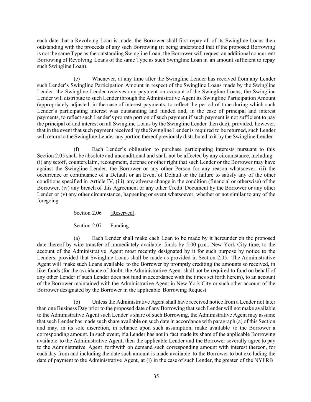 35 each date that a Revolving Loan is made, the Borrower shall first repay all of its Swingline Loans then outstanding with the proceeds of any such Borrowing (it being understood that if the proposed Borrowing is not the same Type as the outstanding Swingline Loan, the Borrower will request an additional concurrent Borrowing of Revolving Loans of the same Type as such Swingline Loan in an amount sufficient to repay such Swingline Loan). (e) Whenever, at any time after the Swingline Lender has received from any Lender such Lender’s Swingline Participation Amount in respect of the Swingline Loans made by the Swingline Lender, the Swingline Lender receives any payment on account of the Swingline Loans, the Swingline Lender will distribute to such Lender through the Administrative Agent its Swingline Participation Amount (appropriately adjusted, in the case of interest payments, to reflect the period of time during which such Lender’s participating interest was outstanding and funded and, in the case of principal and interest payments, to reflect such Lender’s pro rata portion of such payment if such payment is not sufficient to pay the principal of and interest on all Swingline Loans by the Swingline Lender then due); provided, however, that in the event that such payment received by the Swingline Lender is required to be returned, such Lender will return to the Swingline Lender any portion thereof previously distributed to it by the Swingline Lender. (f) Each Lender’s obligation to purchase participating interests pursuant to this Section 2.05 shall be absolute and unconditional and shall not be affected by any circumstance, including (i) any setoff, counterclaim, recoupment, defense or other right that such Lender or the Borrower may have against the Swingline Lender, the Borrower or any other Person for any reason whatsoever, (ii) the occurrence or continuance of a Default or an Event of Default or the failure to satisfy any of the other conditions specified in Article IV, (iii) any adverse change in the condition (financial or otherwise) of the Borrower, (iv) any breach of this Agreement or any other Credit Document by the Borrower or any other Lender or (v) any other circumstance, happening or event whatsoever, whether or not similar to any of the foregoing. Section 2.06 [Reserved]. Section 2.07 Funding. (a) Each Lender shall make each Loan to be made by it hereunder on the proposed date thereof by wire transfer of immediately available funds by 5:00 p.m., New York City time, to the account of the Administrative Agent most recently designated by it for such purpose by notice to the Lenders; provided that Swingline Loans shall be made as provided in Section 2.05. The Administrative Agent will make such Loans available to the Borrower by promptly crediting the amounts so received, in like funds (for the avoidance of doubt, the Administrative Agent shall not be required to fund on behalf of any other Lender if such Lender does not fund in accordance with the times set forth herein), to an account of the Borrower maintained with the Administrative Agent in New York City or such other account of the Borrower designated by the Borrower in the applicable Borrowing Request. (b) Unless the Administrative Agent shall have received notice from a Lender not later than one Business Day prior to the proposed date of any Borrowing that such Lender will not make available to the Administrative Agent such Lender’s share of such Borrowing, the Administrative Agent may assume that such Lender has made such share available on such date in accordance with paragraph (a) of this Section and may, in its sole discretion, in reliance upon such assumption, make available to the Borrower a corresponding amount. In such event, if a Lender has not in fact made its share of the applicable Borrowing available to the Administrative Agent, then the applicable Lender and the Borrower severally agree to pay to the Administrative Agent forthwith on demand such corresponding amount with interest thereon, for each day from and including the date such amount is made available to the Borrower to but exc luding the date of payment to the Administrative Agent, at (i) in the case of such Lender, the greater of the NYFRB