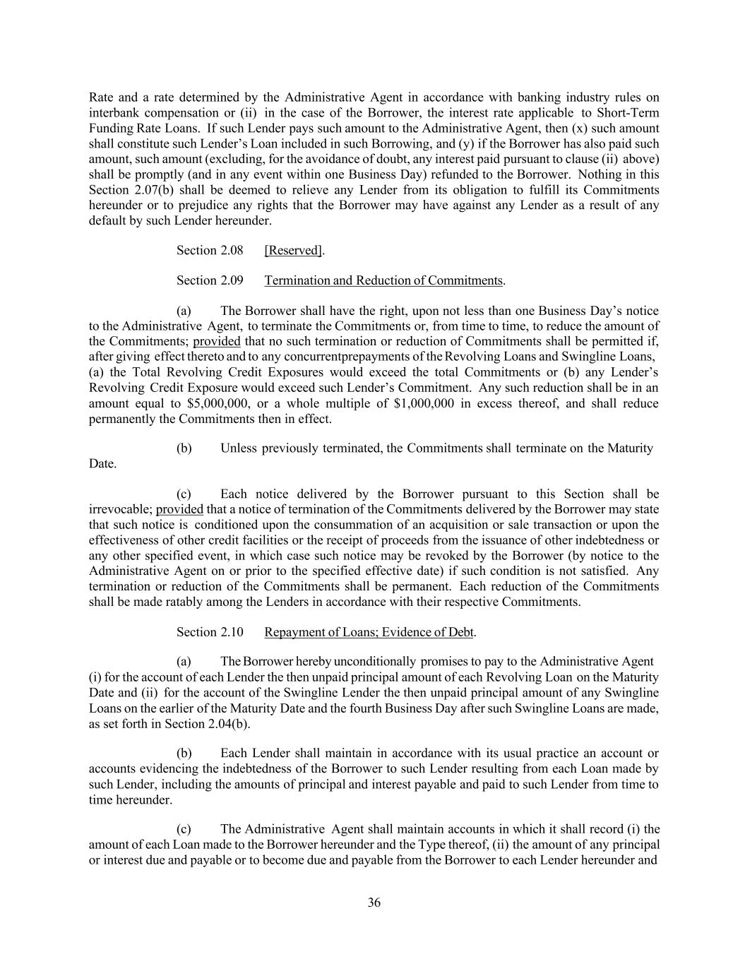 36 Rate and a rate determined by the Administrative Agent in accordance with banking industry rules on interbank compensation or (ii) in the case of the Borrower, the interest rate applicable to Short-Term Funding Rate Loans. If such Lender pays such amount to the Administrative Agent, then (x) such amount shall constitute such Lender’s Loan included in such Borrowing, and (y) if the Borrower has also paid such amount, such amount (excluding, for the avoidance of doubt, any interest paid pursuant to clause (ii) above) shall be promptly (and in any event within one Business Day) refunded to the Borrower. Nothing in this Section 2.07(b) shall be deemed to relieve any Lender from its obligation to fulfill its Commitments hereunder or to prejudice any rights that the Borrower may have against any Lender as a result of any default by such Lender hereunder. Section 2.08 [Reserved]. Section 2.09 Termination and Reduction of Commitments. (a) The Borrower shall have the right, upon not less than one Business Day’s notice to the Administrative Agent, to terminate the Commitments or, from time to time, to reduce the amount of the Commitments; provided that no such termination or reduction of Commitments shall be permitted if, after giving effect thereto and to any concurrentprepayments of the Revolving Loans and Swingline Loans, (a) the Total Revolving Credit Exposures would exceed the total Commitments or (b) any Lender’s Revolving Credit Exposure would exceed such Lender’s Commitment. Any such reduction shall be in an amount equal to $5,000,000, or a whole multiple of $1,000,000 in excess thereof, and shall reduce permanently the Commitments then in effect. (b) Unless previously terminated, the Commitments shall terminate on the Maturity Date. (c) Each notice delivered by the Borrower pursuant to this Section shall be irrevocable; provided that a notice of termination of the Commitments delivered by the Borrower may state that such notice is conditioned upon the consummation of an acquisition or sale transaction or upon the effectiveness of other credit facilities or the receipt of proceeds from the issuance of other indebtedness or any other specified event, in which case such notice may be revoked by the Borrower (by notice to the Administrative Agent on or prior to the specified effective date) if such condition is not satisfied. Any termination or reduction of the Commitments shall be permanent. Each reduction of the Commitments shall be made ratably among the Lenders in accordance with their respective Commitments. Section 2.10 Repayment of Loans; Evidence of Debt. (a) The Borrower hereby unconditionally promises to pay to the Administrative Agent (i) for the account of each Lender the then unpaid principal amount of each Revolving Loan on the Maturity Date and (ii) for the account of the Swingline Lender the then unpaid principal amount of any Swingline Loans on the earlier of the Maturity Date and the fourth Business Day after such Swingline Loans are made, as set forth in Section 2.04(b). (b) Each Lender shall maintain in accordance with its usual practice an account or accounts evidencing the indebtedness of the Borrower to such Lender resulting from each Loan made by such Lender, including the amounts of principal and interest payable and paid to such Lender from time to time hereunder. (c) The Administrative Agent shall maintain accounts in which it shall record (i) the amount of each Loan made to the Borrower hereunder and the Type thereof, (ii) the amount of any principal or interest due and payable or to become due and payable from the Borrower to each Lender hereunder and