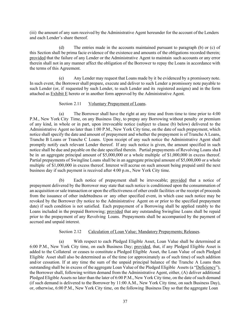 37 (iii) the amount of any sum received by the Administrative Agent hereunder for the account of the Lenders and each Lender’s share thereof. (d) The entries made in the accounts maintained pursuant to paragraph (b) or (c) of this Section shall be prima facie evidence of the existence and amounts of the obligations recorded therein; provided that the failure of any Lender or the Administrative Agent to maintain such accounts or any error therein shall not in any manner affect the obligation of the Borrower to repay the Loans in accordance with the terms of this Agreement. (e) Any Lender may request that Loans made by it be evidenced by a promissory note. In such event, the Borrower shall prepare, execute and deliver to such Lender a promissory note payable to such Lender (or, if requested by such Lender, to such Lender and its registered assigns) and in the form attached as Exhibit E hereto or in another form approved by the Administrative Agent. Section 2.11 Voluntary Prepayment of Loans. (a) The Borrower shall have the right at any time and from time to time prior to 4:00 P.M., New York City Time, on any Business Day, to prepay any Borrowing without penalty or premium of any kind, in whole or in part, upon irrevocable notice (subject to clause (b) below) delivered to the Administrative Agent no later than 1:00 P.M., New York City time, on the date of such prepayment, which notice shall specify the date and amount of prepayment and whether the prepayment is of Tranche A Loans, Tranche B Loans or Tranche C Loans. Upon receipt of any such notice the Administrative Agent shall promptly notify each relevant Lender thereof. If any such notice is given, the amount specified in such notice shall be due and payable on the date specified therein. Partial prepayments of Revolving Loans sha l be in an aggregate principal amount of $5,000,000 or a whole multiple of $1,000,000 in excess thereof. Partial prepayments of Swingline Loans shall be in an aggregate principal amount of $5,000,000 or a whole multiple of $1,000,000 in excess thereof. Interest will accrue on such amount being prepaid until the next business day if such payment is received after 4:00 p.m., New York City time. (b) Each notice of prepayment shall be irrevocable; provided that a notice of prepayment delivered by the Borrower may state that such notice is conditioned upon the consummation of an acquisition or sale transaction or upon the effectiveness of other credit facilities or the receipt of proceeds from the issuance of other indebtedness or any other specified event, in which case such notice may be revoked by the Borrower (by notice to the Administrative Agent on or prior to the specified prepayment date) if such condition is not satisfied. Each prepayment of a Borrowing shall be applied ratably to the Loans included in the prepaid Borrowing; provided that any outstanding Swingline Loans shall be repaid prior to the prepayment of any Revolving Loans. Prepayments shall be accompanied by the payment of accrued and unpaid interest. Section 2.12 Calculation of Loan Value; Mandatory Prepayments; Releases. (a) With respect to each Pledged Eligible Asset, Loan Value shall be determined at 6:00 P.M., New York City time, on each Business Day; provided, that, if any Pledged Eligible Asset is added to the Collateral or ceases to constitute a Pledged Eligible Asset, the Loan Value of each Pledged Eligible Asset shall also be determined as of the time (or approximately as of such time) of such addition and/or cessation. If at any time the sum of the unpaid principal balance of the Tranche A Loans then outstanding shall be in excess of the aggregate Loan Value of the Pledged Eligible Assets (a “Deficiency”), the Borrower shall, following written demand from the Administrative Agent, either, (A) deliver additional Pledged Eligible Assets no later than the later of 6:00 P.M., New York City time, on the date of such demand (if such demand is delivered to the Borrower by 11:00 A.M., New York City time, on such Business Day), or, otherwise, 6:00 P.M., New York City time, on the following Business Day so that the aggregate Loan