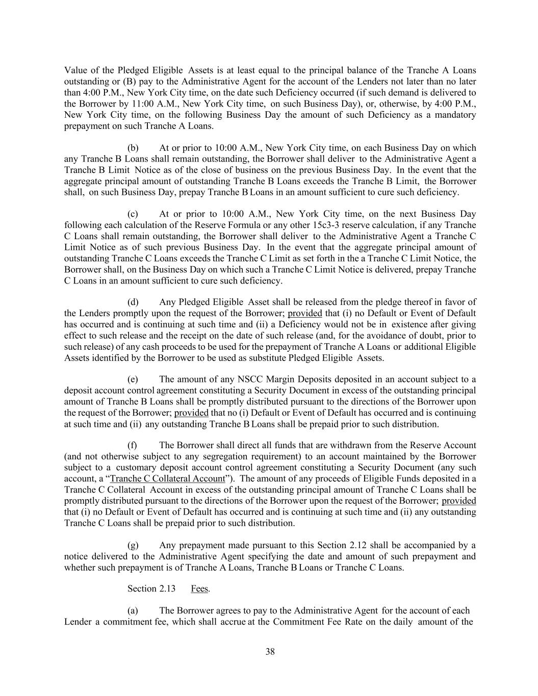 38 Value of the Pledged Eligible Assets is at least equal to the principal balance of the Tranche A Loans outstanding or (B) pay to the Administrative Agent for the account of the Lenders not later than no later than 4:00 P.M., New York City time, on the date such Deficiency occurred (if such demand is delivered to the Borrower by 11:00 A.M., New York City time, on such Business Day), or, otherwise, by 4:00 P.M., New York City time, on the following Business Day the amount of such Deficiency as a mandatory prepayment on such Tranche A Loans. (b) At or prior to 10:00 A.M., New York City time, on each Business Day on which any Tranche B Loans shall remain outstanding, the Borrower shall deliver to the Administrative Agent a Tranche B Limit Notice as of the close of business on the previous Business Day. In the event that the aggregate principal amount of outstanding Tranche B Loans exceeds the Tranche B Limit, the Borrower shall, on such Business Day, prepay Tranche B Loans in an amount sufficient to cure such deficiency. (c) At or prior to 10:00 A.M., New York City time, on the next Business Day following each calculation of the Reserve Formula or any other 15c3-3 reserve calculation, if any Tranche C Loans shall remain outstanding, the Borrower shall deliver to the Administrative Agent a Tranche C Limit Notice as of such previous Business Day. In the event that the aggregate principal amount of outstanding Tranche C Loans exceeds the Tranche C Limit as set forth in the a Tranche C Limit Notice, the Borrower shall, on the Business Day on which such a Tranche C Limit Notice is delivered, prepay Tranche C Loans in an amount sufficient to cure such deficiency. (d) Any Pledged Eligible Asset shall be released from the pledge thereof in favor of the Lenders promptly upon the request of the Borrower; provided that (i) no Default or Event of Default has occurred and is continuing at such time and (ii) a Deficiency would not be in existence after giving effect to such release and the receipt on the date of such release (and, for the avoidance of doubt, prior to such release) of any cash proceeds to be used for the prepayment of Tranche A Loans or additional Eligible Assets identified by the Borrower to be used as substitute Pledged Eligible Assets. (e) The amount of any NSCC Margin Deposits deposited in an account subject to a deposit account control agreement constituting a Security Document in excess of the outstanding principal amount of Tranche B Loans shall be promptly distributed pursuant to the directions of the Borrower upon the request of the Borrower; provided that no (i) Default or Event of Default has occurred and is continuing at such time and (ii) any outstanding Tranche B Loans shall be prepaid prior to such distribution. (f) The Borrower shall direct all funds that are withdrawn from the Reserve Account (and not otherwise subject to any segregation requirement) to an account maintained by the Borrower subject to a customary deposit account control agreement constituting a Security Document (any such account, a “Tranche C Collateral Account”). The amount of any proceeds of Eligible Funds deposited in a Tranche C Collateral Account in excess of the outstanding principal amount of Tranche C Loans shall be promptly distributed pursuant to the directions of the Borrower upon the request of the Borrower; provided that (i) no Default or Event of Default has occurred and is continuing at such time and (ii) any outstanding Tranche C Loans shall be prepaid prior to such distribution. (g) Any prepayment made pursuant to this Section 2.12 shall be accompanied by a notice delivered to the Administrative Agent specifying the date and amount of such prepayment and whether such prepayment is of Tranche A Loans, Tranche B Loans or Tranche C Loans. Section 2.13 Fees. (a) The Borrower agrees to pay to the Administrative Agent for the account of each Lender a commitment fee, which shall accrue at the Commitment Fee Rate on the daily amount of the