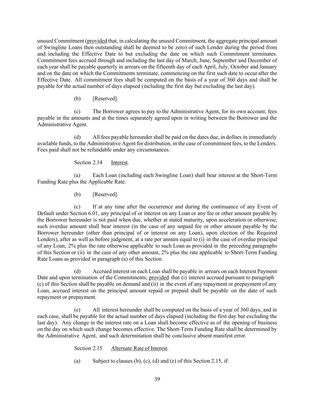 39 unused Commitment (provided that, in calculating the unused Commitment, the aggregate principal amount of Swingline Loans then outstanding shall be deemed to be zero) of such Lender during the period from and including the Effective Date to but excluding the date on which such Commitment terminates. Commitment fees accrued through and including the last day of March, June, September and December of each year shall be payable quarterly in arrears on the fifteenth day of each April, July, October and January and on the date on which the Commitments terminate, commencing on the first such date to occur after the Effective Date. All commitment fees shall be computed on the basis of a year of 360 days and shall be payable for the actual number of days elapsed (including the first day but excluding the last day). (b) [Reserved]. (c) The Borrower agrees to pay to the Administrative Agent, for its own account, fees payable in the amounts and at the times separately agreed upon in writing between the Borrower and the Administrative Agent. (d) All fees payable hereunder shall be paid on the dates due, in dollars in immediately available funds, to the Administrative Agent for distribution, in the case of commitment fees, to the Lenders. Fees paid shall not be refundable under any circumstances. Section 2.14 Interest. (a) Each Loan (including each Swingline Loan) shall bear interest at the Short-Term Funding Rate plus the Applicable Rate. (b) [Reserved]. (c) If at any time after the occurrence and during the continuance of any Event of Default under Section 6.01, any principal of or interest on any Loan or any fee or other amount payable by the Borrower hereunder is not paid when due, whether at stated maturity, upon acceleration or otherwise, such overdue amount shall bear interest (in the case of any unpaid fee or other amount payable by the Borrower hereunder (other than principal of or interest on any Loan), upon election of the Required Lenders), after as well as before judgment, at a rate per annum equal to (i) in the case of overdue principal of any Loan, 2% plus the rate otherwise applicable to such Loan as provided in the preceding paragraphs of this Section or (ii) in the case of any other amount, 2% plus the rate applicable to Short-Term Funding Rate Loans as provided in paragraph (a) of this Section. (d) Accrued interest on each Loan shall be payable in arrears on each Interest Payment Date and upon termination of the Commitments; provided that (i) interest accrued pursuant to paragraph (c) of this Section shall be payable on demand and (ii) in the event of any repayment or prepayment of any Loan, accrued interest on the principal amount repaid or prepaid shall be payable on the date of such repayment or prepayment. (e) All interest hereunder shall be computed on the basis of a year of 360 days, and in each case, shall be payable for the actual number of days elapsed (including the first day but excluding the last day). Any change in the interest rate on a Loan shall become effective as of the opening of business on the day on which such change becomes effective. The Short-Term Funding Rate shall be determined by the Administrative Agent, and such determination shall be conclusive absent manifest error. Section 2.15 Alternate Rate of Interest. (a) Subject to clauses (b), (c), (d) and (e) of this Section 2.15, if: