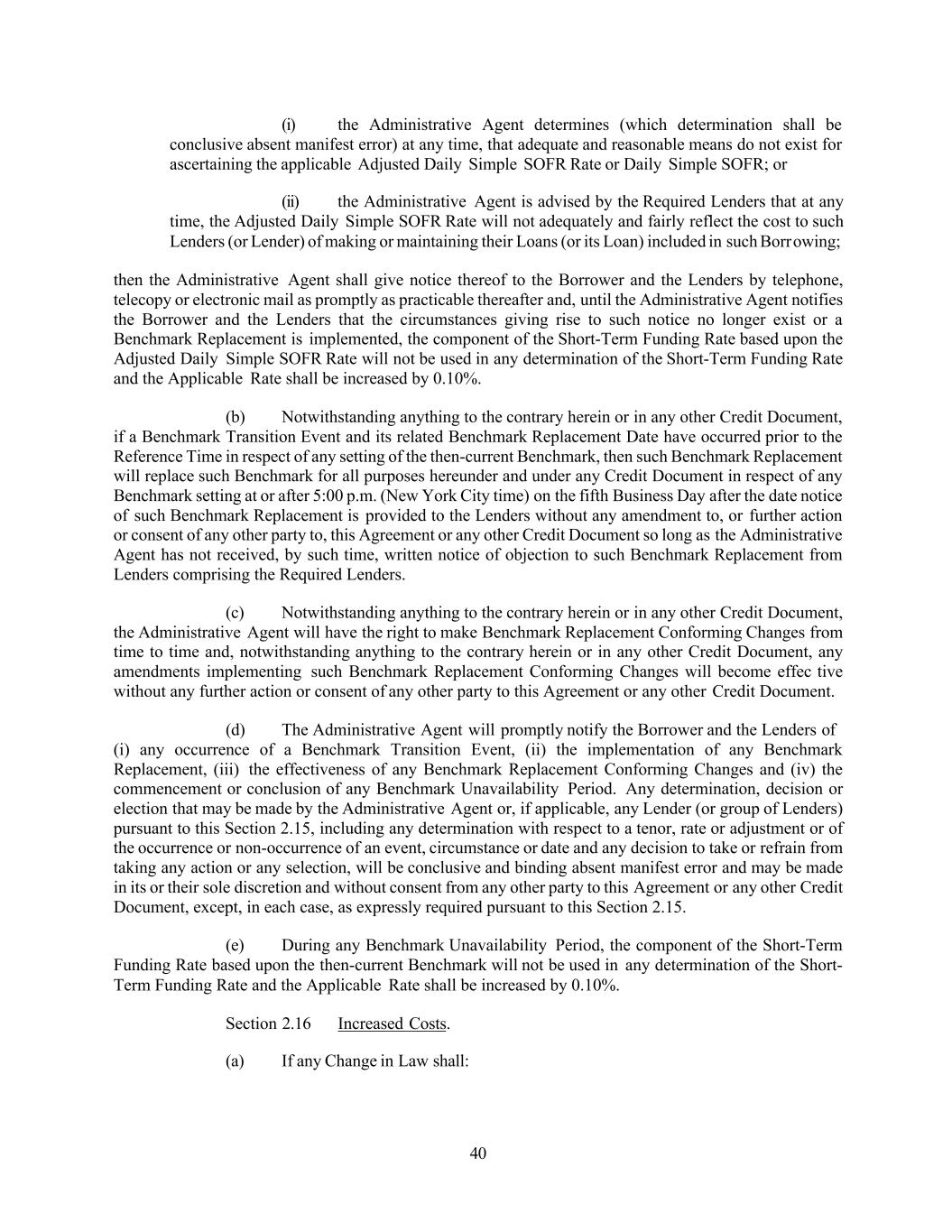 40 (i) the Administrative Agent determines (which determination shall be conclusive absent manifest error) at any time, that adequate and reasonable means do not exist for ascertaining the applicable Adjusted Daily Simple SOFR Rate or Daily Simple SOFR; or (ii) the Administrative Agent is advised by the Required Lenders that at any time, the Adjusted Daily Simple SOFR Rate will not adequately and fairly reflect the cost to such Lenders (or Lender) of making or maintaining their Loans (or its Loan) included in such Borr owing; then the Administrative Agent shall give notice thereof to the Borrower and the Lenders by telephone, telecopy or electronic mail as promptly as practicable thereafter and, until the Administrative Agent notifies the Borrower and the Lenders that the circumstances giving rise to such notice no longer exist or a Benchmark Replacement is implemented, the component of the Short-Term Funding Rate based upon the Adjusted Daily Simple SOFR Rate will not be used in any determination of the Short-Term Funding Rate and the Applicable Rate shall be increased by 0.10%. (b) Notwithstanding anything to the contrary herein or in any other Credit Document, if a Benchmark Transition Event and its related Benchmark Replacement Date have occurred prior to the Reference Time in respect of any setting of the then-current Benchmark, then such Benchmark Replacement will replace such Benchmark for all purposes hereunder and under any Credit Document in respect of any Benchmark setting at or after 5:00 p.m. (New York City time) on the fifth Business Day after the date notice of such Benchmark Replacement is provided to the Lenders without any amendment to, or further action or consent of any other party to, this Agreement or any other Credit Document so long as the Administrative Agent has not received, by such time, written notice of objection to such Benchmark Replacement from Lenders comprising the Required Lenders. (c) Notwithstanding anything to the contrary herein or in any other Credit Document, the Administrative Agent will have the right to make Benchmark Replacement Conforming Changes from time to time and, notwithstanding anything to the contrary herein or in any other Credit Document, any amendments implementing such Benchmark Replacement Conforming Changes will become effec tive without any further action or consent of any other party to this Agreement or any other Credit Document. (d) The Administrative Agent will promptly notify the Borrower and the Lenders of (i) any occurrence of a Benchmark Transition Event, (ii) the implementation of any Benchmark Replacement, (iii) the effectiveness of any Benchmark Replacement Conforming Changes and (iv) the commencement or conclusion of any Benchmark Unavailability Period. Any determination, decision or election that may be made by the Administrative Agent or, if applicable, any Lender (or group of Lenders) pursuant to this Section 2.15, including any determination with respect to a tenor, rate or adjustment or of the occurrence or non-occurrence of an event, circumstance or date and any decision to take or refrain from taking any action or any selection, will be conclusive and binding absent manifest error and may be made in its or their sole discretion and without consent from any other party to this Agreement or any other Credit Document, except, in each case, as expressly required pursuant to this Section 2.15. (e) During any Benchmark Unavailability Period, the component of the Short-Term Funding Rate based upon the then-current Benchmark will not be used in any determination of the Short- Term Funding Rate and the Applicable Rate shall be increased by 0.10%. Section 2.16 Increased Costs. (a) If any Change in Law shall: