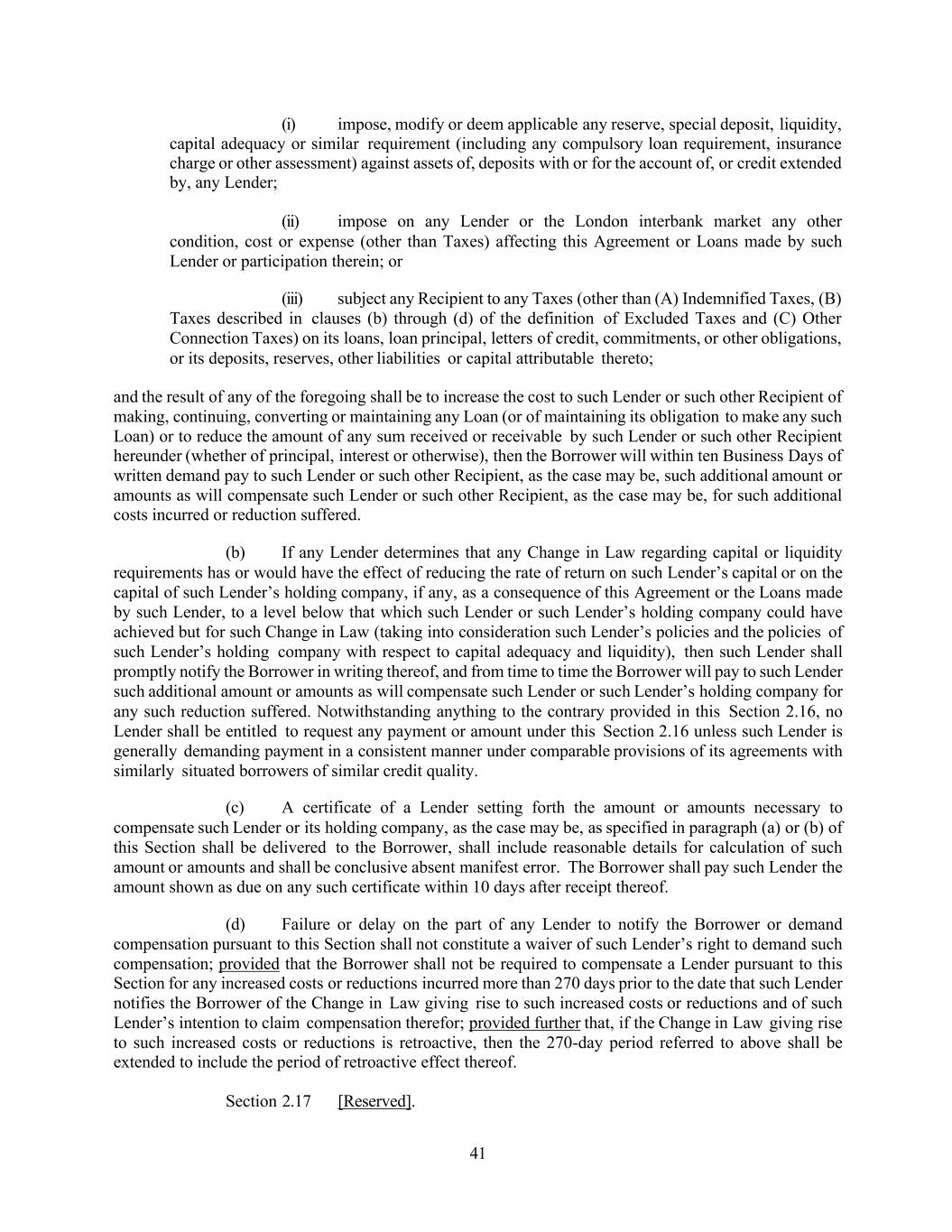 41 (i) impose, modify or deem applicable any reserve, special deposit, liquidity, capital adequacy or similar requirement (including any compulsory loan requirement, insurance charge or other assessment) against assets of, deposits with or for the account of, or credit extended by, any Lender; (ii) impose on any Lender or the London interbank market any other condition, cost or expense (other than Taxes) affecting this Agreement or Loans made by such Lender or participation therein; or (iii) subject any Recipient to any Taxes (other than (A) Indemnified Taxes, (B) Taxes described in clauses (b) through (d) of the definition of Excluded Taxes and (C) Other Connection Taxes) on its loans, loan principal, letters of credit, commitments, or other obligations, or its deposits, reserves, other liabilities or capital attributable thereto; and the result of any of the foregoing shall be to increase the cost to such Lender or such other Recipient of making, continuing, converting or maintaining any Loan (or of maintaining its obligation to make any such Loan) or to reduce the amount of any sum received or receivable by such Lender or such other Recipient hereunder (whether of principal, interest or otherwise), then the Borrower will within ten Business Days of written demand pay to such Lender or such other Recipient, as the case may be, such additional amount or amounts as will compensate such Lender or such other Recipient, as the case may be, for such additional costs incurred or reduction suffered. (b) If any Lender determines that any Change in Law regarding capital or liquidity requirements has or would have the effect of reducing the rate of return on such Lender’s capital or on the capital of such Lender’s holding company, if any, as a consequence of this Agreement or the Loans made by such Lender, to a level below that which such Lender or such Lender’s holding company could have achieved but for such Change in Law (taking into consideration such Lender’s policies and the policies of such Lender’s holding company with respect to capital adequacy and liquidity), then such Lender shall promptly notify the Borrower in writing thereof, and from time to time the Borrower will pay to such Lender such additional amount or amounts as will compensate such Lender or such Lender’s holding company for any such reduction suffered. Notwithstanding anything to the contrary provided in this Section 2.16, no Lender shall be entitled to request any payment or amount under this Section 2.16 unless such Lender is generally demanding payment in a consistent manner under comparable provisions of its agreements with similarly situated borrowers of similar credit quality. (c) A certificate of a Lender setting forth the amount or amounts necessary to compensate such Lender or its holding company, as the case may be, as specified in paragraph (a) or (b) of this Section shall be delivered to the Borrower, shall include reasonable details for calculation of such amount or amounts and shall be conclusive absent manifest error. The Borrower shall pay such Lender the amount shown as due on any such certificate within 10 days after receipt thereof. (d) Failure or delay on the part of any Lender to notify the Borrower or demand compensation pursuant to this Section shall not constitute a waiver of such Lender’s right to demand such compensation; provided that the Borrower shall not be required to compensate a Lender pursuant to this Section for any increased costs or reductions incurred more than 270 days prior to the date that such Lender notifies the Borrower of the Change in Law giving rise to such increased costs or reductions and of such Lender’s intention to claim compensation therefor; provided further that, if the Change in Law giving rise to such increased costs or reductions is retroactive, then the 270-day period referred to above shall be extended to include the period of retroactive effect thereof. Section 2.17 [Reserved].