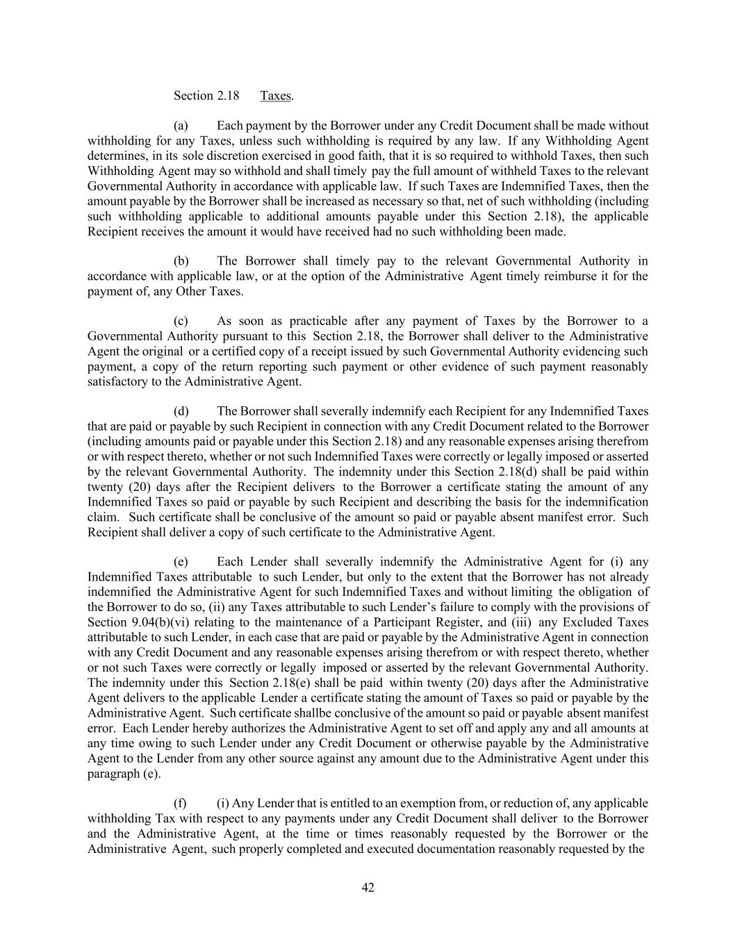 42 Section 2.18 Taxes. (a) Each payment by the Borrower under any Credit Document shall be made without withholding for any Taxes, unless such withholding is required by any law. If any Withholding Agent determines, in its sole discretion exercised in good faith, that it is so required to withhold Taxes, then such Withholding Agent may so withhold and shall timely pay the full amount of withheld Taxes to the relevant Governmental Authority in accordance with applicable law. If such Taxes are Indemnified Taxes, then the amount payable by the Borrower shall be increased as necessary so that, net of such withholding (including such withholding applicable to additional amounts payable under this Section 2.18), the applicable Recipient receives the amount it would have received had no such withholding been made. (b) The Borrower shall timely pay to the relevant Governmental Authority in accordance with applicable law, or at the option of the Administrative Agent timely reimburse it for the payment of, any Other Taxes. (c) As soon as practicable after any payment of Taxes by the Borrower to a Governmental Authority pursuant to this Section 2.18, the Borrower shall deliver to the Administrative Agent the original or a certified copy of a receipt issued by such Governmental Authority evidencing such payment, a copy of the return reporting such payment or other evidence of such payment reasonably satisfactory to the Administrative Agent. (d) The Borrower shall severally indemnify each Recipient for any Indemnified Taxes that are paid or payable by such Recipient in connection with any Credit Document related to the Borrower (including amounts paid or payable under this Section 2.18) and any reasonable expenses arising therefrom or with respect thereto, whether or not such Indemnified Taxes were correctly or legally imposed or asserted by the relevant Governmental Authority. The indemnity under this Section 2.18(d) shall be paid within twenty (20) days after the Recipient delivers to the Borrower a certificate stating the amount of any Indemnified Taxes so paid or payable by such Recipient and describing the basis for the indemnification claim. Such certificate shall be conclusive of the amount so paid or payable absent manifest error. Such Recipient shall deliver a copy of such certificate to the Administrative Agent. (e) Each Lender shall severally indemnify the Administrative Agent for (i) any Indemnified Taxes attributable to such Lender, but only to the extent that the Borrower has not already indemnified the Administrative Agent for such Indemnified Taxes and without limiting the obligation of the Borrower to do so, (ii) any Taxes attributable to such Lender’s failure to comply with the provisions of Section 9.04(b)(vi) relating to the maintenance of a Participant Register, and (iii) any Excluded Taxes attributable to such Lender, in each case that are paid or payable by the Administrative Agent in connection with any Credit Document and any reasonable expenses arising therefrom or with respect thereto, whether or not such Taxes were correctly or legally imposed or asserted by the relevant Governmental Authority. The indemnity under this Section 2.18(e) shall be paid within twenty (20) days after the Administrative Agent delivers to the applicable Lender a certificate stating the amount of Taxes so paid or payable by the Administrative Agent. Such certificate shallbe conclusive of the amount so paid or payable absent manifest error. Each Lender hereby authorizes the Administrative Agent to set off and apply any and all amounts at any time owing to such Lender under any Credit Document or otherwise payable by the Administrative Agent to the Lender from any other source against any amount due to the Administrative Agent under this paragraph (e). (f) (i) Any Lender that is entitled to an exemption from, or reduction of, any applicable withholding Tax with respect to any payments under any Credit Document shall deliver to the Borrower and the Administrative Agent, at the time or times reasonably requested by the Borrower or the Administrative Agent, such properly completed and executed documentation reasonably requested by the