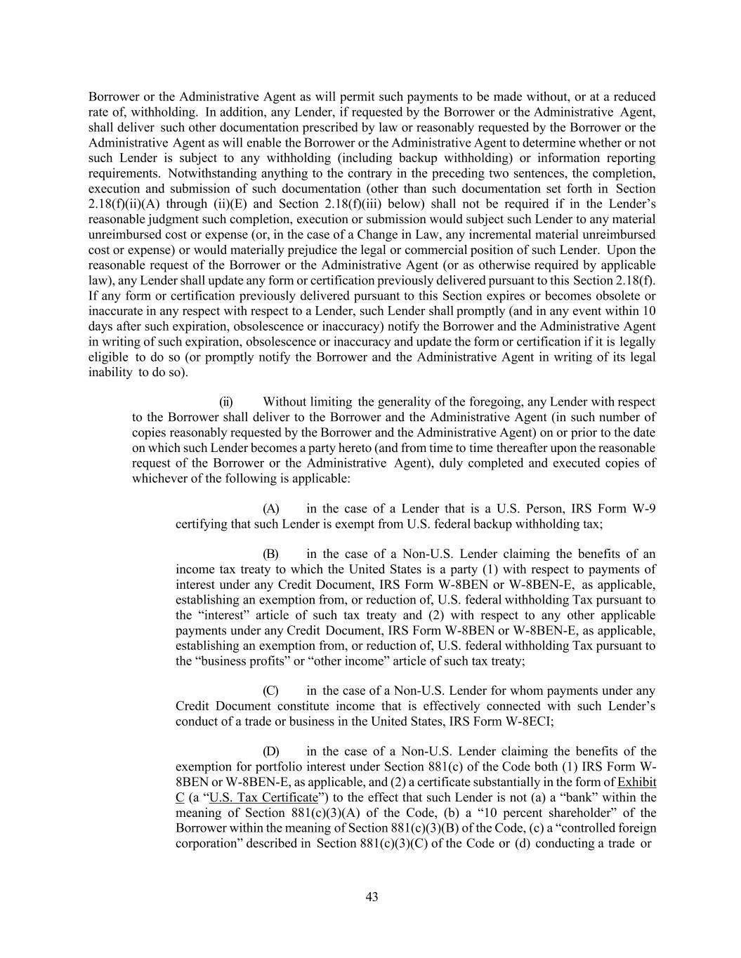 43 Borrower or the Administrative Agent as will permit such payments to be made without, or at a reduced rate of, withholding. In addition, any Lender, if requested by the Borrower or the Administrative Agent, shall deliver such other documentation prescribed by law or reasonably requested by the Borrower or the Administrative Agent as will enable the Borrower or the Administrative Agent to determine whether or not such Lender is subject to any withholding (including backup withholding) or information reporting requirements. Notwithstanding anything to the contrary in the preceding two sentences, the completion, execution and submission of such documentation (other than such documentation set forth in Section 2.18(f)(ii)(A) through (ii)(E) and Section 2.18(f)(iii) below) shall not be required if in the Lender’s reasonable judgment such completion, execution or submission would subject such Lender to any material unreimbursed cost or expense (or, in the case of a Change in Law, any incremental material unreimbursed cost or expense) or would materially prejudice the legal or commercial position of such Lender. Upon the reasonable request of the Borrower or the Administrative Agent (or as otherwise required by applicable law), any Lender shall update any form or certification previously delivered pursuant to this Section 2.18(f). If any form or certification previously delivered pursuant to this Section expires or becomes obsolete or inaccurate in any respect with respect to a Lender, such Lender shall promptly (and in any event within 10 days after such expiration, obsolescence or inaccuracy) notify the Borrower and the Administrative Agent in writing of such expiration, obsolescence or inaccuracy and update the form or certification if it is legally eligible to do so (or promptly notify the Borrower and the Administrative Agent in writing of its legal inability to do so). (ii) Without limiting the generality of the foregoing, any Lender with respect to the Borrower shall deliver to the Borrower and the Administrative Agent (in such number of copies reasonably requested by the Borrower and the Administrative Agent) on or prior to the date on which such Lender becomes a party hereto (and from time to time thereafter upon the reasonable request of the Borrower or the Administrative Agent), duly completed and executed copies of whichever of the following is applicable: (A) in the case of a Lender that is a U.S. Person, IRS Form W-9 certifying that such Lender is exempt from U.S. federal backup withholding tax; (B) in the case of a Non-U.S. Lender claiming the benefits of an income tax treaty to which the United States is a party (1) with respect to payments of interest under any Credit Document, IRS Form W-8BEN or W-8BEN-E, as applicable, establishing an exemption from, or reduction of, U.S. federal withholding Tax pursuant to the “interest” article of such tax treaty and (2) with respect to any other applicable payments under any Credit Document, IRS Form W-8BEN or W-8BEN-E, as applicable, establishing an exemption from, or reduction of, U.S. federal withholding Tax pursuant to the “business profits” or “other income” article of such tax treaty; (C) in the case of a Non-U.S. Lender for whom payments under any Credit Document constitute income that is effectively connected with such Lender’s conduct of a trade or business in the United States, IRS Form W-8ECI; (D) in the case of a Non-U.S. Lender claiming the benefits of the exemption for portfolio interest under Section 881(c) of the Code both (1) IRS Form W- 8BEN or W-8BEN-E, as applicable, and (2) a certificate substantially in the form of Exhibit C (a “U.S. Tax Certificate”) to the effect that such Lender is not (a) a “bank” within the meaning of Section 881(c)(3)(A) of the Code, (b) a “10 percent shareholder” of the Borrower within the meaning of Section 881(c)(3)(B) of the Code, (c) a “controlled foreign corporation” described in Section 881(c)(3)(C) of the Code or (d) conducting a trade or