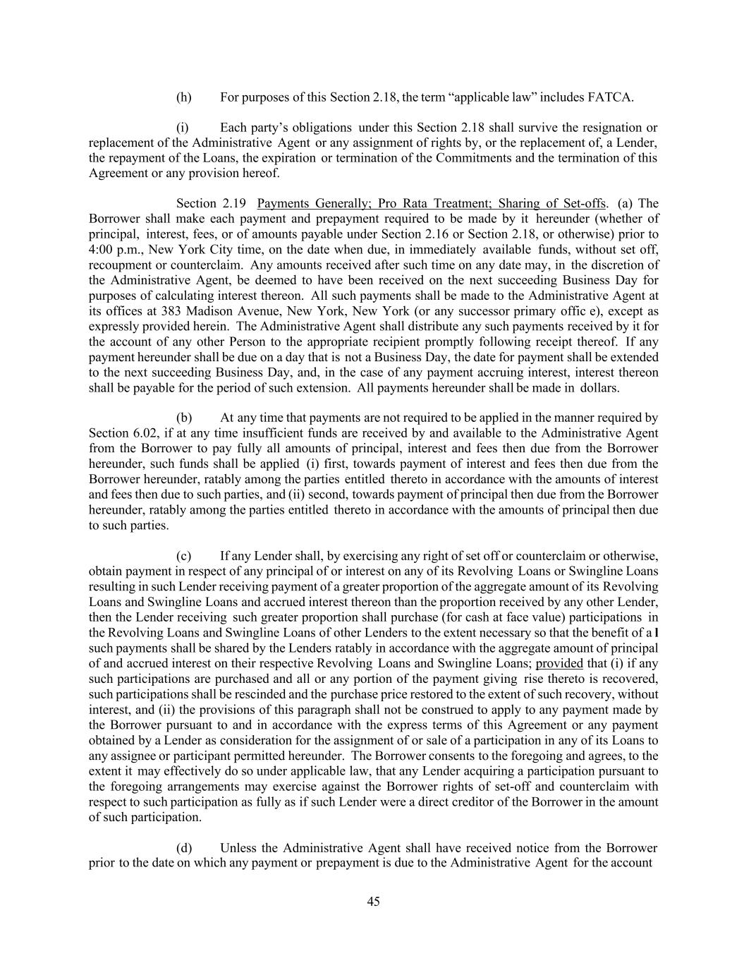 45 (h) For purposes of this Section 2.18, the term “applicable law” includes FATCA. (i) Each party’s obligations under this Section 2.18 shall survive the resignation or replacement of the Administrative Agent or any assignment of rights by, or the replacement of, a Lender, the repayment of the Loans, the expiration or termination of the Commitments and the termination of this Agreement or any provision hereof. Section 2.19 Payments Generally; Pro Rata Treatment; Sharing of Set-offs. (a) The Borrower shall make each payment and prepayment required to be made by it hereunder (whether of principal, interest, fees, or of amounts payable under Section 2.16 or Section 2.18, or otherwise) prior to 4:00 p.m., New York City time, on the date when due, in immediately available funds, without set off, recoupment or counterclaim. Any amounts received after such time on any date may, in the discretion of the Administrative Agent, be deemed to have been received on the next succeeding Business Day for purposes of calculating interest thereon. All such payments shall be made to the Administrative Agent at its offices at 383 Madison Avenue, New York, New York (or any successor primary offic e), except as expressly provided herein. The Administrative Agent shall distribute any such payments received by it for the account of any other Person to the appropriate recipient promptly following receipt thereof. If any payment hereunder shall be due on a day that is not a Business Day, the date for payment shall be extended to the next succeeding Business Day, and, in the case of any payment accruing interest, interest thereon shall be payable for the period of such extension. All payments hereunder shall be made in dollars. (b) At any time that payments are not required to be applied in the manner required by Section 6.02, if at any time insufficient funds are received by and available to the Administrative Agent from the Borrower to pay fully all amounts of principal, interest and fees then due from the Borrower hereunder, such funds shall be applied (i) first, towards payment of interest and fees then due from the Borrower hereunder, ratably among the parties entitled thereto in accordance with the amounts of interest and fees then due to such parties, and (ii) second, towards payment of principal then due from the Borrower hereunder, ratably among the parties entitled thereto in accordance with the amounts of principal then due to such parties. (c) If any Lender shall, by exercising any right of set off or counterclaim or otherwise, obtain payment in respect of any principal of or interest on any of its Revolving Loans or Swingline Loans resulting in such Lender receiving payment of a greater proportion of the aggregate amount of its Revolving Loans and Swingline Loans and accrued interest thereon than the proportion received by any other Lender, then the Lender receiving such greater proportion shall purchase (for cash at face value) participations in the Revolving Loans and Swingline Loans of other Lenders to the extent necessary so that the benefit of a l such payments shall be shared by the Lenders ratably in accordance with the aggregate amount of principal of and accrued interest on their respective Revolving Loans and Swingline Loans; provided that (i) if any such participations are purchased and all or any portion of the payment giving rise thereto is recovered, such participations shall be rescinded and the purchase price restored to the extent of such recovery, without interest, and (ii) the provisions of this paragraph shall not be construed to apply to any payment made by the Borrower pursuant to and in accordance with the express terms of this Agreement or any payment obtained by a Lender as consideration for the assignment of or sale of a participation in any of its Loans to any assignee or participant permitted hereunder. The Borrower consents to the foregoing and agrees, to the extent it may effectively do so under applicable law, that any Lender acquiring a participation pursuant to the foregoing arrangements may exercise against the Borrower rights of set-off and counterclaim with respect to such participation as fully as if such Lender were a direct creditor of the Borrower in the amount of such participation. (d) Unless the Administrative Agent shall have received notice from the Borrower prior to the date on which any payment or prepayment is due to the Administrative Agent for the account