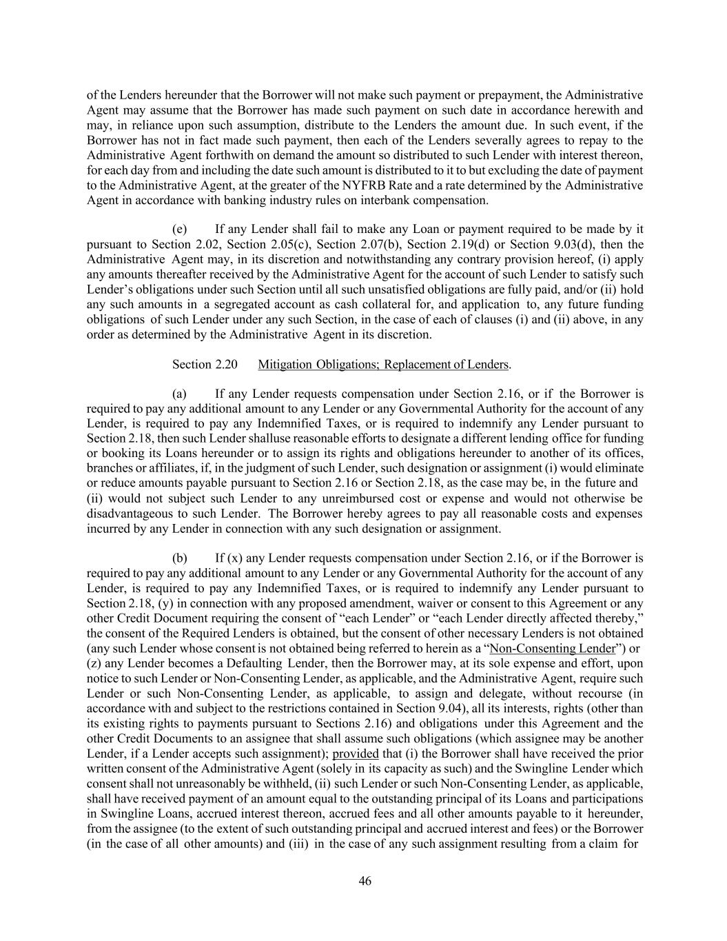 46 of the Lenders hereunder that the Borrower will not make such payment or prepayment, the Administrative Agent may assume that the Borrower has made such payment on such date in accordance herewith and may, in reliance upon such assumption, distribute to the Lenders the amount due. In such event, if the Borrower has not in fact made such payment, then each of the Lenders severally agrees to repay to the Administrative Agent forthwith on demand the amount so distributed to such Lender with interest thereon, for each day from and including the date such amount is distributed to it to but excluding the date of payment to the Administrative Agent, at the greater of the NYFRB Rate and a rate determined by the Administrative Agent in accordance with banking industry rules on interbank compensation. (e) If any Lender shall fail to make any Loan or payment required to be made by it pursuant to Section 2.02, Section 2.05(c), Section 2.07(b), Section 2.19(d) or Section 9.03(d), then the Administrative Agent may, in its discretion and notwithstanding any contrary provision hereof, (i) apply any amounts thereafter received by the Administrative Agent for the account of such Lender to satisfy such Lender’s obligations under such Section until all such unsatisfied obligations are fully paid, and/or (ii) hold any such amounts in a segregated account as cash collateral for, and application to, any future funding obligations of such Lender under any such Section, in the case of each of clauses (i) and (ii) above, in any order as determined by the Administrative Agent in its discretion. Section 2.20 Mitigation Obligations; Replacement of Lenders. (a) If any Lender requests compensation under Section 2.16, or if the Borrower is required to pay any additional amount to any Lender or any Governmental Authority for the account of any Lender, is required to pay any Indemnified Taxes, or is required to indemnify any Lender pursuant to Section 2.18, then such Lender shalluse reasonable efforts to designate a different lending office for funding or booking its Loans hereunder or to assign its rights and obligations hereunder to another of its offices, branches or affiliates, if, in the judgment of such Lender, such designation or assignment (i) would eliminate or reduce amounts payable pursuant to Section 2.16 or Section 2.18, as the case may be, in the future and (ii) would not subject such Lender to any unreimbursed cost or expense and would not otherwise be disadvantageous to such Lender. The Borrower hereby agrees to pay all reasonable costs and expenses incurred by any Lender in connection with any such designation or assignment. (b) If (x) any Lender requests compensation under Section 2.16, or if the Borrower is required to pay any additional amount to any Lender or any Governmental Authority for the account of any Lender, is required to pay any Indemnified Taxes, or is required to indemnify any Lender pursuant to Section 2.18, (y) in connection with any proposed amendment, waiver or consent to this Agreement or any other Credit Document requiring the consent of “each Lender” or “each Lender directly affected thereby,” the consent of the Required Lenders is obtained, but the consent of other necessary Lenders is not obtained (any such Lender whose consent is not obtained being referred to herein as a “Non-Consenting Lender”) or (z) any Lender becomes a Defaulting Lender, then the Borrower may, at its sole expense and effort, upon notice to such Lender or Non-Consenting Lender, as applicable, and the Administrative Agent, require such Lender or such Non-Consenting Lender, as applicable, to assign and delegate, without recourse (in accordance with and subject to the restrictions contained in Section 9.04), all its interests, rights (other than its existing rights to payments pursuant to Sections 2.16) and obligations under this Agreement and the other Credit Documents to an assignee that shall assume such obligations (which assignee may be another Lender, if a Lender accepts such assignment); provided that (i) the Borrower shall have received the prior written consent of the Administrative Agent (solely in its capacity as such) and the Swingline Lender which consent shall not unreasonably be withheld, (ii) such Lender or such Non-Consenting Lender, as applicable, shall have received payment of an amount equal to the outstanding principal of its Loans and participations in Swingline Loans, accrued interest thereon, accrued fees and all other amounts payable to it hereunder, from the assignee (to the extent of such outstanding principal and accrued interest and fees) or the Borrower (in the case of all other amounts) and (iii) in the case of any such assignment resulting from a claim for