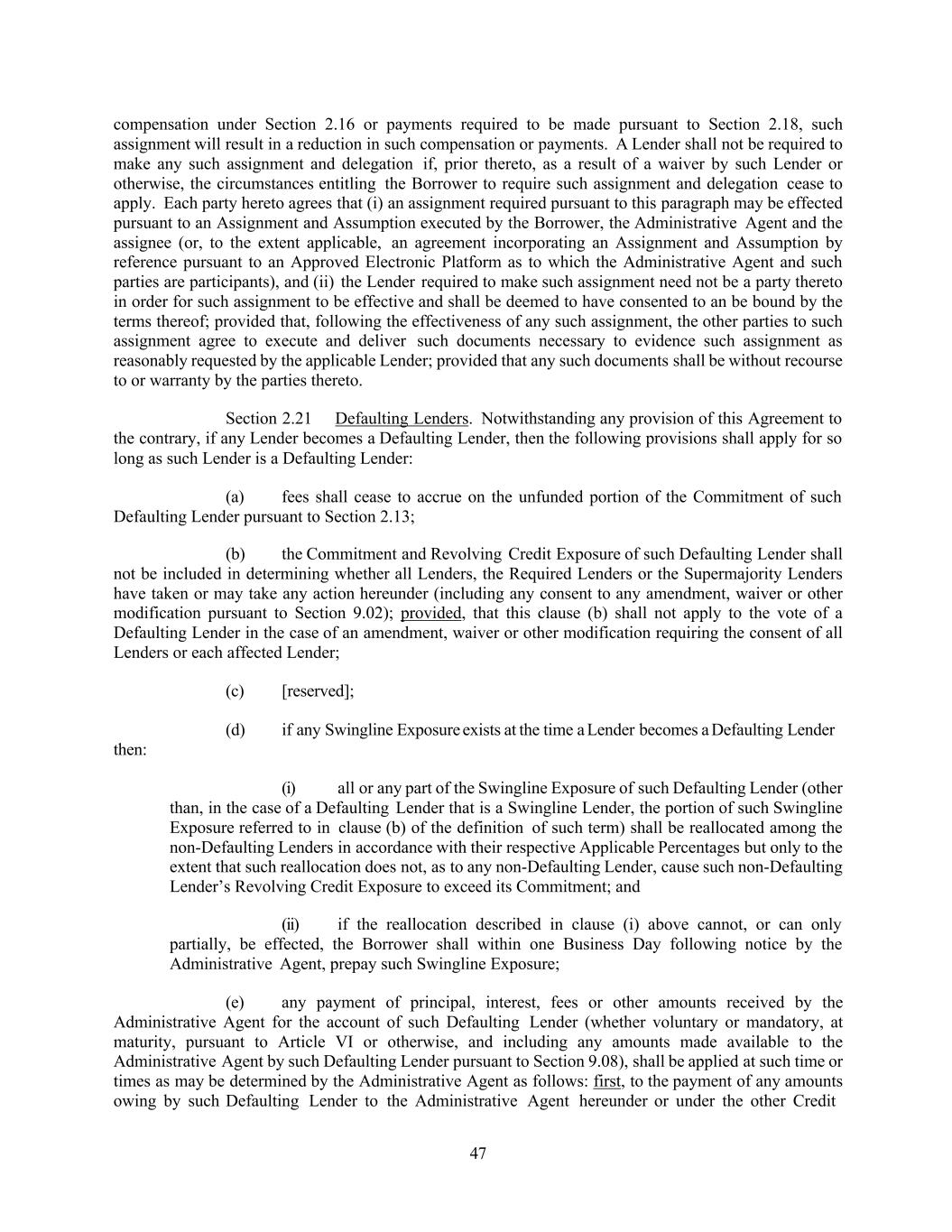 47 compensation under Section 2.16 or payments required to be made pursuant to Section 2.18, such assignment will result in a reduction in such compensation or payments. A Lender shall not be required to make any such assignment and delegation if, prior thereto, as a result of a waiver by such Lender or otherwise, the circumstances entitling the Borrower to require such assignment and delegation cease to apply. Each party hereto agrees that (i) an assignment required pursuant to this paragraph may be effected pursuant to an Assignment and Assumption executed by the Borrower, the Administrative Agent and the assignee (or, to the extent applicable, an agreement incorporating an Assignment and Assumption by reference pursuant to an Approved Electronic Platform as to which the Administrative Agent and such parties are participants), and (ii) the Lender required to make such assignment need not be a party thereto in order for such assignment to be effective and shall be deemed to have consented to an be bound by the terms thereof; provided that, following the effectiveness of any such assignment, the other parties to such assignment agree to execute and deliver such documents necessary to evidence such assignment as reasonably requested by the applicable Lender; provided that any such documents shall be without recourse to or warranty by the parties thereto. Section 2.21 Defaulting Lenders. Notwithstanding any provision of this Agreement to the contrary, if any Lender becomes a Defaulting Lender, then the following provisions shall apply for so long as such Lender is a Defaulting Lender: (a) fees shall cease to accrue on the unfunded portion of the Commitment of such Defaulting Lender pursuant to Section 2.13; (b) the Commitment and Revolving Credit Exposure of such Defaulting Lender shall not be included in determining whether all Lenders, the Required Lenders or the Supermajority Lenders have taken or may take any action hereunder (including any consent to any amendment, waiver or other modification pursuant to Section 9.02); provided, that this clause (b) shall not apply to the vote of a Defaulting Lender in the case of an amendment, waiver or other modification requiring the consent of all Lenders or each affected Lender; (c) [reserved]; (d) if any Swingline Exposure exists at the time a Lender becomes a Defaulting Lender then: (i) all or any part of the Swingline Exposure of such Defaulting Lender (other than, in the case of a Defaulting Lender that is a Swingline Lender, the portion of such Swingline Exposure referred to in clause (b) of the definition of such term) shall be reallocated among the non-Defaulting Lenders in accordance with their respective Applicable Percentages but only to the extent that such reallocation does not, as to any non-Defaulting Lender, cause such non-Defaulting Lender’s Revolving Credit Exposure to exceed its Commitment; and (ii) if the reallocation described in clause (i) above cannot, or can only partially, be effected, the Borrower shall within one Business Day following notice by the Administrative Agent, prepay such Swingline Exposure; (e) any payment of principal, interest, fees or other amounts received by the Administrative Agent for the account of such Defaulting Lender (whether voluntary or mandatory, at maturity, pursuant to Article VI or otherwise, and including any amounts made available to the Administrative Agent by such Defaulting Lender pursuant to Section 9.08), shall be applied at such time or times as may be determined by the Administrative Agent as follows: first, to the payment of any amounts owing by such Defaulting Lender to the Administrative Agent hereunder or under the other Credit