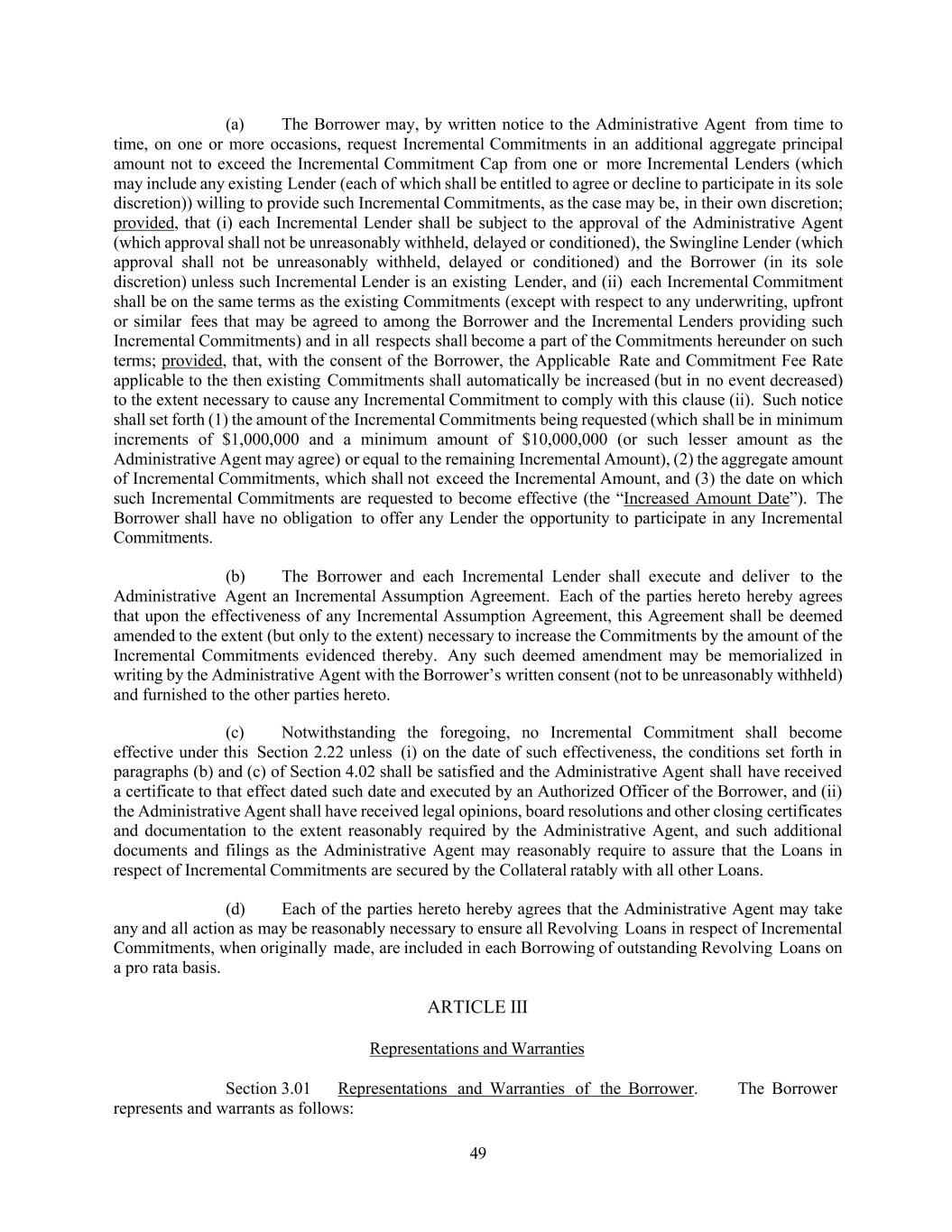 49 (a) The Borrower may, by written notice to the Administrative Agent from time to time, on one or more occasions, request Incremental Commitments in an additional aggregate principal amount not to exceed the Incremental Commitment Cap from one or more Incremental Lenders (which may include any existing Lender (each of which shall be entitled to agree or decline to participate in its sole discretion)) willing to provide such Incremental Commitments, as the case may be, in their own discretion; provided, that (i) each Incremental Lender shall be subject to the approval of the Administrative Agent (which approval shall not be unreasonably withheld, delayed or conditioned), the Swingline Lender (which approval shall not be unreasonably withheld, delayed or conditioned) and the Borrower (in its sole discretion) unless such Incremental Lender is an existing Lender, and (ii) each Incremental Commitment shall be on the same terms as the existing Commitments (except with respect to any underwriting, upfront or similar fees that may be agreed to among the Borrower and the Incremental Lenders providing such Incremental Commitments) and in all respects shall become a part of the Commitments hereunder on such terms; provided, that, with the consent of the Borrower, the Applicable Rate and Commitment Fee Rate applicable to the then existing Commitments shall automatically be increased (but in no event decreased) to the extent necessary to cause any Incremental Commitment to comply with this clause (ii). Such notice shall set forth (1) the amount of the Incremental Commitments being requested (which shall be in minimum increments of $1,000,000 and a minimum amount of $10,000,000 (or such lesser amount as the Administrative Agent may agree) or equal to the remaining Incremental Amount), (2) the aggregate amount of Incremental Commitments, which shall not exceed the Incremental Amount, and (3) the date on which such Incremental Commitments are requested to become effective (the “Increased Amount Date”). The Borrower shall have no obligation to offer any Lender the opportunity to participate in any Incremental Commitments. (b) The Borrower and each Incremental Lender shall execute and deliver to the Administrative Agent an Incremental Assumption Agreement. Each of the parties hereto hereby agrees that upon the effectiveness of any Incremental Assumption Agreement, this Agreement shall be deemed amended to the extent (but only to the extent) necessary to increase the Commitments by the amount of the Incremental Commitments evidenced thereby. Any such deemed amendment may be memorialized in writing by the Administrative Agent with the Borrower’s written consent (not to be unreasonably withheld) and furnished to the other parties hereto. (c) Notwithstanding the foregoing, no Incremental Commitment shall become effective under this Section 2.22 unless (i) on the date of such effectiveness, the conditions set forth in paragraphs (b) and (c) of Section 4.02 shall be satisfied and the Administrative Agent shall have received a certificate to that effect dated such date and executed by an Authorized Officer of the Borrower, and (ii) the Administrative Agent shall have received legal opinions, board resolutions and other closing certificates and documentation to the extent reasonably required by the Administrative Agent, and such additional documents and filings as the Administrative Agent may reasonably require to assure that the Loans in respect of Incremental Commitments are secured by the Collateral ratably with all other Loans. (d) Each of the parties hereto hereby agrees that the Administrative Agent may take any and all action as may be reasonably necessary to ensure all Revolving Loans in respect of Incremental Commitments, when originally made, are included in each Borrowing of outstanding Revolving Loans on a pro rata basis. ARTICLE III Representations and Warranties Section 3.01 Representations and Warranties of the Borrower. The Borrower represents and warrants as follows:
