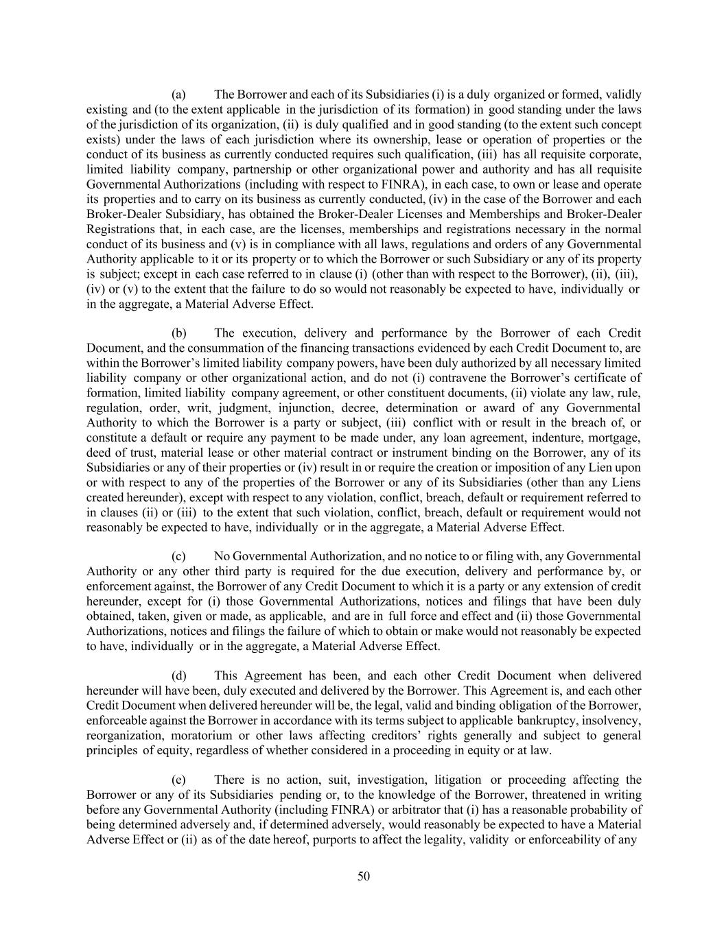 50 (a) The Borrower and each of its Subsidiaries (i) is a duly organized or formed, validly existing and (to the extent applicable in the jurisdiction of its formation) in good standing under the laws of the jurisdiction of its organization, (ii) is duly qualified and in good standing (to the extent such concept exists) under the laws of each jurisdiction where its ownership, lease or operation of properties or the conduct of its business as currently conducted requires such qualification, (iii) has all requisite corporate, limited liability company, partnership or other organizational power and authority and has all requisite Governmental Authorizations (including with respect to FINRA), in each case, to own or lease and operate its properties and to carry on its business as currently conducted, (iv) in the case of the Borrower and each Broker-Dealer Subsidiary, has obtained the Broker-Dealer Licenses and Memberships and Broker-Dealer Registrations that, in each case, are the licenses, memberships and registrations necessary in the normal conduct of its business and (v) is in compliance with all laws, regulations and orders of any Governmental Authority applicable to it or its property or to which the Borrower or such Subsidiary or any of its property is subject; except in each case referred to in clause (i) (other than with respect to the Borrower), (ii), (iii), (iv) or (v) to the extent that the failure to do so would not reasonably be expected to have, individually or in the aggregate, a Material Adverse Effect. (b) The execution, delivery and performance by the Borrower of each Credit Document, and the consummation of the financing transactions evidenced by each Credit Document to, are within the Borrower’s limited liability company powers, have been duly authorized by all necessary limited liability company or other organizational action, and do not (i) contravene the Borrower’s certificate of formation, limited liability company agreement, or other constituent documents, (ii) violate any law, rule, regulation, order, writ, judgment, injunction, decree, determination or award of any Governmental Authority to which the Borrower is a party or subject, (iii) conflict with or result in the breach of, or constitute a default or require any payment to be made under, any loan agreement, indenture, mortgage, deed of trust, material lease or other material contract or instrument binding on the Borrower, any of its Subsidiaries or any of their properties or (iv) result in or require the creation or imposition of any Lien upon or with respect to any of the properties of the Borrower or any of its Subsidiaries (other than any Liens created hereunder), except with respect to any violation, conflict, breach, default or requirement referred to in clauses (ii) or (iii) to the extent that such violation, conflict, breach, default or requirement would not reasonably be expected to have, individually or in the aggregate, a Material Adverse Effect. (c) No Governmental Authorization, and no notice to or filing with, any Governmental Authority or any other third party is required for the due execution, delivery and performance by, or enforcement against, the Borrower of any Credit Document to which it is a party or any extension of credit hereunder, except for (i) those Governmental Authorizations, notices and filings that have been duly obtained, taken, given or made, as applicable, and are in full force and effect and (ii) those Governmental Authorizations, notices and filings the failure of which to obtain or make would not reasonably be expected to have, individually or in the aggregate, a Material Adverse Effect. (d) This Agreement has been, and each other Credit Document when delivered hereunder will have been, duly executed and delivered by the Borrower. This Agreement is, and each other Credit Document when delivered hereunder will be, the legal, valid and binding obligation of the Borrower, enforceable against the Borrower in accordance with its terms subject to applicable bankruptcy, insolvency, reorganization, moratorium or other laws affecting creditors’ rights generally and subject to general principles of equity, regardless of whether considered in a proceeding in equity or at law. (e) There is no action, suit, investigation, litigation or proceeding affecting the Borrower or any of its Subsidiaries pending or, to the knowledge of the Borrower, threatened in writing before any Governmental Authority (including FINRA) or arbitrator that (i) has a reasonable probability of being determined adversely and, if determined adversely, would reasonably be expected to have a Material Adverse Effect or (ii) as of the date hereof, purports to affect the legality, validity or enforceability of any