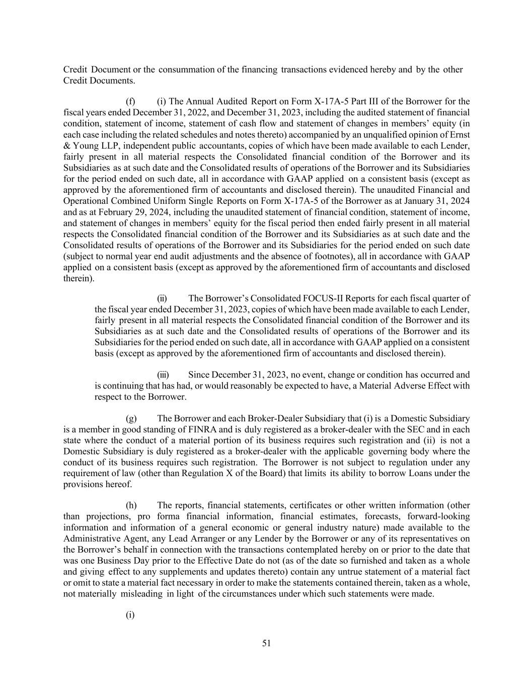 51 Credit Document or the consummation of the financing transactions evidenced hereby and by the other Credit Documents. (f) (i) The Annual Audited Report on Form X-17A-5 Part III of the Borrower for the fiscal years ended December 31, 2022, and December 31, 2023, including the audited statement of financial condition, statement of income, statement of cash flow and statement of changes in members’ equity (in each case including the related schedules and notes thereto) accompanied by an unqualified opinion of Ernst & Young LLP, independent public accountants, copies of which have been made available to each Lender, fairly present in all material respects the Consolidated financial condition of the Borrower and its Subsidiaries as at such date and the Consolidated results of operations of the Borrower and its Subsidiaries for the period ended on such date, all in accordance with GAAP applied on a consistent basis (except as approved by the aforementioned firm of accountants and disclosed therein). The unaudited Financial and Operational Combined Uniform Single Reports on Form X-17A-5 of the Borrower as at January 31, 2024 and as at February 29, 2024, including the unaudited statement of financial condition, statement of income, and statement of changes in members’ equity for the fiscal period then ended fairly present in all material respects the Consolidated financial condition of the Borrower and its Subsidiaries as at such date and the Consolidated results of operations of the Borrower and its Subsidiaries for the period ended on such date (subject to normal year end audit adjustments and the absence of footnotes), all in accordance with GAAP applied on a consistent basis (except as approved by the aforementioned firm of accountants and disclosed therein). (ii) The Borrower’s Consolidated FOCUS-II Reports for each fiscal quarter of the fiscal year ended December 31, 2023, copies of which have been made available to each Lender, fairly present in all material respects the Consolidated financial condition of the Borrower and its Subsidiaries as at such date and the Consolidated results of operations of the Borrower and its Subsidiaries for the period ended on such date, all in accordance with GAAP applied on a consistent basis (except as approved by the aforementioned firm of accountants and disclosed therein). (iii) Since December 31, 2023, no event, change or condition has occurred and is continuing that has had, or would reasonably be expected to have, a Material Adverse Effect with respect to the Borrower. (g) The Borrower and each Broker-Dealer Subsidiary that (i) is a Domestic Subsidiary is a member in good standing of FINRA and is duly registered as a broker-dealer with the SEC and in each state where the conduct of a material portion of its business requires such registration and (ii) is not a Domestic Subsidiary is duly registered as a broker-dealer with the applicable governing body where the conduct of its business requires such registration. The Borrower is not subject to regulation under any requirement of law (other than Regulation X of the Board) that limits its ability to borrow Loans under the provisions hereof. (h) The reports, financial statements, certificates or other written information (other than projections, pro forma financial information, financial estimates, forecasts, forward-looking information and information of a general economic or general industry nature) made available to the Administrative Agent, any Lead Arranger or any Lender by the Borrower or any of its representatives on the Borrower’s behalf in connection with the transactions contemplated hereby on or prior to the date that was one Business Day prior to the Effective Date do not (as of the date so furnished and taken as a whole and giving effect to any supplements and updates thereto) contain any untrue statement of a material fact or omit to state a material fact necessary in order to make the statements contained therein, taken as a whole, not materially misleading in light of the circumstances under which such statements were made. (i)
