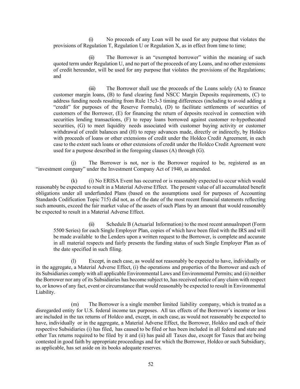 52 (i) No proceeds of any Loan will be used for any purpose that violates the provisions of Regulation T, Regulation U or Regulation X, as in effect from time to time; (ii) The Borrower is an “exempted borrower” within the meaning of such quoted term under Regulation U, and no part of the proceeds of any Loans, and no other extensions of credit hereunder, will be used for any purpose that violates the provisions of the Regulations; and (iii) The Borrower shall use the proceeds of the Loans solely (A) to finance customer margin loans, (B) to fund clearing fund NSCC Margin Deposits requirements, (C) to address funding needs resulting from Rule 15c3-3 timing differences (including to avoid adding a “credit” for purposes of the Reserve Formula), (D) to facilitate settlements of securities of customers of the Borrower, (E) for financing the return of deposits received in connection with securities lending transactions, (F) to repay loans borrowed against customer re-hypothecated securities, (G) to meet liquidity needs associated with customer buying activity or customer withdrawal of credit balances and (H) to repay advances made, directly or indirectly, by Holdco with proceeds of loans or other extensions of credit under the Holdco Credit Agreement, in each case to the extent such loans or other extensions of credit under the Holdco Credit Agreement were used for a purpose described in the foregoing clauses (A) through (G). (j) The Borrower is not, nor is the Borrower required to be, registered as an “investment company” under the Investment Company Act of 1940, as amended. (k) (i) No ERISA Event has occurred or is reasonably expected to occur which would reasonably be expected to result in a Material Adverse Effect. The present value of all accumulated benefit obligations under all underfunded Plans (based on the assumptions used for purposes of Accounting Standards Codification Topic 715) did not, as of the date of the most recent financial statements reflecting such amounts, exceed the fair market value of the assets of such Plans by an amount that would reasonably be expected to result in a Material Adverse Effect. (ii) Schedule B (Actuarial Information) to the most recent annualreport (Form 5500 Series) for each Single Employer Plan, copies of which have been filed with the IRS and will be made available to the Lenders upon a written request to the Borrower, is complete and accurate in all material respects and fairly presents the funding status of such Single Employer Plan as of the date specified in such filing. (l) Except, in each case, as would not reasonably be expected to have, individually or in the aggregate, a Material Adverse Effect, (i) the operations and properties of the Borrower and each of its Subsidiaries comply with all applicable Environmental Laws and Environmental Permits; and (ii) neither the Borrower nor any of its Subsidiaries has become subject to, has received notice of any claim with respect to, or knows of any fact, event or circumstance that would reasonably be expected to result in Environmental Liability. (m) The Borrower is a single member limited liability company, which is treated as a disregarded entity for U.S. federal income tax purposes. All tax effects of the Borrower’s income or loss are included in the tax returns of Holdco and, except, in each case, as would not reasonably be expected to have, individually or in the aggregate, a Material Adverse Effect, the Borrower, Holdco and each of their respective Subsidiaries (i) has filed, has caused to be filed or has been included in all federal and state and other Tax returns required to be filed by it and (ii) has paid all Taxes due, except for Taxes that are being contested in good faith by appropriate proceedings and for which the Borrower, Holdco or such Subsidiary, as applicable, has set aside on its books adequate reserves.