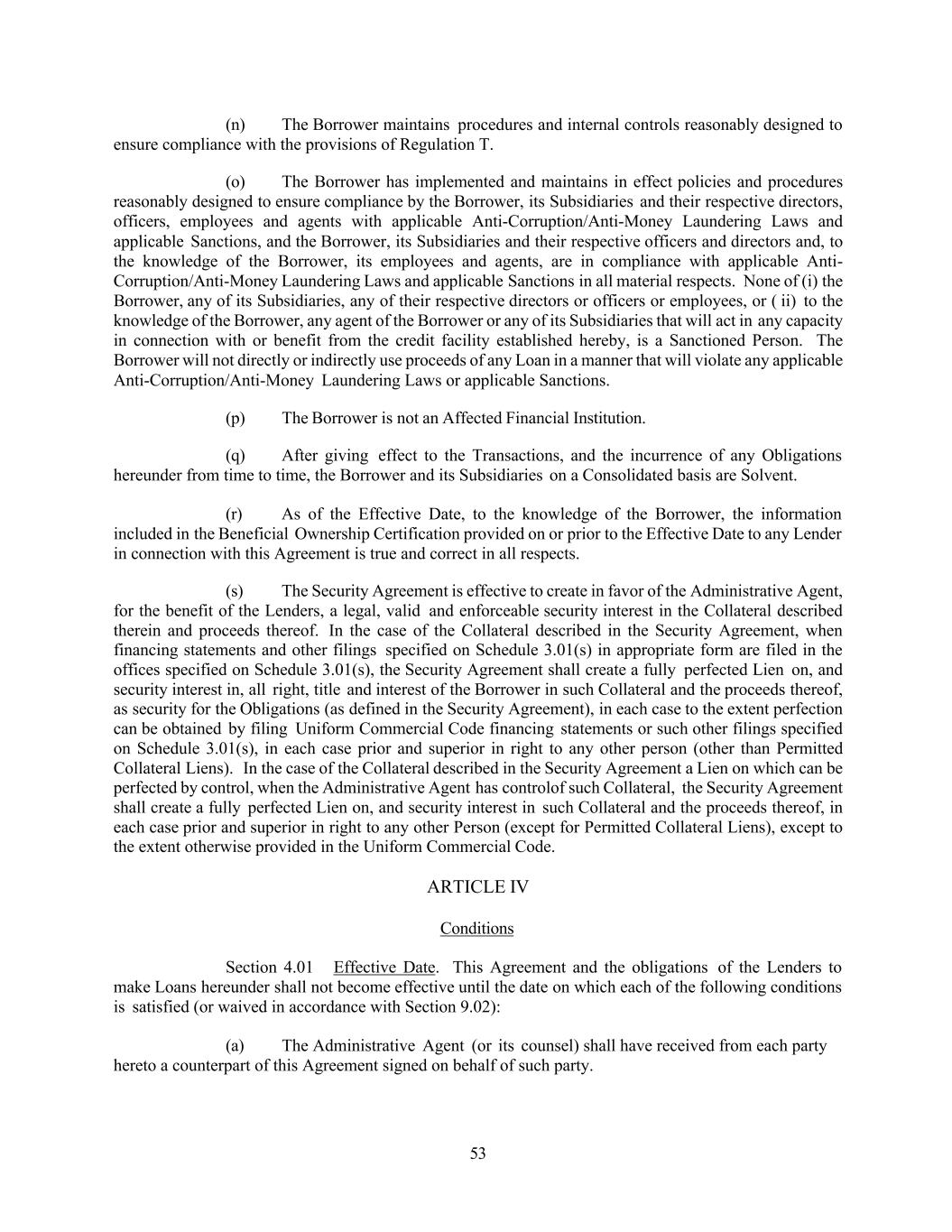 53 (n) The Borrower maintains procedures and internal controls reasonably designed to ensure compliance with the provisions of Regulation T. (o) The Borrower has implemented and maintains in effect policies and procedures reasonably designed to ensure compliance by the Borrower, its Subsidiaries and their respective directors, officers, employees and agents with applicable Anti-Corruption/Anti-Money Laundering Laws and applicable Sanctions, and the Borrower, its Subsidiaries and their respective officers and directors and, to the knowledge of the Borrower, its employees and agents, are in compliance with applicable Anti- Corruption/Anti-Money Laundering Laws and applicable Sanctions in all material respects. None of (i) the Borrower, any of its Subsidiaries, any of their respective directors or officers or employees, or ( ii) to the knowledge of the Borrower, any agent of the Borrower or any of its Subsidiaries that will act in any capacity in connection with or benefit from the credit facility established hereby, is a Sanctioned Person. The Borrower will not directly or indirectly use proceeds of any Loan in a manner that will violate any applicable Anti-Corruption/Anti-Money Laundering Laws or applicable Sanctions. (p) The Borrower is not an Affected Financial Institution. (q) After giving effect to the Transactions, and the incurrence of any Obligations hereunder from time to time, the Borrower and its Subsidiaries on a Consolidated basis are Solvent. (r) As of the Effective Date, to the knowledge of the Borrower, the information included in the Beneficial Ownership Certification provided on or prior to the Effective Date to any Lender in connection with this Agreement is true and correct in all respects. (s) The Security Agreement is effective to create in favor of the Administrative Agent, for the benefit of the Lenders, a legal, valid and enforceable security interest in the Collateral described therein and proceeds thereof. In the case of the Collateral described in the Security Agreement, when financing statements and other filings specified on Schedule 3.01(s) in appropriate form are filed in the offices specified on Schedule 3.01(s), the Security Agreement shall create a fully perfected Lien on, and security interest in, all right, title and interest of the Borrower in such Collateral and the proceeds thereof, as security for the Obligations (as defined in the Security Agreement), in each case to the extent perfection can be obtained by filing Uniform Commercial Code financing statements or such other filings specified on Schedule 3.01(s), in each case prior and superior in right to any other person (other than Permitted Collateral Liens). In the case of the Collateral described in the Security Agreement a Lien on which can be perfected by control, when the Administrative Agent has controlof such Collateral, the Security Agreement shall create a fully perfected Lien on, and security interest in such Collateral and the proceeds thereof, in each case prior and superior in right to any other Person (except for Permitted Collateral Liens), except to the extent otherwise provided in the Uniform Commercial Code. ARTICLE IV Conditions Section 4.01 Effective Date. This Agreement and the obligations of the Lenders to make Loans hereunder shall not become effective until the date on which each of the following conditions is satisfied (or waived in accordance with Section 9.02): (a) The Administrative Agent (or its counsel) shall have received from each party hereto a counterpart of this Agreement signed on behalf of such party.