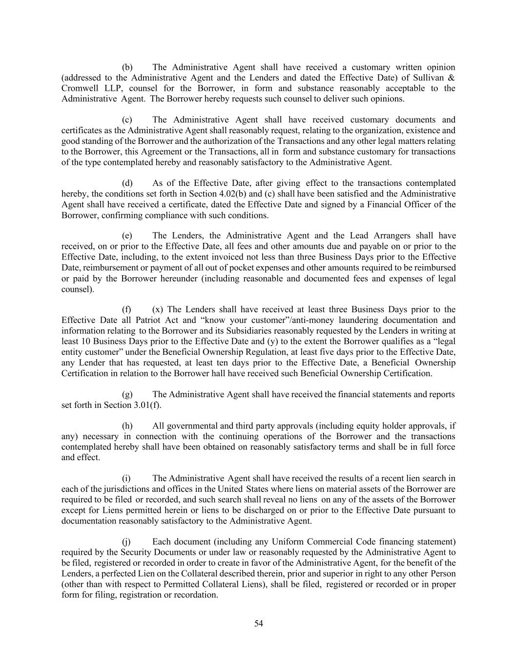 54 (b) The Administrative Agent shall have received a customary written opinion (addressed to the Administrative Agent and the Lenders and dated the Effective Date) of Sullivan & Cromwell LLP, counsel for the Borrower, in form and substance reasonably acceptable to the Administrative Agent. The Borrower hereby requests such counsel to deliver such opinions. (c) The Administrative Agent shall have received customary documents and certificates as the Administrative Agent shall reasonably request, relating to the organization, existence and good standing of the Borrower and the authorization of the Transactions and any other legal matters relating to the Borrower, this Agreement or the Transactions, all in form and substance customary for transactions of the type contemplated hereby and reasonably satisfactory to the Administrative Agent. (d) As of the Effective Date, after giving effect to the transactions contemplated hereby, the conditions set forth in Section 4.02(b) and (c) shall have been satisfied and the Administrative Agent shall have received a certificate, dated the Effective Date and signed by a Financial Officer of the Borrower, confirming compliance with such conditions. (e) The Lenders, the Administrative Agent and the Lead Arrangers shall have received, on or prior to the Effective Date, all fees and other amounts due and payable on or prior to the Effective Date, including, to the extent invoiced not less than three Business Days prior to the Effective Date, reimbursement or payment of all out of pocket expenses and other amounts required to be reimbursed or paid by the Borrower hereunder (including reasonable and documented fees and expenses of legal counsel). (f) (x) The Lenders shall have received at least three Business Days prior to the Effective Date all Patriot Act and “know your customer”/anti-money laundering documentation and information relating to the Borrower and its Subsidiaries reasonably requested by the Lenders in writing at least 10 Business Days prior to the Effective Date and (y) to the extent the Borrower qualifies as a “legal entity customer” under the Beneficial Ownership Regulation, at least five days prior to the Effective Date, any Lender that has requested, at least ten days prior to the Effective Date, a Beneficial Ownership Certification in relation to the Borrower hall have received such Beneficial Ownership Certification. (g) The Administrative Agent shall have received the financial statements and reports set forth in Section 3.01(f). (h) All governmental and third party approvals (including equity holder approvals, if any) necessary in connection with the continuing operations of the Borrower and the transactions contemplated hereby shall have been obtained on reasonably satisfactory terms and shall be in full force and effect. (i) The Administrative Agent shall have received the results of a recent lien search in each of the jurisdictions and offices in the United States where liens on material assets of the Borrower are required to be filed or recorded, and such search shall reveal no liens on any of the assets of the Borrower except for Liens permitted herein or liens to be discharged on or prior to the Effective Date pursuant to documentation reasonably satisfactory to the Administrative Agent. (j) Each document (including any Uniform Commercial Code financing statement) required by the Security Documents or under law or reasonably requested by the Administrative Agent to be filed, registered or recorded in order to create in favor of the Administrative Agent, for the benefit of the Lenders, a perfected Lien on the Collateral described therein, prior and superior in right to any other Person (other than with respect to Permitted Collateral Liens), shall be filed, registered or recorded or in proper form for filing, registration or recordation.