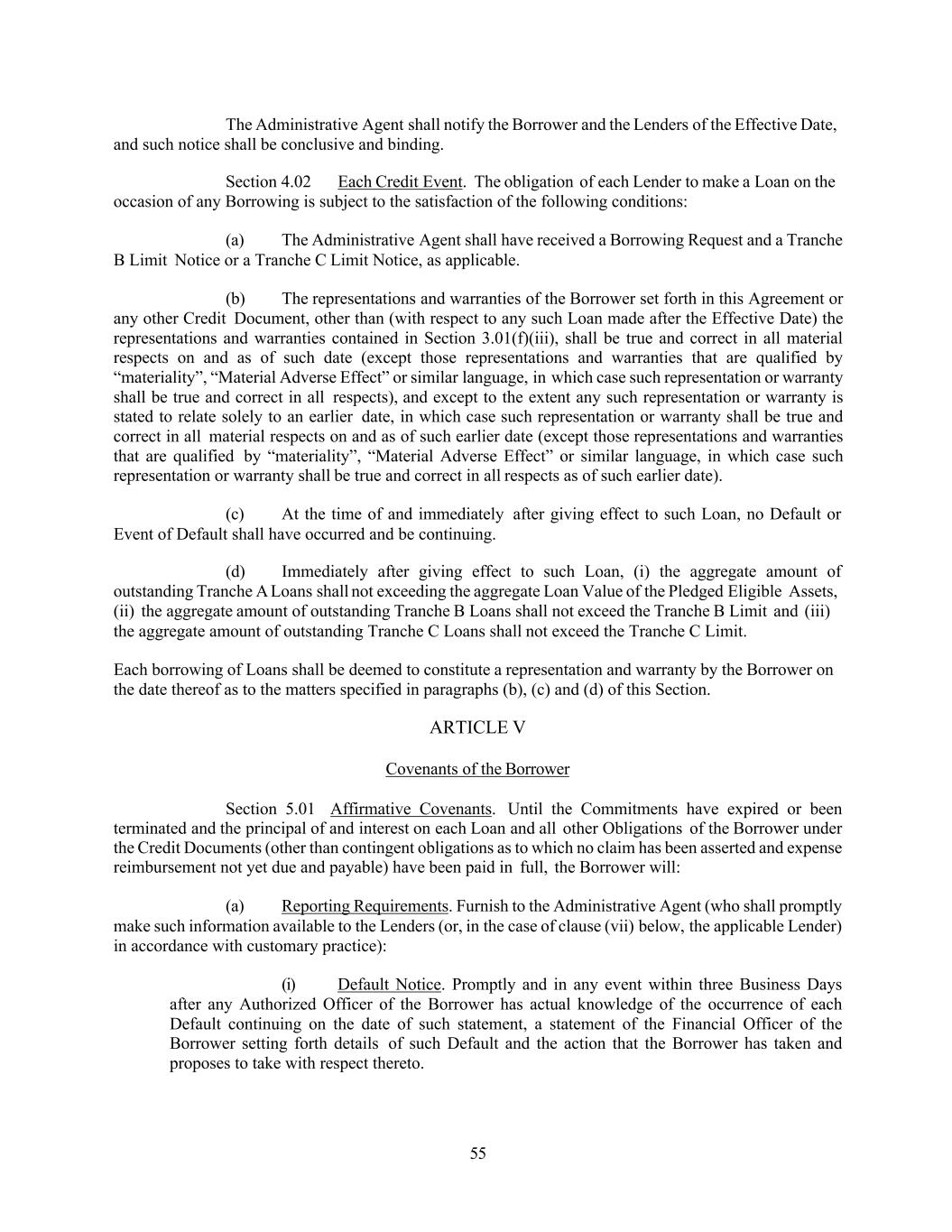 55 The Administrative Agent shall notify the Borrower and the Lenders of the Effective Date, and such notice shall be conclusive and binding. Section 4.02 Each Credit Event. The obligation of each Lender to make a Loan on the occasion of any Borrowing is subject to the satisfaction of the following conditions: (a) The Administrative Agent shall have received a Borrowing Request and a Tranche B Limit Notice or a Tranche C Limit Notice, as applicable. (b) The representations and warranties of the Borrower set forth in this Agreement or any other Credit Document, other than (with respect to any such Loan made after the Effective Date) the representations and warranties contained in Section 3.01(f)(iii), shall be true and correct in all material respects on and as of such date (except those representations and warranties that are qualified by “materiality”, “Material Adverse Effect” or similar language, in which case such representation or warranty shall be true and correct in all respects), and except to the extent any such representation or warranty is stated to relate solely to an earlier date, in which case such representation or warranty shall be true and correct in all material respects on and as of such earlier date (except those representations and warranties that are qualified by “materiality”, “Material Adverse Effect” or similar language, in which case such representation or warranty shall be true and correct in all respects as of such earlier date). (c) At the time of and immediately after giving effect to such Loan, no Default or Event of Default shall have occurred and be continuing. (d) Immediately after giving effect to such Loan, (i) the aggregate amount of outstanding Tranche A Loans shall not exceeding the aggregate Loan Value of the Pledged Eligible Assets, (ii) the aggregate amount of outstanding Tranche B Loans shall not exceed the Tranche B Limit and (iii) the aggregate amount of outstanding Tranche C Loans shall not exceed the Tranche C Limit. Each borrowing of Loans shall be deemed to constitute a representation and warranty by the Borrower on the date thereof as to the matters specified in paragraphs (b), (c) and (d) of this Section. ARTICLE V Covenants of the Borrower Section 5.01 Affirmative Covenants. Until the Commitments have expired or been terminated and the principal of and interest on each Loan and all other Obligations of the Borrower under the Credit Documents (other than contingent obligations as to which no claim has been asserted and expense reimbursement not yet due and payable) have been paid in full, the Borrower will: (a) Reporting Requirements. Furnish to the Administrative Agent (who shall promptly make such information available to the Lenders (or, in the case of clause (vii) below, the applicable Lender) in accordance with customary practice): (i) Default Notice. Promptly and in any event within three Business Days after any Authorized Officer of the Borrower has actual knowledge of the occurrence of each Default continuing on the date of such statement, a statement of the Financial Officer of the Borrower setting forth details of such Default and the action that the Borrower has taken and proposes to take with respect thereto.
