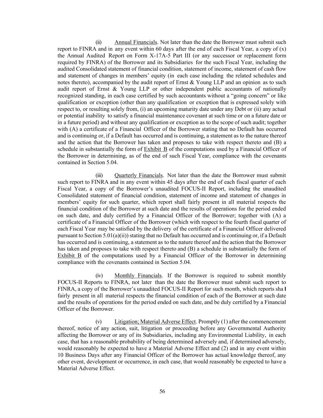 56 (ii) Annual Financials. Not later than the date the Borrower must submit such report to FINRA and in any event within 60 days after the end of each Fiscal Year, a copy of (x) the Annual Audited Report on Form X-17A-5 Part III (or any successor or replacement form required by FINRA) of the Borrower and its Subsidiaries for the such Fiscal Year, including the audited Consolidated statement of financial condition, statement of income, statement of cash flow and statement of changes in members’ equity (in each case including the related schedules and notes thereto), accompanied by the audit report of Ernst & Young LLP and an opinion as to such audit report of Ernst & Young LLP or other independent public accountants of nationally recognized standing, in each case certified by such accountants without a “going concern” or like qualification or exception (other than any qualification or exception that is expressed solely with respect to, or resulting solely from, (i) an upcoming maturity date under any Debt or (ii) any actual or potential inability to satisfy a financial maintenance covenant at such time or on a future date or in a future period) and without any qualification or exception as to the scope of such audit; together with (A) a certificate of a Financial Officer of the Borrower stating that no Default has occurred and is continuing or, if a Default has occurred and is continuing, a statement as to the nature thereof and the action that the Borrower has taken and proposes to take with respect thereto and (B) a schedule in substantially the form of Exhibit B of the computations used by a Financial Officer of the Borrower in determining, as of the end of such Fiscal Year, compliance with the covenants contained in Section 5.04. (iii) Quarterly Financials. Not later than the date the Borrower must submit such report to FINRA and in any event within 45 days after the end of each fiscal quarter of each Fiscal Year, a copy of the Borrower’s unaudited FOCUS-II Report, including the unaudited Consolidated statement of financial condition, statement of income and statement of changes in members’ equity for such quarter, which report shall fairly present in all material respects the financial condition of the Borrower at such date and the results of operations for the period ended on such date, and duly certified by a Financial Officer of the Borrower; together with (A) a certificate of a Financial Officer of the Borrower (which with respect to the fourth fiscal quarter of each Fiscal Year may be satisfied by the delivery of the certificate of a Financial Officer delivered pursuant to Section 5.01(a)(ii)) stating that no Default has occurred and is continuing or, if a Default has occurred and is continuing, a statement as to the nature thereof and the action that the Borrower has taken and proposes to take with respect thereto and (B) a schedule in substantially the form of Exhibit B of the computations used by a Financial Officer of the Borrower in determining compliance with the covenants contained in Section 5.04. (iv) Monthly Financials. If the Borrower is required to submit monthly FOCUS-II Reports to FINRA, not later than the date the Borrower must submit such report to FINRA, a copy of the Borrower’s unaudited FOCUS-II Report for such month, which reports sha l fairly present in all material respects the financial condition of each of the Borrower at such date and the results of operations for the period ended on such date, and be duly certified by a Financial Officer of the Borrower. (v) Litigation; Material Adverse Effect. Promptly (1) after the commencement thereof, notice of any action, suit, litigation or proceeding before any Governmental Authority affecting the Borrower or any of its Subsidiaries, including any Environmental Liability, in each case, that has a reasonable probability of being determined adversely and, if determined adversely, would reasonably be expected to have a Material Adverse Effect and (2) and in any event within 10 Business Days after any Financial Officer of the Borrower has actual knowledge thereof, any other event, development or occurrence, in each case, that would reasonably be expected to have a Material Adverse Effect.