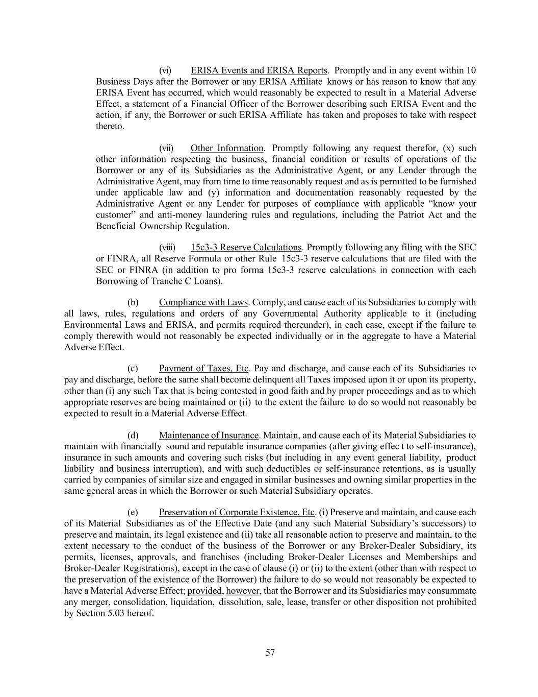 57 (vi) ERISA Events and ERISA Reports. Promptly and in any event within 10 Business Days after the Borrower or any ERISA Affiliate knows or has reason to know that any ERISA Event has occurred, which would reasonably be expected to result in a Material Adverse Effect, a statement of a Financial Officer of the Borrower describing such ERISA Event and the action, if any, the Borrower or such ERISA Affiliate has taken and proposes to take with respect thereto. (vii) Other Information. Promptly following any request therefor, (x) such other information respecting the business, financial condition or results of operations of the Borrower or any of its Subsidiaries as the Administrative Agent, or any Lender through the Administrative Agent, may from time to time reasonably request and as is permitted to be furnished under applicable law and (y) information and documentation reasonably requested by the Administrative Agent or any Lender for purposes of compliance with applicable “know your customer” and anti-money laundering rules and regulations, including the Patriot Act and the Beneficial Ownership Regulation. (viii) 15c3-3 Reserve Calculations. Promptly following any filing with the SEC or FINRA, all Reserve Formula or other Rule 15c3-3 reserve calculations that are filed with the SEC or FINRA (in addition to pro forma 15c3-3 reserve calculations in connection with each Borrowing of Tranche C Loans). (b) Compliance with Laws. Comply, and cause each of its Subsidiaries to comply with all laws, rules, regulations and orders of any Governmental Authority applicable to it (including Environmental Laws and ERISA, and permits required thereunder), in each case, except if the failure to comply therewith would not reasonably be expected individually or in the aggregate to have a Material Adverse Effect. (c) Payment of Taxes, Etc. Pay and discharge, and cause each of its Subsidiaries to pay and discharge, before the same shall become delinquent all Taxes imposed upon it or upon its property, other than (i) any such Tax that is being contested in good faith and by proper proceedings and as to which appropriate reserves are being maintained or (ii) to the extent the failure to do so would not reasonably be expected to result in a Material Adverse Effect. (d) Maintenance of Insurance. Maintain, and cause each of its Material Subsidiaries to maintain with financially sound and reputable insurance companies (after giving effec t to self-insurance), insurance in such amounts and covering such risks (but including in any event general liability, product liability and business interruption), and with such deductibles or self-insurance retentions, as is usually carried by companies of similar size and engaged in similar businesses and owning similar properties in the same general areas in which the Borrower or such Material Subsidiary operates. (e) Preservation of Corporate Existence, Etc. (i) Preserve and maintain, and cause each of its Material Subsidiaries as of the Effective Date (and any such Material Subsidiary’s successors) to preserve and maintain, its legal existence and (ii) take all reasonable action to preserve and maintain, to the extent necessary to the conduct of the business of the Borrower or any Broker-Dealer Subsidiary, its permits, licenses, approvals, and franchises (including Broker-Dealer Licenses and Memberships and Broker-Dealer Registrations), except in the case of clause (i) or (ii) to the extent (other than with respect to the preservation of the existence of the Borrower) the failure to do so would not reasonably be expected to have a Material Adverse Effect; provided, however, that the Borrower and its Subsidiaries may consummate any merger, consolidation, liquidation, dissolution, sale, lease, transfer or other disposition not prohibited by Section 5.03 hereof.