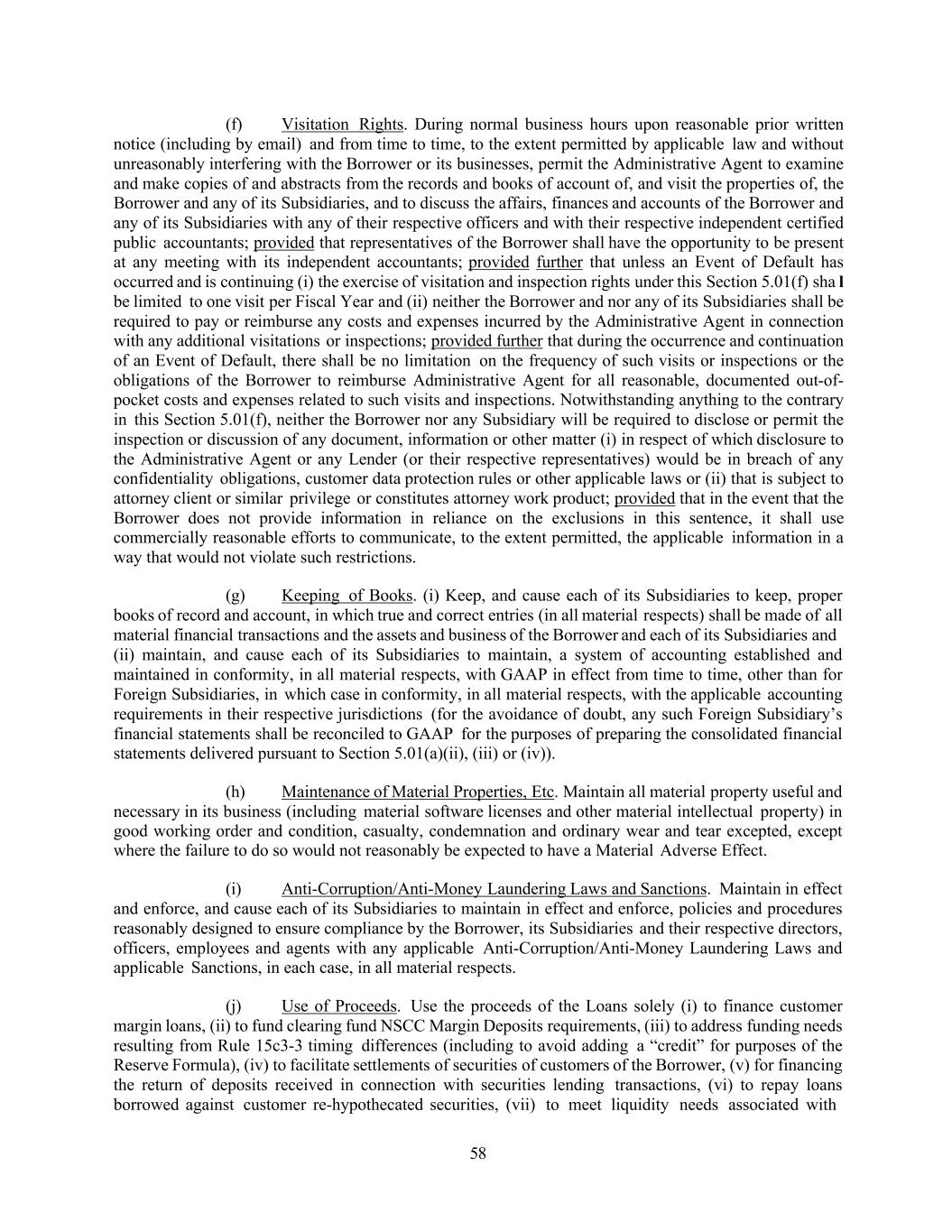58 (f) Visitation Rights. During normal business hours upon reasonable prior written notice (including by email) and from time to time, to the extent permitted by applicable law and without unreasonably interfering with the Borrower or its businesses, permit the Administrative Agent to examine and make copies of and abstracts from the records and books of account of, and visit the properties of, the Borrower and any of its Subsidiaries, and to discuss the affairs, finances and accounts of the Borrower and any of its Subsidiaries with any of their respective officers and with their respective independent certified public accountants; provided that representatives of the Borrower shall have the opportunity to be present at any meeting with its independent accountants; provided further that unless an Event of Default has occurred and is continuing (i) the exercise of visitation and inspection rights under this Section 5.01(f) sha l be limited to one visit per Fiscal Year and (ii) neither the Borrower and nor any of its Subsidiaries shall be required to pay or reimburse any costs and expenses incurred by the Administrative Agent in connection with any additional visitations or inspections; provided further that during the occurrence and continuation of an Event of Default, there shall be no limitation on the frequency of such visits or inspections or the obligations of the Borrower to reimburse Administrative Agent for all reasonable, documented out-of- pocket costs and expenses related to such visits and inspections. Notwithstanding anything to the contrary in this Section 5.01(f), neither the Borrower nor any Subsidiary will be required to disclose or permit the inspection or discussion of any document, information or other matter (i) in respect of which disclosure to the Administrative Agent or any Lender (or their respective representatives) would be in breach of any confidentiality obligations, customer data protection rules or other applicable laws or (ii) that is subject to attorney client or similar privilege or constitutes attorney work product; provided that in the event that the Borrower does not provide information in reliance on the exclusions in this sentence, it shall use commercially reasonable efforts to communicate, to the extent permitted, the applicable information in a way that would not violate such restrictions. (g) Keeping of Books. (i) Keep, and cause each of its Subsidiaries to keep, proper books of record and account, in which true and correct entries (in all material respects) shall be made of all material financial transactions and the assets and business of the Borrower and each of its Subsidiaries and (ii) maintain, and cause each of its Subsidiaries to maintain, a system of accounting established and maintained in conformity, in all material respects, with GAAP in effect from time to time, other than for Foreign Subsidiaries, in which case in conformity, in all material respects, with the applicable accounting requirements in their respective jurisdictions (for the avoidance of doubt, any such Foreign Subsidiary’s financial statements shall be reconciled to GAAP for the purposes of preparing the consolidated financial statements delivered pursuant to Section 5.01(a)(ii), (iii) or (iv)). (h) Maintenance of Material Properties, Etc. Maintain all material property useful and necessary in its business (including material software licenses and other material intellectual property) in good working order and condition, casualty, condemnation and ordinary wear and tear excepted, except where the failure to do so would not reasonably be expected to have a Material Adverse Effect. (i) Anti-Corruption/Anti-Money Laundering Laws and Sanctions. Maintain in effect and enforce, and cause each of its Subsidiaries to maintain in effect and enforce, policies and procedures reasonably designed to ensure compliance by the Borrower, its Subsidiaries and their respective directors, officers, employees and agents with any applicable Anti-Corruption/Anti-Money Laundering Laws and applicable Sanctions, in each case, in all material respects. (j) Use of Proceeds. Use the proceeds of the Loans solely (i) to finance customer margin loans, (ii) to fund clearing fund NSCC Margin Deposits requirements, (iii) to address funding needs resulting from Rule 15c3-3 timing differences (including to avoid adding a “credit” for purposes of the Reserve Formula), (iv) to facilitate settlements of securities of customers of the Borrower, (v) for financing the return of deposits received in connection with securities lending transactions, (vi) to repay loans borrowed against customer re-hypothecated securities, (vii) to meet liquidity needs associated with