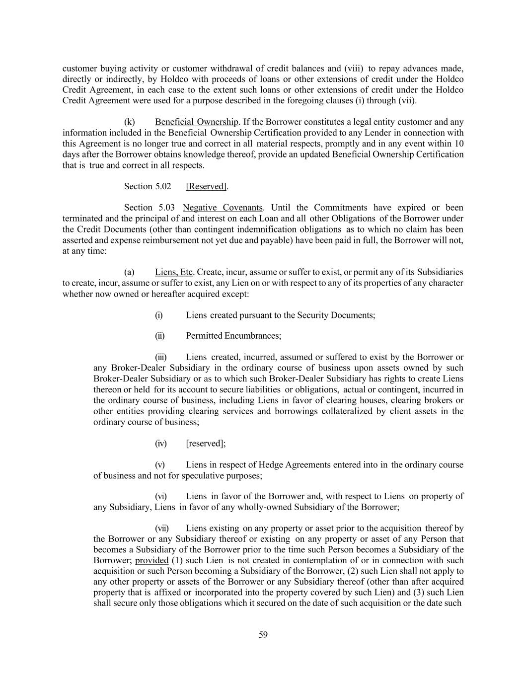 59 customer buying activity or customer withdrawal of credit balances and (viii) to repay advances made, directly or indirectly, by Holdco with proceeds of loans or other extensions of credit under the Holdco Credit Agreement, in each case to the extent such loans or other extensions of credit under the Holdco Credit Agreement were used for a purpose described in the foregoing clauses (i) through (vii). (k) Beneficial Ownership. If the Borrower constitutes a legal entity customer and any information included in the Beneficial Ownership Certification provided to any Lender in connection with this Agreement is no longer true and correct in all material respects, promptly and in any event within 10 days after the Borrower obtains knowledge thereof, provide an updated Beneficial Ownership Certification that is true and correct in all respects. Section 5.02 [Reserved]. Section 5.03 Negative Covenants. Until the Commitments have expired or been terminated and the principal of and interest on each Loan and all other Obligations of the Borrower under the Credit Documents (other than contingent indemnification obligations as to which no claim has been asserted and expense reimbursement not yet due and payable) have been paid in full, the Borrower will not, at any time: (a) Liens, Etc. Create, incur, assume or suffer to exist, or permit any of its Subsidiaries to create, incur, assume or suffer to exist, any Lien on or with respect to any of its properties of any character whether now owned or hereafter acquired except: (i) Liens created pursuant to the Security Documents; (ii) Permitted Encumbrances; (iii) Liens created, incurred, assumed or suffered to exist by the Borrower or any Broker-Dealer Subsidiary in the ordinary course of business upon assets owned by such Broker-Dealer Subsidiary or as to which such Broker-Dealer Subsidiary has rights to create Liens thereon or held for its account to secure liabilities or obligations, actual or contingent, incurred in the ordinary course of business, including Liens in favor of clearing houses, clearing brokers or other entities providing clearing services and borrowings collateralized by client assets in the ordinary course of business; (iv) [reserved]; (v) Liens in respect of Hedge Agreements entered into in the ordinary course of business and not for speculative purposes; (vi) Liens in favor of the Borrower and, with respect to Liens on property of any Subsidiary, Liens in favor of any wholly-owned Subsidiary of the Borrower; (vii) Liens existing on any property or asset prior to the acquisition thereof by the Borrower or any Subsidiary thereof or existing on any property or asset of any Person that becomes a Subsidiary of the Borrower prior to the time such Person becomes a Subsidiary of the Borrower; provided (1) such Lien is not created in contemplation of or in connection with such acquisition or such Person becoming a Subsidiary of the Borrower, (2) such Lien shall not apply to any other property or assets of the Borrower or any Subsidiary thereof (other than after acquired property that is affixed or incorporated into the property covered by such Lien) and (3) such Lien shall secure only those obligations which it secured on the date of such acquisition or the date such
