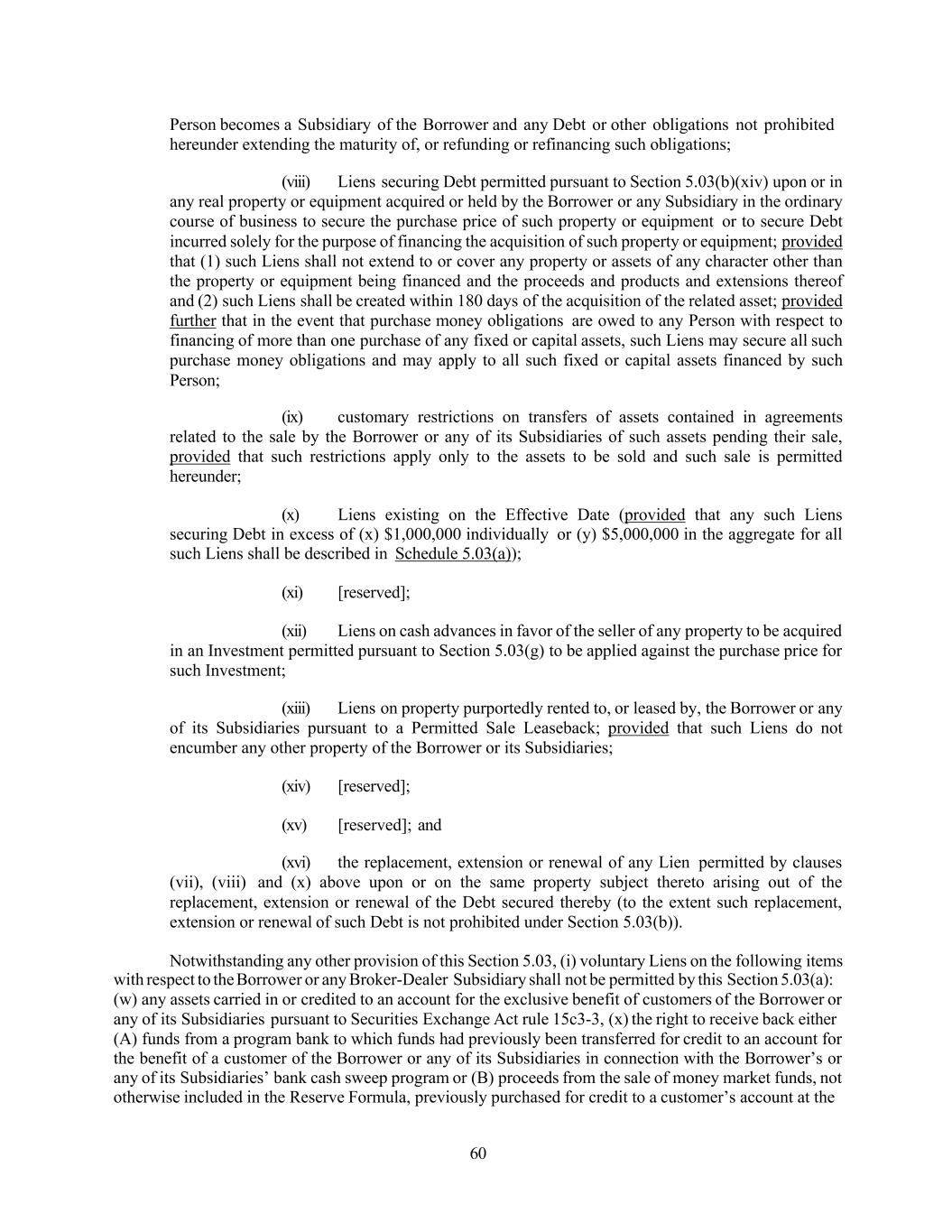 60 Person becomes a Subsidiary of the Borrower and any Debt or other obligations not prohibited hereunder extending the maturity of, or refunding or refinancing such obligations; (viii) Liens securing Debt permitted pursuant to Section 5.03(b)(xiv) upon or in any real property or equipment acquired or held by the Borrower or any Subsidiary in the ordinary course of business to secure the purchase price of such property or equipment or to secure Debt incurred solely for the purpose of financing the acquisition of such property or equipment; provided that (1) such Liens shall not extend to or cover any property or assets of any character other than the property or equipment being financed and the proceeds and products and extensions thereof and (2) such Liens shall be created within 180 days of the acquisition of the related asset; provided further that in the event that purchase money obligations are owed to any Person with respect to financing of more than one purchase of any fixed or capital assets, such Liens may secure all such purchase money obligations and may apply to all such fixed or capital assets financed by such Person; (ix) customary restrictions on transfers of assets contained in agreements related to the sale by the Borrower or any of its Subsidiaries of such assets pending their sale, provided that such restrictions apply only to the assets to be sold and such sale is permitted hereunder; (x) Liens existing on the Effective Date (provided that any such Liens securing Debt in excess of (x) $1,000,000 individually or (y) $5,000,000 in the aggregate for all such Liens shall be described in Schedule 5.03(a)); (xi) [reserved]; (xii) Liens on cash advances in favor of the seller of any property to be acquired in an Investment permitted pursuant to Section 5.03(g) to be applied against the purchase price for such Investment; (xiii) Liens on property purportedly rented to, or leased by, the Borrower or any of its Subsidiaries pursuant to a Permitted Sale Leaseback; provided that such Liens do not encumber any other property of the Borrower or its Subsidiaries; (xiv) [reserved]; (xv) [reserved]; and (xvi) the replacement, extension or renewal of any Lien permitted by clauses (vii), (viii) and (x) above upon or on the same property subject thereto arising out of the replacement, extension or renewal of the Debt secured thereby (to the extent such replacement, extension or renewal of such Debt is not prohibited under Section 5.03(b)). Notwithstanding any other provision of this Section 5.03, (i) voluntary Liens on the following items with respect to the Borrower or any Broker-Dealer Subsidiary shall not be permitted by this Section 5.03(a): (w) any assets carried in or credited to an account for the exclusive benefit of customers of the Borrower or any of its Subsidiaries pursuant to Securities Exchange Act rule 15c3-3, (x) the right to receive back either (A) funds from a program bank to which funds had previously been transferred for credit to an account for the benefit of a customer of the Borrower or any of its Subsidiaries in connection with the Borrower’s or any of its Subsidiaries’ bank cash sweep program or (B) proceeds from the sale of money market funds, not otherwise included in the Reserve Formula, previously purchased for credit to a customer’s account at the