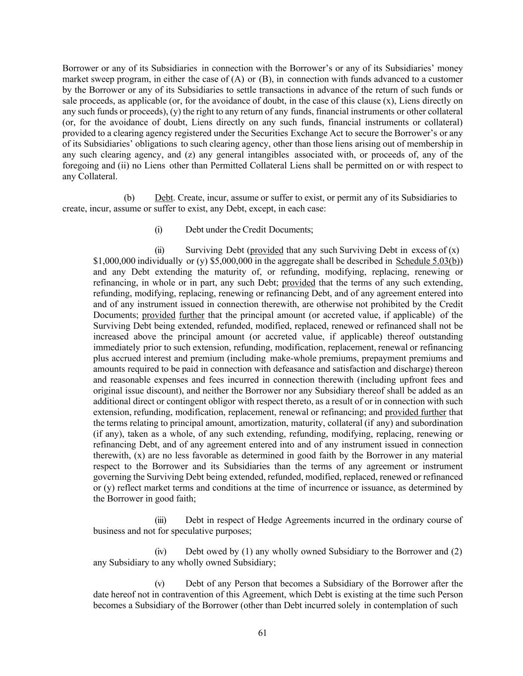 61 Borrower or any of its Subsidiaries in connection with the Borrower’s or any of its Subsidiaries’ money market sweep program, in either the case of (A) or (B), in connection with funds advanced to a customer by the Borrower or any of its Subsidiaries to settle transactions in advance of the return of such funds or sale proceeds, as applicable (or, for the avoidance of doubt, in the case of this clause (x), Liens directly on any such funds or proceeds), (y) the right to any return of any funds, financial instruments or other collateral (or, for the avoidance of doubt, Liens directly on any such funds, financial instruments or collateral) provided to a clearing agency registered under the Securities Exchange Act to secure the Borrower’s or any of its Subsidiaries’ obligations to such clearing agency, other than those liens arising out of membership in any such clearing agency, and (z) any general intangibles associated with, or proceeds of, any of the foregoing and (ii) no Liens other than Permitted Collateral Liens shall be permitted on or with respect to any Collateral. (b) Debt. Create, incur, assume or suffer to exist, or permit any of its Subsidiaries to create, incur, assume or suffer to exist, any Debt, except, in each case: (i) Debt under the Credit Documents; (ii) Surviving Debt (provided that any such Surviving Debt in excess of (x) $1,000,000 individually or (y) $5,000,000 in the aggregate shall be described in Schedule 5.03(b)) and any Debt extending the maturity of, or refunding, modifying, replacing, renewing or refinancing, in whole or in part, any such Debt; provided that the terms of any such extending, refunding, modifying, replacing, renewing or refinancing Debt, and of any agreement entered into and of any instrument issued in connection therewith, are otherwise not prohibited by the Credit Documents; provided further that the principal amount (or accreted value, if applicable) of the Surviving Debt being extended, refunded, modified, replaced, renewed or refinanced shall not be increased above the principal amount (or accreted value, if applicable) thereof outstanding immediately prior to such extension, refunding, modification, replacement, renewal or refinancing plus accrued interest and premium (including make-whole premiums, prepayment premiums and amounts required to be paid in connection with defeasance and satisfaction and discharge) thereon and reasonable expenses and fees incurred in connection therewith (including upfront fees and original issue discount), and neither the Borrower nor any Subsidiary thereof shall be added as an additional direct or contingent obligor with respect thereto, as a result of or in connection with such extension, refunding, modification, replacement, renewal or refinancing; and provided further that the terms relating to principal amount, amortization, maturity, collateral (if any) and subordination (if any), taken as a whole, of any such extending, refunding, modifying, replacing, renewing or refinancing Debt, and of any agreement entered into and of any instrument issued in connection therewith, (x) are no less favorable as determined in good faith by the Borrower in any material respect to the Borrower and its Subsidiaries than the terms of any agreement or instrument governing the Surviving Debt being extended, refunded, modified, replaced, renewed or refinanced or (y) reflect market terms and conditions at the time of incurrence or issuance, as determined by the Borrower in good faith; (iii) Debt in respect of Hedge Agreements incurred in the ordinary course of business and not for speculative purposes; (iv) Debt owed by (1) any wholly owned Subsidiary to the Borrower and (2) any Subsidiary to any wholly owned Subsidiary; (v) Debt of any Person that becomes a Subsidiary of the Borrower after the date hereof not in contravention of this Agreement, which Debt is existing at the time such Person becomes a Subsidiary of the Borrower (other than Debt incurred solely in contemplation of such
