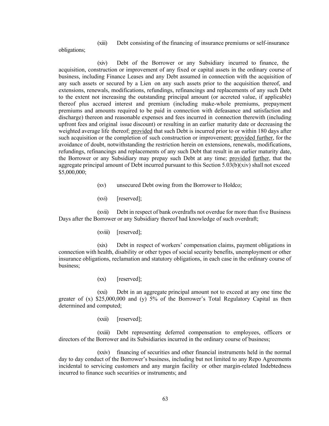 63 obligations; (xiii) Debt consisting of the financing of insurance premiums or self-insurance (xiv) Debt of the Borrower or any Subsidiary incurred to finance, the acquisition, construction or improvement of any fixed or capital assets in the ordinary course of business, including Finance Leases and any Debt assumed in connection with the acquisition of any such assets or secured by a Lien on any such assets prior to the acquisition thereof, and extensions, renewals, modifications, refundings, refinancings and replacements of any such Debt to the extent not increasing the outstanding principal amount (or accreted value, if applicable) thereof plus accrued interest and premium (including make-whole premiums, prepayment premiums and amounts required to be paid in connection with defeasance and satisfaction and discharge) thereon and reasonable expenses and fees incurred in connection therewith (including upfront fees and original issue discount) or resulting in an earlier maturity date or decreasing the weighted average life thereof; provided that such Debt is incurred prior to or within 180 days after such acquisition or the completion of such construction or improvement; provided further, for the avoidance of doubt, notwithstanding the restriction herein on extensions, renewals, modifications, refundings, refinancings and replacements of any such Debt that result in an earlier maturity date, the Borrower or any Subsidiary may prepay such Debt at any time; provided further, that the aggregate principal amount of Debt incurred pursuant to this Section 5.03(b)(xiv) shall not exceed $5,000,000; (xv) unsecured Debt owing from the Borrower to Holdco; (xvi) [reserved]; (xvii) Debt in respect of bank overdrafts not overdue for more than five Business Days after the Borrower or any Subsidiary thereof had knowledge of such overdraft; (xviii) [reserved]; (xix) Debt in respect of workers’ compensation claims, payment obligations in connection with health, disability or other types of social security benefits, unemployment or other insurance obligations, reclamation and statutory obligations, in each case in the ordinary course of business; (xx) [reserved]; (xxi) Debt in an aggregate principal amount not to exceed at any one time the greater of (x) $25,000,000 and (y) 5% of the Borrower’s Total Regulatory Capital as then determined and computed; (xxii) [reserved]; (xxiii) Debt representing deferred compensation to employees, officers or directors of the Borrower and its Subsidiaries incurred in the ordinary course of business; (xxiv) financing of securities and other financial instruments held in the normal day to day conduct of the Borrower’s business, including but not limited to any Repo Agreements incidental to servicing customers and any margin facility or other margin-related Indebtedness incurred to finance such securities or instruments; and