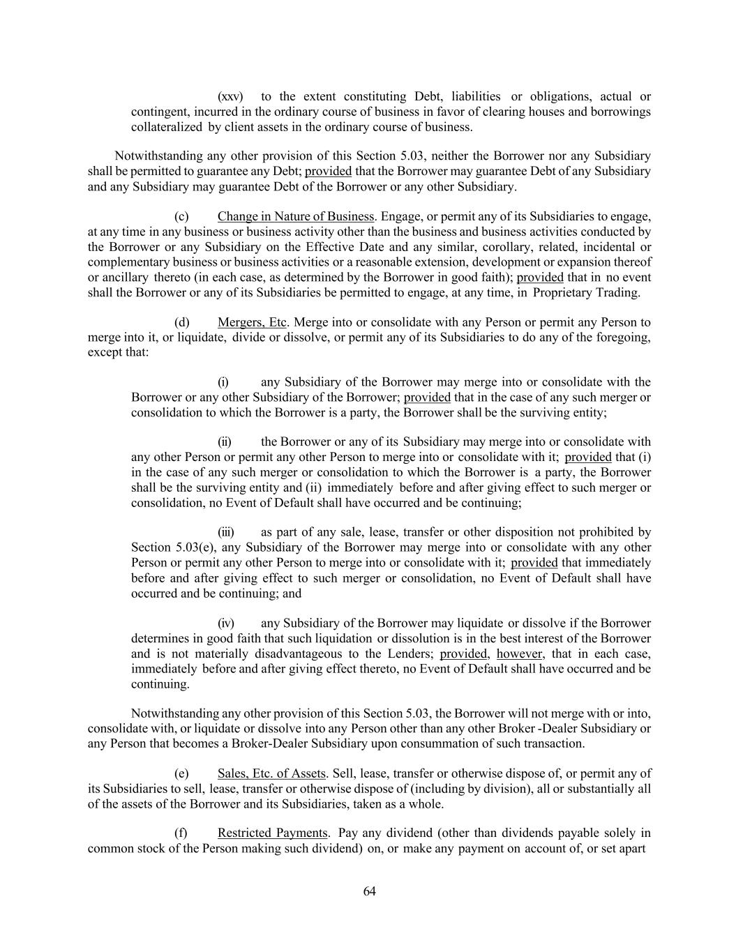 64 (xxv) to the extent constituting Debt, liabilities or obligations, actual or contingent, incurred in the ordinary course of business in favor of clearing houses and borrowings collateralized by client assets in the ordinary course of business. Notwithstanding any other provision of this Section 5.03, neither the Borrower nor any Subsidiary shall be permitted to guarantee any Debt; provided that the Borrower may guarantee Debt of any Subsidiary and any Subsidiary may guarantee Debt of the Borrower or any other Subsidiary. (c) Change in Nature of Business. Engage, or permit any of its Subsidiaries to engage, at any time in any business or business activity other than the business and business activities conducted by the Borrower or any Subsidiary on the Effective Date and any similar, corollary, related, incidental or complementary business or business activities or a reasonable extension, development or expansion thereof or ancillary thereto (in each case, as determined by the Borrower in good faith); provided that in no event shall the Borrower or any of its Subsidiaries be permitted to engage, at any time, in Proprietary Trading. (d) Mergers, Etc. Merge into or consolidate with any Person or permit any Person to merge into it, or liquidate, divide or dissolve, or permit any of its Subsidiaries to do any of the foregoing, except that: (i) any Subsidiary of the Borrower may merge into or consolidate with the Borrower or any other Subsidiary of the Borrower; provided that in the case of any such merger or consolidation to which the Borrower is a party, the Borrower shall be the surviving entity; (ii) the Borrower or any of its Subsidiary may merge into or consolidate with any other Person or permit any other Person to merge into or consolidate with it; provided that (i) in the case of any such merger or consolidation to which the Borrower is a party, the Borrower shall be the surviving entity and (ii) immediately before and after giving effect to such merger or consolidation, no Event of Default shall have occurred and be continuing; (iii) as part of any sale, lease, transfer or other disposition not prohibited by Section 5.03(e), any Subsidiary of the Borrower may merge into or consolidate with any other Person or permit any other Person to merge into or consolidate with it; provided that immediately before and after giving effect to such merger or consolidation, no Event of Default shall have occurred and be continuing; and (iv) any Subsidiary of the Borrower may liquidate or dissolve if the Borrower determines in good faith that such liquidation or dissolution is in the best interest of the Borrower and is not materially disadvantageous to the Lenders; provided, however, that in each case, immediately before and after giving effect thereto, no Event of Default shall have occurred and be continuing. Notwithstanding any other provision of this Section 5.03, the Borrower will not merge with or into, consolidate with, or liquidate or dissolve into any Person other than any other Broker -Dealer Subsidiary or any Person that becomes a Broker-Dealer Subsidiary upon consummation of such transaction. (e) Sales, Etc. of Assets. Sell, lease, transfer or otherwise dispose of, or permit any of its Subsidiaries to sell, lease, transfer or otherwise dispose of (including by division), all or substantially all of the assets of the Borrower and its Subsidiaries, taken as a whole. (f) Restricted Payments. Pay any dividend (other than dividends payable solely in common stock of the Person making such dividend) on, or make any payment on account of, or set apart
