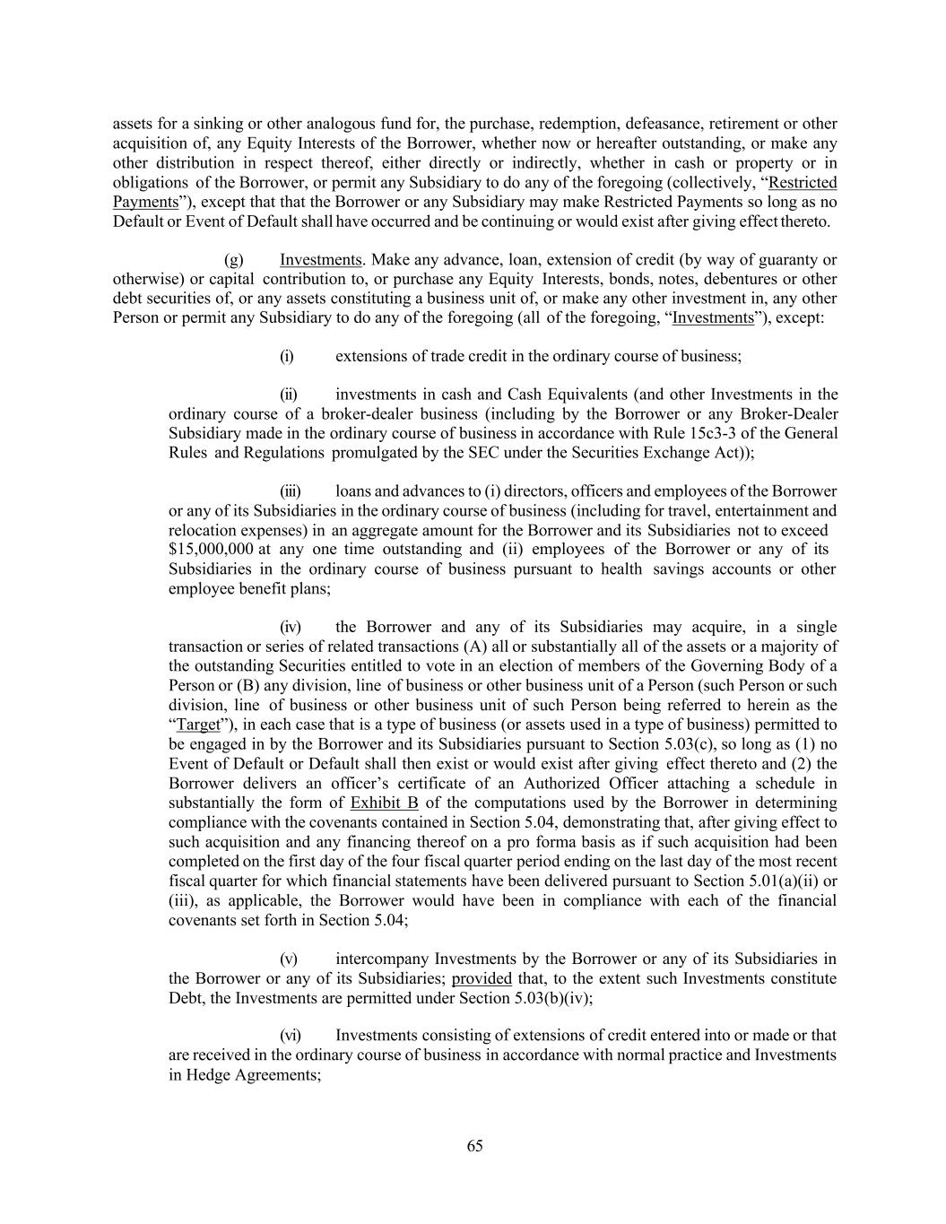 65 assets for a sinking or other analogous fund for, the purchase, redemption, defeasance, retirement or other acquisition of, any Equity Interests of the Borrower, whether now or hereafter outstanding, or make any other distribution in respect thereof, either directly or indirectly, whether in cash or property or in obligations of the Borrower, or permit any Subsidiary to do any of the foregoing (collectively, “Restricted Payments”), except that that the Borrower or any Subsidiary may make Restricted Payments so long as no Default or Event of Default shall have occurred and be continuing or would exist after giving effect thereto. (g) Investments. Make any advance, loan, extension of credit (by way of guaranty or otherwise) or capital contribution to, or purchase any Equity Interests, bonds, notes, debentures or other debt securities of, or any assets constituting a business unit of, or make any other investment in, any other Person or permit any Subsidiary to do any of the foregoing (all of the foregoing, “Investments”), except: (i) extensions of trade credit in the ordinary course of business; (ii) investments in cash and Cash Equivalents (and other Investments in the ordinary course of a broker-dealer business (including by the Borrower or any Broker-Dealer Subsidiary made in the ordinary course of business in accordance with Rule 15c3-3 of the General Rules and Regulations promulgated by the SEC under the Securities Exchange Act)); (iii) loans and advances to (i) directors, officers and employees of the Borrower or any of its Subsidiaries in the ordinary course of business (including for travel, entertainment and relocation expenses) in an aggregate amount for the Borrower and its Subsidiaries not to exceed $15,000,000 at any one time outstanding and (ii) employees of the Borrower or any of its Subsidiaries in the ordinary course of business pursuant to health savings accounts or other employee benefit plans; (iv) the Borrower and any of its Subsidiaries may acquire, in a single transaction or series of related transactions (A) all or substantially all of the assets or a majority of the outstanding Securities entitled to vote in an election of members of the Governing Body of a Person or (B) any division, line of business or other business unit of a Person (such Person or such division, line of business or other business unit of such Person being referred to herein as the “Target”), in each case that is a type of business (or assets used in a type of business) permitted to be engaged in by the Borrower and its Subsidiaries pursuant to Section 5.03(c), so long as (1) no Event of Default or Default shall then exist or would exist after giving effect thereto and (2) the Borrower delivers an officer’s certificate of an Authorized Officer attaching a schedule in substantially the form of Exhibit B of the computations used by the Borrower in determining compliance with the covenants contained in Section 5.04, demonstrating that, after giving effect to such acquisition and any financing thereof on a pro forma basis as if such acquisition had been completed on the first day of the four fiscal quarter period ending on the last day of the most recent fiscal quarter for which financial statements have been delivered pursuant to Section 5.01(a)(ii) or (iii), as applicable, the Borrower would have been in compliance with each of the financial covenants set forth in Section 5.04; (v) intercompany Investments by the Borrower or any of its Subsidiaries in the Borrower or any of its Subsidiaries; provided that, to the extent such Investments constitute Debt, the Investments are permitted under Section 5.03(b)(iv); (vi) Investments consisting of extensions of credit entered into or made or that are received in the ordinary course of business in accordance with normal practice and Investments in Hedge Agreements;