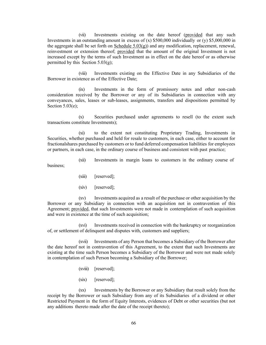 66 (vii) Investments existing on the date hereof (provided that any such Investments in an outstanding amount in excess of (x) $500,000 individually or (y) $5,000,000 in the aggregate shall be set forth on Schedule 5.03(g)) and any modification, replacement, renewal, reinvestment or extension thereof; provided that the amount of the original Investment is not increased except by the terms of such Investment as in effect on the date hereof or as otherwise permitted by this Section 5.03(g); (viii) Investments existing on the Effective Date in any Subsidiaries of the Borrower in existence as of the Effective Date; (ix) Investments in the form of promissory notes and other non-cash consideration received by the Borrower or any of its Subsidiaries in connection with any conveyances, sales, leases or sub-leases, assignments, transfers and dispositions permitted by Section 5.03(e); (x) Securities purchased under agreements to resell (to the extent such transactions constitute Investments); (xi) to the extent not constituting Proprietary Trading, Investments in Securities, whether purchased and held for resale to customers, in each case, either to account for fractionalshares purchased by customers or to fund deferred compensation liabilities for employees or partners, in each case, in the ordinary course of business and consistent with past practice; (xii) Investments in margin loans to customers in the ordinary course of business; (xiii) [reserved]; (xiv) [reserved]; (xv) Investments acquired as a result of the purchase or other acquisition by the Borrower or any Subsidiary in connection with an acquisition not in contravention of this Agreement; provided, that such Investments were not made in contemplation of such acquisition and were in existence at the time of such acquisition; (xvi) Investments received in connection with the bankruptcy or reorganization of, or settlement of delinquent and disputes with, customers and suppliers; (xvii) Investments of any Person that becomes a Subsidiary of the Borrower after the date hereof not in contravention of this Agreement, to the extent that such Investments are existing at the time such Person becomes a Subsidiary of the Borrower and were not made solely in contemplation of such Person becoming a Subsidiary of the Borrower; (xviii) [reserved]; (xix) [reserved]; (xx) Investments by the Borrower or any Subsidiary that result solely from the receipt by the Borrower or such Subsidiary from any of its Subsidiaries of a dividend or other Restricted Payment in the form of Equity Interests, evidences of Debt or other securities (but not any additions thereto made after the date of the receipt thereto);