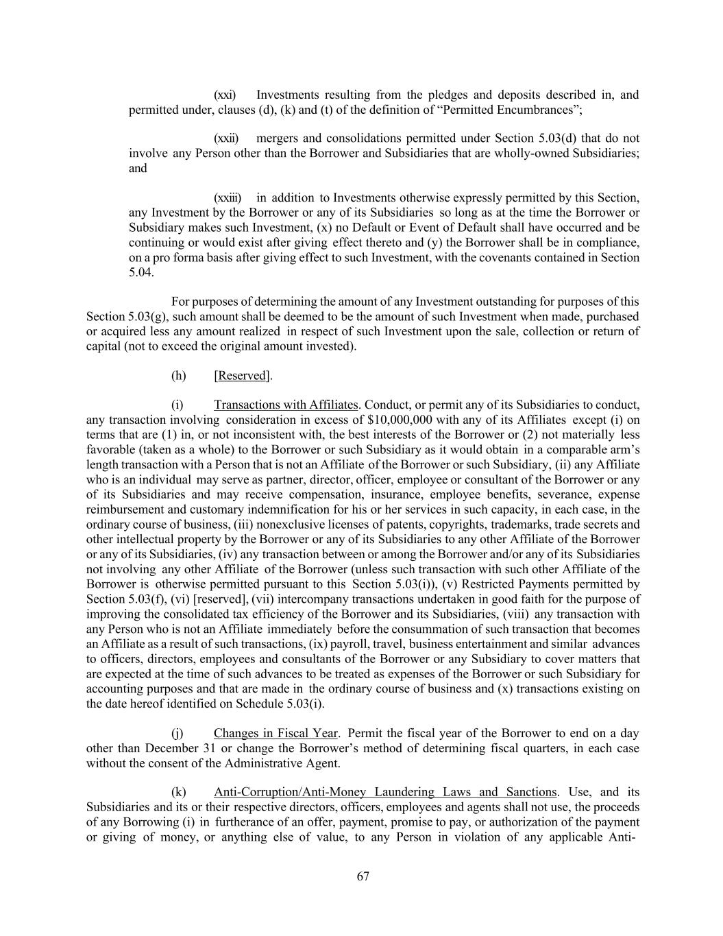67 (xxi) Investments resulting from the pledges and deposits described in, and permitted under, clauses (d), (k) and (t) of the definition of “Permitted Encumbrances”; (xxii) mergers and consolidations permitted under Section 5.03(d) that do not involve any Person other than the Borrower and Subsidiaries that are wholly-owned Subsidiaries; and (xxiii) in addition to Investments otherwise expressly permitted by this Section, any Investment by the Borrower or any of its Subsidiaries so long as at the time the Borrower or Subsidiary makes such Investment, (x) no Default or Event of Default shall have occurred and be continuing or would exist after giving effect thereto and (y) the Borrower shall be in compliance, on a pro forma basis after giving effect to such Investment, with the covenants contained in Section 5.04. For purposes of determining the amount of any Investment outstanding for purposes of this Section 5.03(g), such amount shall be deemed to be the amount of such Investment when made, purchased or acquired less any amount realized in respect of such Investment upon the sale, collection or return of capital (not to exceed the original amount invested). (h) [Reserved]. (i) Transactions with Affiliates. Conduct, or permit any of its Subsidiaries to conduct, any transaction involving consideration in excess of $10,000,000 with any of its Affiliates except (i) on terms that are (1) in, or not inconsistent with, the best interests of the Borrower or (2) not materially less favorable (taken as a whole) to the Borrower or such Subsidiary as it would obtain in a comparable arm’s length transaction with a Person that is not an Affiliate of the Borrower or such Subsidiary, (ii) any Affiliate who is an individual may serve as partner, director, officer, employee or consultant of the Borrower or any of its Subsidiaries and may receive compensation, insurance, employee benefits, severance, expense reimbursement and customary indemnification for his or her services in such capacity, in each case, in the ordinary course of business, (iii) nonexclusive licenses of patents, copyrights, trademarks, trade secrets and other intellectual property by the Borrower or any of its Subsidiaries to any other Affiliate of the Borrower or any of its Subsidiaries, (iv) any transaction between or among the Borrower and/or any of its Subsidiaries not involving any other Affiliate of the Borrower (unless such transaction with such other Affiliate of the Borrower is otherwise permitted pursuant to this Section 5.03(i)), (v) Restricted Payments permitted by Section 5.03(f), (vi) [reserved], (vii) intercompany transactions undertaken in good faith for the purpose of improving the consolidated tax efficiency of the Borrower and its Subsidiaries, (viii) any transaction with any Person who is not an Affiliate immediately before the consummation of such transaction that becomes an Affiliate as a result of such transactions, (ix) payroll, travel, business entertainment and similar advances to officers, directors, employees and consultants of the Borrower or any Subsidiary to cover matters that are expected at the time of such advances to be treated as expenses of the Borrower or such Subsidiary for accounting purposes and that are made in the ordinary course of business and (x) transactions existing on the date hereof identified on Schedule 5.03(i). (j) Changes in Fiscal Year. Permit the fiscal year of the Borrower to end on a day other than December 31 or change the Borrower’s method of determining fiscal quarters, in each case without the consent of the Administrative Agent. (k) Anti-Corruption/Anti-Money Laundering Laws and Sanctions. Use, and its Subsidiaries and its or their respective directors, officers, employees and agents shall not use, the proceeds of any Borrowing (i) in furtherance of an offer, payment, promise to pay, or authorization of the payment or giving of money, or anything else of value, to any Person in violation of any applicable Anti-