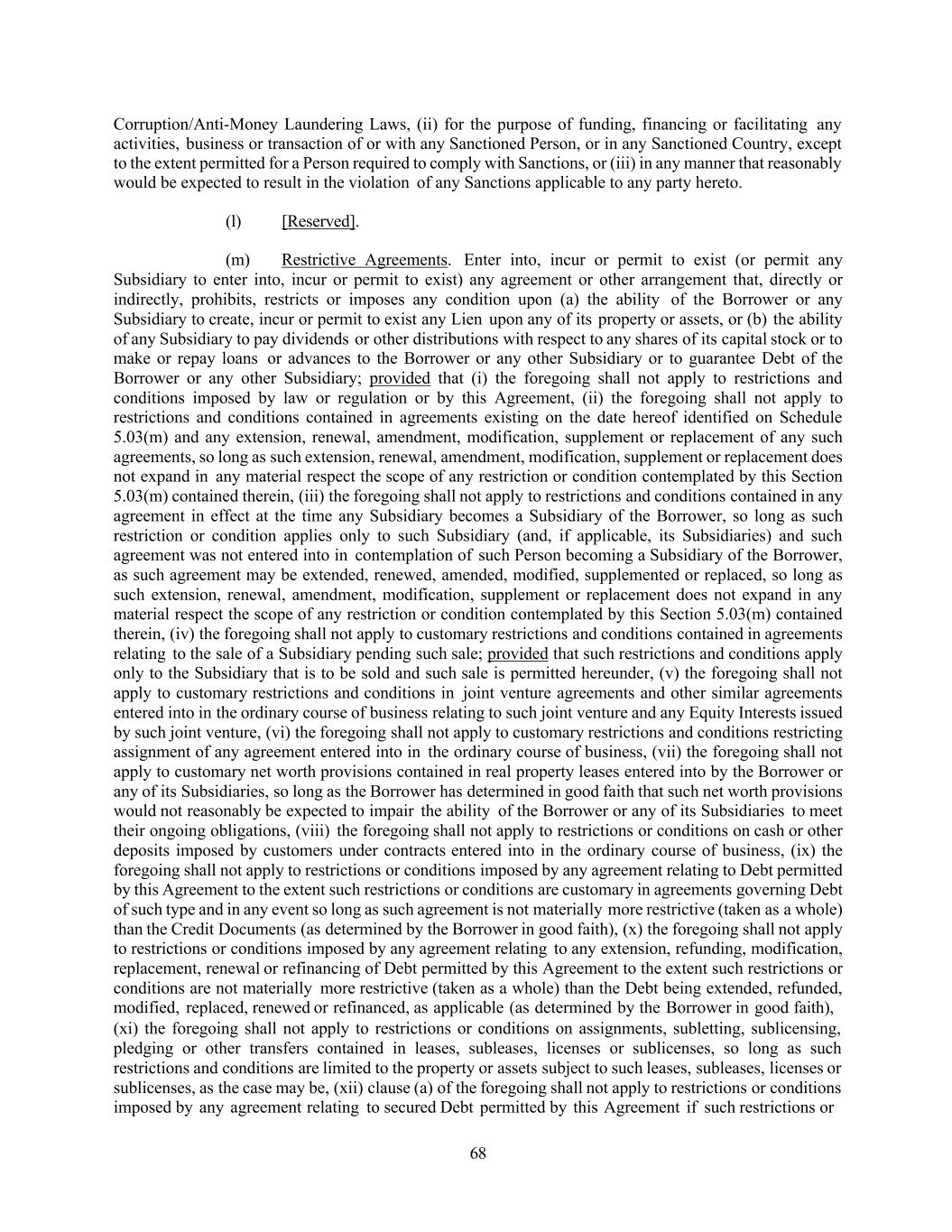 68 Corruption/Anti-Money Laundering Laws, (ii) for the purpose of funding, financing or facilitating any activities, business or transaction of or with any Sanctioned Person, or in any Sanctioned Country, except to the extent permitted for a Person required to comply with Sanctions, or (iii) in any manner that reasonably would be expected to result in the violation of any Sanctions applicable to any party hereto. (l) [Reserved]. (m) Restrictive Agreements. Enter into, incur or permit to exist (or permit any Subsidiary to enter into, incur or permit to exist) any agreement or other arrangement that, directly or indirectly, prohibits, restricts or imposes any condition upon (a) the ability of the Borrower or any Subsidiary to create, incur or permit to exist any Lien upon any of its property or assets, or (b) the ability of any Subsidiary to pay dividends or other distributions with respect to any shares of its capital stock or to make or repay loans or advances to the Borrower or any other Subsidiary or to guarantee Debt of the Borrower or any other Subsidiary; provided that (i) the foregoing shall not apply to restrictions and conditions imposed by law or regulation or by this Agreement, (ii) the foregoing shall not apply to restrictions and conditions contained in agreements existing on the date hereof identified on Schedule 5.03(m) and any extension, renewal, amendment, modification, supplement or replacement of any such agreements, so long as such extension, renewal, amendment, modification, supplement or replacement does not expand in any material respect the scope of any restriction or condition contemplated by this Section 5.03(m) contained therein, (iii) the foregoing shall not apply to restrictions and conditions contained in any agreement in effect at the time any Subsidiary becomes a Subsidiary of the Borrower, so long as such restriction or condition applies only to such Subsidiary (and, if applicable, its Subsidiaries) and such agreement was not entered into in contemplation of such Person becoming a Subsidiary of the Borrower, as such agreement may be extended, renewed, amended, modified, supplemented or replaced, so long as such extension, renewal, amendment, modification, supplement or replacement does not expand in any material respect the scope of any restriction or condition contemplated by this Section 5.03(m) contained therein, (iv) the foregoing shall not apply to customary restrictions and conditions contained in agreements relating to the sale of a Subsidiary pending such sale; provided that such restrictions and conditions apply only to the Subsidiary that is to be sold and such sale is permitted hereunder, (v) the foregoing shall not apply to customary restrictions and conditions in joint venture agreements and other similar agreements entered into in the ordinary course of business relating to such joint venture and any Equity Interests issued by such joint venture, (vi) the foregoing shall not apply to customary restrictions and conditions restricting assignment of any agreement entered into in the ordinary course of business, (vii) the foregoing shall not apply to customary net worth provisions contained in real property leases entered into by the Borrower or any of its Subsidiaries, so long as the Borrower has determined in good faith that such net worth provisions would not reasonably be expected to impair the ability of the Borrower or any of its Subsidiaries to meet their ongoing obligations, (viii) the foregoing shall not apply to restrictions or conditions on cash or other deposits imposed by customers under contracts entered into in the ordinary course of business, (ix) the foregoing shall not apply to restrictions or conditions imposed by any agreement relating to Debt permitted by this Agreement to the extent such restrictions or conditions are customary in agreements governing Debt of such type and in any event so long as such agreement is not materially more restrictive (taken as a whole) than the Credit Documents (as determined by the Borrower in good faith), (x) the foregoing shall not apply to restrictions or conditions imposed by any agreement relating to any extension, refunding, modification, replacement, renewal or refinancing of Debt permitted by this Agreement to the extent such restrictions or conditions are not materially more restrictive (taken as a whole) than the Debt being extended, refunded, modified, replaced, renewed or refinanced, as applicable (as determined by the Borrower in good faith), (xi) the foregoing shall not apply to restrictions or conditions on assignments, subletting, sublicensing, pledging or other transfers contained in leases, subleases, licenses or sublicenses, so long as such restrictions and conditions are limited to the property or assets subject to such leases, subleases, licenses or sublicenses, as the case may be, (xii) clause (a) of the foregoing shall not apply to restrictions or conditions imposed by any agreement relating to secured Debt permitted by this Agreement if such restrictions or