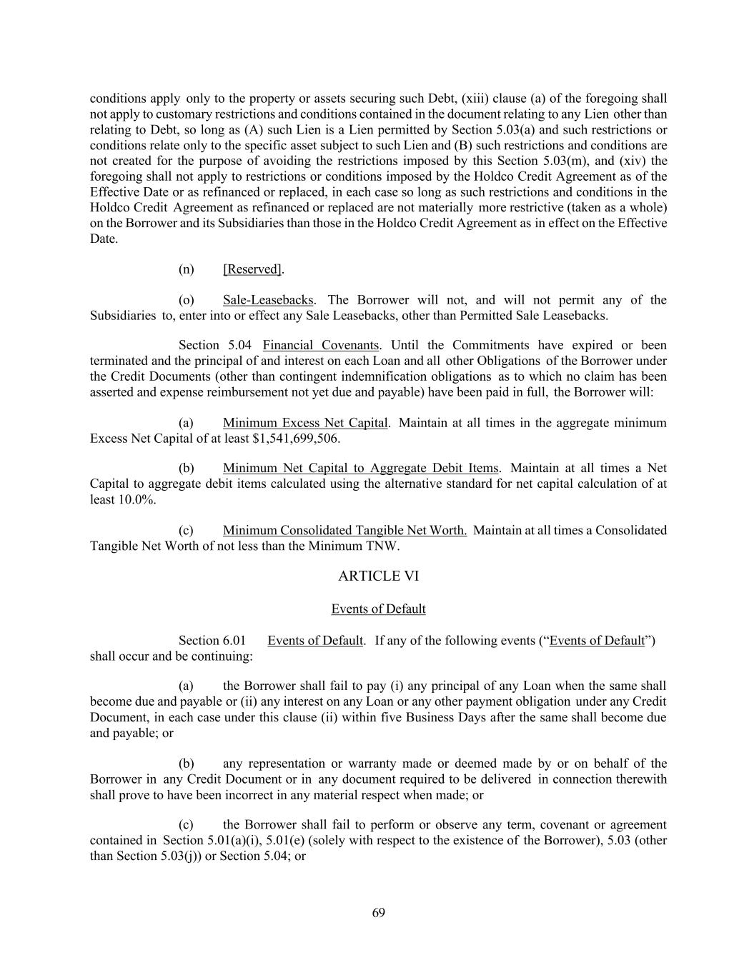 69 conditions apply only to the property or assets securing such Debt, (xiii) clause (a) of the foregoing shall not apply to customary restrictions and conditions contained in the document relating to any Lien other than relating to Debt, so long as (A) such Lien is a Lien permitted by Section 5.03(a) and such restrictions or conditions relate only to the specific asset subject to such Lien and (B) such restrictions and conditions are not created for the purpose of avoiding the restrictions imposed by this Section 5.03(m), and (xiv) the foregoing shall not apply to restrictions or conditions imposed by the Holdco Credit Agreement as of the Effective Date or as refinanced or replaced, in each case so long as such restrictions and conditions in the Holdco Credit Agreement as refinanced or replaced are not materially more restrictive (taken as a whole) on the Borrower and its Subsidiaries than those in the Holdco Credit Agreement as in effect on the Effective Date. (n) [Reserved]. (o) Sale-Leasebacks. The Borrower will not, and will not permit any of the Subsidiaries to, enter into or effect any Sale Leasebacks, other than Permitted Sale Leasebacks. Section 5.04 Financial Covenants. Until the Commitments have expired or been terminated and the principal of and interest on each Loan and all other Obligations of the Borrower under the Credit Documents (other than contingent indemnification obligations as to which no claim has been asserted and expense reimbursement not yet due and payable) have been paid in full, the Borrower will: (a) Minimum Excess Net Capital. Maintain at all times in the aggregate minimum Excess Net Capital of at least $1,541,699,506. (b) Minimum Net Capital to Aggregate Debit Items. Maintain at all times a Net Capital to aggregate debit items calculated using the alternative standard for net capital calculation of at least 10.0%. (c) Minimum Consolidated Tangible Net Worth. Maintain at all times a Consolidated Tangible Net Worth of not less than the Minimum TNW. ARTICLE VI Events of Default Section 6.01 Events of Default. If any of the following events (“Events of Default”) shall occur and be continuing: (a) the Borrower shall fail to pay (i) any principal of any Loan when the same shall become due and payable or (ii) any interest on any Loan or any other payment obligation under any Credit Document, in each case under this clause (ii) within five Business Days after the same shall become due and payable; or (b) any representation or warranty made or deemed made by or on behalf of the Borrower in any Credit Document or in any document required to be delivered in connection therewith shall prove to have been incorrect in any material respect when made; or (c) the Borrower shall fail to perform or observe any term, covenant or agreement contained in Section 5.01(a)(i), 5.01(e) (solely with respect to the existence of the Borrower), 5.03 (other than Section 5.03(j)) or Section 5.04; or
