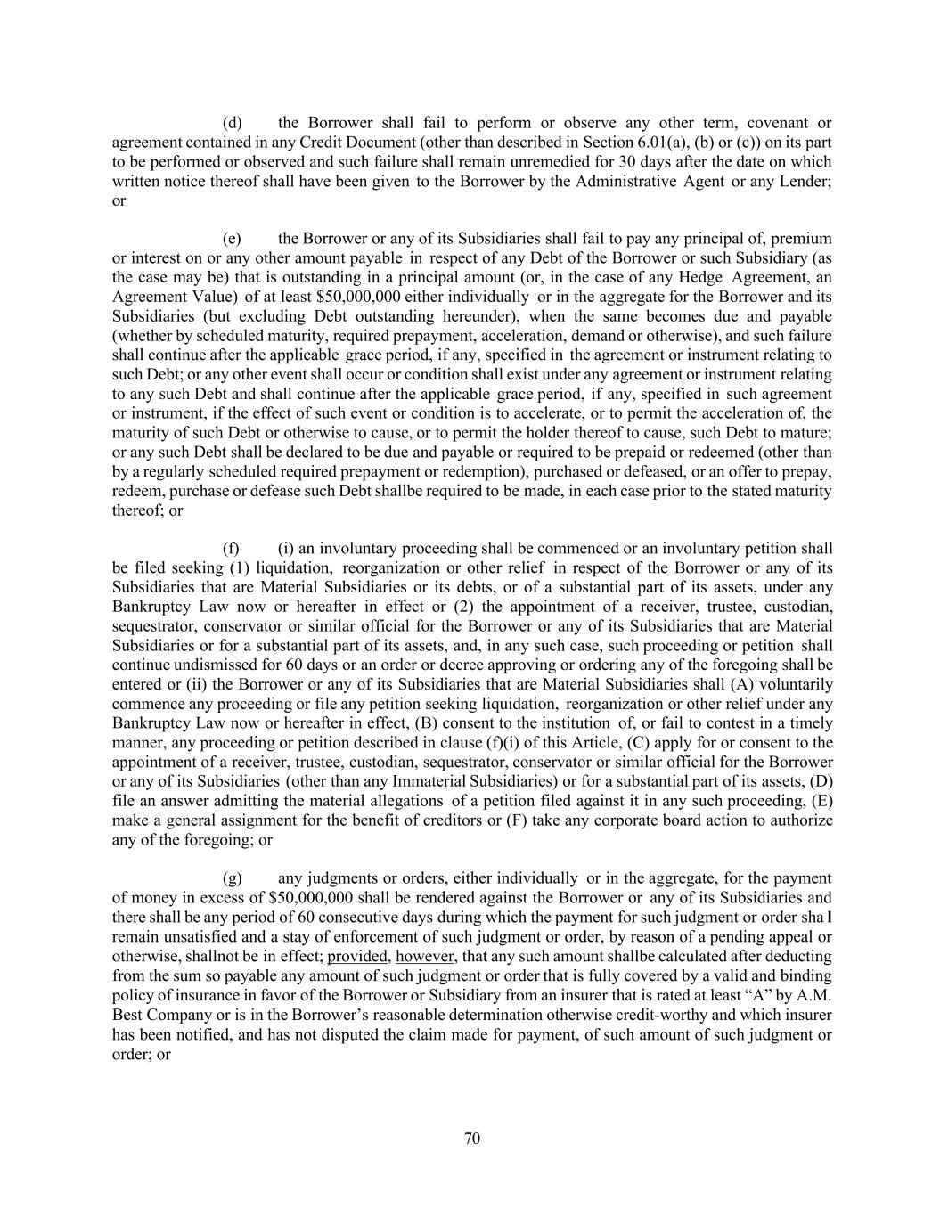 70 (d) the Borrower shall fail to perform or observe any other term, covenant or agreement contained in any Credit Document (other than described in Section 6.01(a), (b) or (c)) on its part to be performed or observed and such failure shall remain unremedied for 30 days after the date on which written notice thereof shall have been given to the Borrower by the Administrative Agent or any Lender; or (e) the Borrower or any of its Subsidiaries shall fail to pay any principal of, premium or interest on or any other amount payable in respect of any Debt of the Borrower or such Subsidiary (as the case may be) that is outstanding in a principal amount (or, in the case of any Hedge Agreement, an Agreement Value) of at least $50,000,000 either individually or in the aggregate for the Borrower and its Subsidiaries (but excluding Debt outstanding hereunder), when the same becomes due and payable (whether by scheduled maturity, required prepayment, acceleration, demand or otherwise), and such failure shall continue after the applicable grace period, if any, specified in the agreement or instrument relating to such Debt; or any other event shall occur or condition shall exist under any agreement or instrument relating to any such Debt and shall continue after the applicable grace period, if any, specified in such agreement or instrument, if the effect of such event or condition is to accelerate, or to permit the acceleration of, the maturity of such Debt or otherwise to cause, or to permit the holder thereof to cause, such Debt to mature; or any such Debt shall be declared to be due and payable or required to be prepaid or redeemed (other than by a regularly scheduled required prepayment or redemption), purchased or defeased, or an offer to prepay, redeem, purchase or defease such Debt shallbe required to be made, in each case prior to the stated maturity thereof; or (f) (i) an involuntary proceeding shall be commenced or an involuntary petition shall be filed seeking (1) liquidation, reorganization or other relief in respect of the Borrower or any of its Subsidiaries that are Material Subsidiaries or its debts, or of a substantial part of its assets, under any Bankruptcy Law now or hereafter in effect or (2) the appointment of a receiver, trustee, custodian, sequestrator, conservator or similar official for the Borrower or any of its Subsidiaries that are Material Subsidiaries or for a substantial part of its assets, and, in any such case, such proceeding or petition shall continue undismissed for 60 days or an order or decree approving or ordering any of the foregoing shall be entered or (ii) the Borrower or any of its Subsidiaries that are Material Subsidiaries shall (A) voluntarily commence any proceeding or file any petition seeking liquidation, reorganization or other relief under any Bankruptcy Law now or hereafter in effect, (B) consent to the institution of, or fail to contest in a timely manner, any proceeding or petition described in clause (f)(i) of this Article, (C) apply for or consent to the appointment of a receiver, trustee, custodian, sequestrator, conservator or similar official for the Borrower or any of its Subsidiaries (other than any Immaterial Subsidiaries) or for a substantial part of its assets, (D) file an answer admitting the material allegations of a petition filed against it in any such proceeding, (E) make a general assignment for the benefit of creditors or (F) take any corporate board action to authorize any of the foregoing; or (g) any judgments or orders, either individually or in the aggregate, for the payment of money in excess of $50,000,000 shall be rendered against the Borrower or any of its Subsidiaries and there shall be any period of 60 consecutive days during which the payment for such judgment or order sha l remain unsatisfied and a stay of enforcement of such judgment or order, by reason of a pending appeal or otherwise, shallnot be in effect; provided, however, that any such amount shallbe calculated after deducting from the sum so payable any amount of such judgment or order that is fully covered by a valid and binding policy of insurance in favor of the Borrower or Subsidiary from an insurer that is rated at least “A” by A.M. Best Company or is in the Borrower’s reasonable determination otherwise credit-worthy and which insurer has been notified, and has not disputed the claim made for payment, of such amount of such judgment or order; or