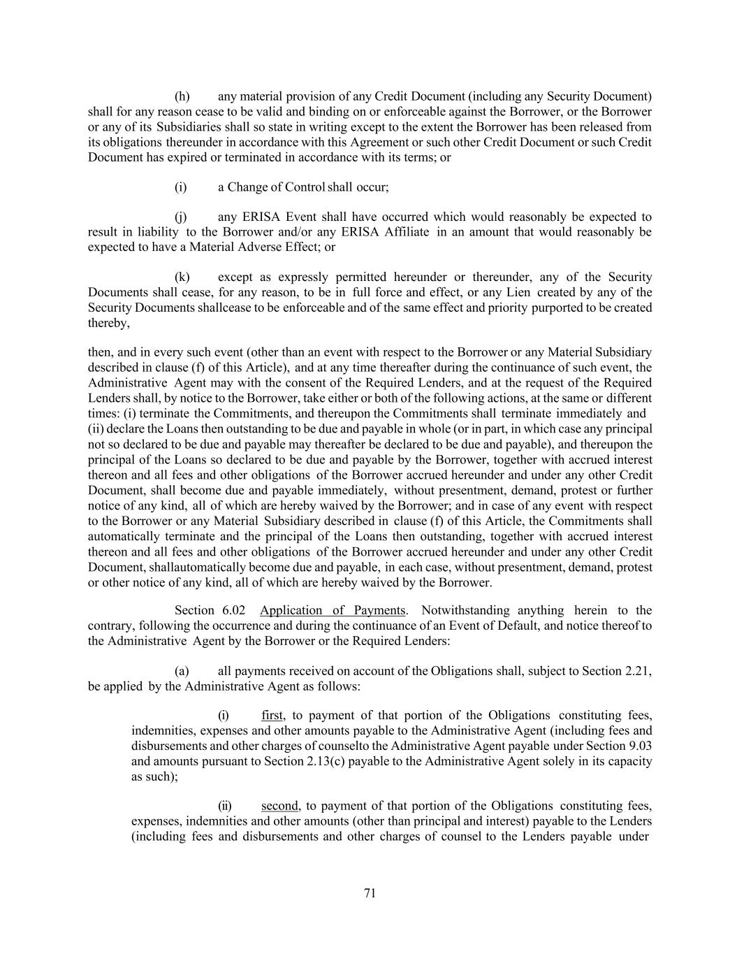 71 (h) any material provision of any Credit Document (including any Security Document) shall for any reason cease to be valid and binding on or enforceable against the Borrower, or the Borrower or any of its Subsidiaries shall so state in writing except to the extent the Borrower has been released from its obligations thereunder in accordance with this Agreement or such other Credit Document or such Credit Document has expired or terminated in accordance with its terms; or (i) a Change of Control shall occur; (j) any ERISA Event shall have occurred which would reasonably be expected to result in liability to the Borrower and/or any ERISA Affiliate in an amount that would reasonably be expected to have a Material Adverse Effect; or (k) except as expressly permitted hereunder or thereunder, any of the Security Documents shall cease, for any reason, to be in full force and effect, or any Lien created by any of the Security Documents shallcease to be enforceable and of the same effect and priority purported to be created thereby, then, and in every such event (other than an event with respect to the Borrower or any Material Subsidiary described in clause (f) of this Article), and at any time thereafter during the continuance of such event, the Administrative Agent may with the consent of the Required Lenders, and at the request of the Required Lenders shall, by notice to the Borrower, take either or both of the following actions, at the same or different times: (i) terminate the Commitments, and thereupon the Commitments shall terminate immediately and (ii) declare the Loans then outstanding to be due and payable in whole (or in part, in which case any principal not so declared to be due and payable may thereafter be declared to be due and payable), and thereupon the principal of the Loans so declared to be due and payable by the Borrower, together with accrued interest thereon and all fees and other obligations of the Borrower accrued hereunder and under any other Credit Document, shall become due and payable immediately, without presentment, demand, protest or further notice of any kind, all of which are hereby waived by the Borrower; and in case of any event with respect to the Borrower or any Material Subsidiary described in clause (f) of this Article, the Commitments shall automatically terminate and the principal of the Loans then outstanding, together with accrued interest thereon and all fees and other obligations of the Borrower accrued hereunder and under any other Credit Document, shallautomatically become due and payable, in each case, without presentment, demand, protest or other notice of any kind, all of which are hereby waived by the Borrower. Section 6.02 Application of Payments. Notwithstanding anything herein to the contrary, following the occurrence and during the continuance of an Event of Default, and notice thereof to the Administrative Agent by the Borrower or the Required Lenders: (a) all payments received on account of the Obligations shall, subject to Section 2.21, be applied by the Administrative Agent as follows: (i) first, to payment of that portion of the Obligations constituting fees, indemnities, expenses and other amounts payable to the Administrative Agent (including fees and disbursements and other charges of counselto the Administrative Agent payable under Section 9.03 and amounts pursuant to Section 2.13(c) payable to the Administrative Agent solely in its capacity as such); (ii) second, to payment of that portion of the Obligations constituting fees, expenses, indemnities and other amounts (other than principal and interest) payable to the Lenders (including fees and disbursements and other charges of counsel to the Lenders payable under