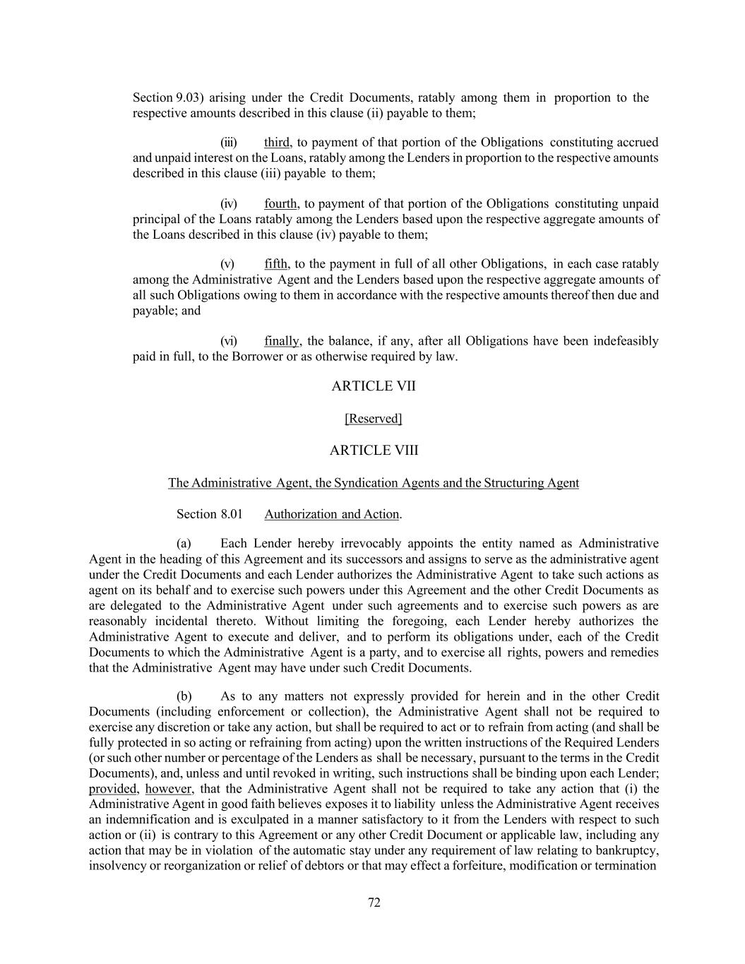 72 Section 9.03) arising under the Credit Documents, ratably among them in proportion to the respective amounts described in this clause (ii) payable to them; (iii) third, to payment of that portion of the Obligations constituting accrued and unpaid interest on the Loans, ratably among the Lenders in proportion to the respective amounts described in this clause (iii) payable to them; (iv) fourth, to payment of that portion of the Obligations constituting unpaid principal of the Loans ratably among the Lenders based upon the respective aggregate amounts of the Loans described in this clause (iv) payable to them; (v) fifth, to the payment in full of all other Obligations, in each case ratably among the Administrative Agent and the Lenders based upon the respective aggregate amounts of all such Obligations owing to them in accordance with the respective amounts thereof then due and payable; and (vi) finally, the balance, if any, after all Obligations have been indefeasibly paid in full, to the Borrower or as otherwise required by law. ARTICLE VII [Reserved] ARTICLE VIII The Administrative Agent, the Syndication Agents and the Structuring Agent Section 8.01 Authorization and Action. (a) Each Lender hereby irrevocably appoints the entity named as Administrative Agent in the heading of this Agreement and its successors and assigns to serve as the administrative agent under the Credit Documents and each Lender authorizes the Administrative Agent to take such actions as agent on its behalf and to exercise such powers under this Agreement and the other Credit Documents as are delegated to the Administrative Agent under such agreements and to exercise such powers as are reasonably incidental thereto. Without limiting the foregoing, each Lender hereby authorizes the Administrative Agent to execute and deliver, and to perform its obligations under, each of the Credit Documents to which the Administrative Agent is a party, and to exercise all rights, powers and remedies that the Administrative Agent may have under such Credit Documents. (b) As to any matters not expressly provided for herein and in the other Credit Documents (including enforcement or collection), the Administrative Agent shall not be required to exercise any discretion or take any action, but shall be required to act or to refrain from acting (and shall be fully protected in so acting or refraining from acting) upon the written instructions of the Required Lenders (or such other number or percentage of the Lenders as shall be necessary, pursuant to the terms in the Credit Documents), and, unless and until revoked in writing, such instructions shall be binding upon each Lender; provided, however, that the Administrative Agent shall not be required to take any action that (i) the Administrative Agent in good faith believes exposes it to liability unless the Administrative Agent receives an indemnification and is exculpated in a manner satisfactory to it from the Lenders with respect to such action or (ii) is contrary to this Agreement or any other Credit Document or applicable law, including any action that may be in violation of the automatic stay under any requirement of law relating to bankruptcy, insolvency or reorganization or relief of debtors or that may effect a forfeiture, modification or termination