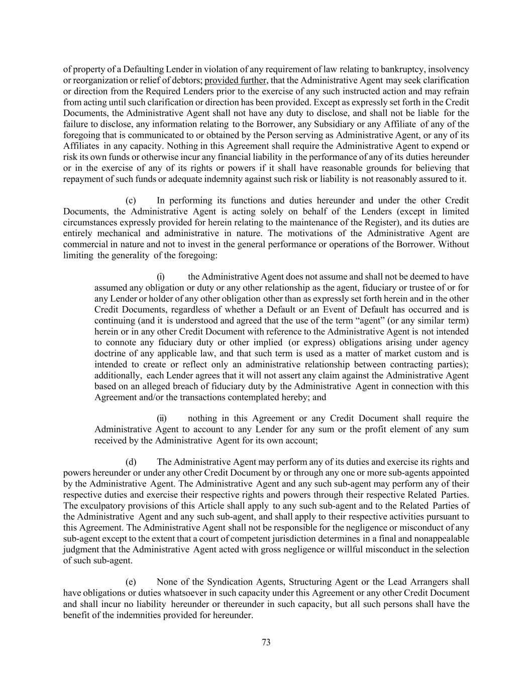 73 of property of a Defaulting Lender in violation of any requirement of law relating to bankruptcy, insolvency or reorganization or relief of debtors; provided further, that the Administrative Agent may seek clarification or direction from the Required Lenders prior to the exercise of any such instructed action and may refrain from acting until such clarification or direction has been provided. Except as expressly set forth in the Credit Documents, the Administrative Agent shall not have any duty to disclose, and shall not be liable for the failure to disclose, any information relating to the Borrower, any Subsidiary or any Affiliate of any of the foregoing that is communicated to or obtained by the Person serving as Administrative Agent, or any of its Affiliates in any capacity. Nothing in this Agreement shall require the Administrative Agent to expend or risk its own funds or otherwise incur any financial liability in the performance of any of its duties hereunder or in the exercise of any of its rights or powers if it shall have reasonable grounds for believing that repayment of such funds or adequate indemnity against such risk or liability is not reasonably assured to it. (c) In performing its functions and duties hereunder and under the other Credit Documents, the Administrative Agent is acting solely on behalf of the Lenders (except in limited circumstances expressly provided for herein relating to the maintenance of the Register), and its duties are entirely mechanical and administrative in nature. The motivations of the Administrative Agent are commercial in nature and not to invest in the general performance or operations of the Borrower. Without limiting the generality of the foregoing: (i) the Administrative Agent does not assume and shall not be deemed to have assumed any obligation or duty or any other relationship as the agent, fiduciary or trustee of or for any Lender or holder of any other obligation other than as expressly set forth herein and in the other Credit Documents, regardless of whether a Default or an Event of Default has occurred and is continuing (and it is understood and agreed that the use of the term “agent” (or any similar term) herein or in any other Credit Document with reference to the Administrative Agent is not intended to connote any fiduciary duty or other implied (or express) obligations arising under agency doctrine of any applicable law, and that such term is used as a matter of market custom and is intended to create or reflect only an administrative relationship between contracting parties); additionally, each Lender agrees that it will not assert any claim against the Administrative Agent based on an alleged breach of fiduciary duty by the Administrative Agent in connection with this Agreement and/or the transactions contemplated hereby; and (ii) nothing in this Agreement or any Credit Document shall require the Administrative Agent to account to any Lender for any sum or the profit element of any sum received by the Administrative Agent for its own account; (d) The Administrative Agent may perform any of its duties and exercise its rights and powers hereunder or under any other Credit Document by or through any one or more sub-agents appointed by the Administrative Agent. The Administrative Agent and any such sub-agent may perform any of their respective duties and exercise their respective rights and powers through their respective Related Parties. The exculpatory provisions of this Article shall apply to any such sub-agent and to the Related Parties of the Administrative Agent and any such sub-agent, and shall apply to their respective activities pursuant to this Agreement. The Administrative Agent shall not be responsible for the negligence or misconduct of any sub-agent except to the extent that a court of competent jurisdiction determines in a final and nonappealable judgment that the Administrative Agent acted with gross negligence or willful misconduct in the selection of such sub-agent. (e) None of the Syndication Agents, Structuring Agent or the Lead Arrangers shall have obligations or duties whatsoever in such capacity under this Agreement or any other Credit Document and shall incur no liability hereunder or thereunder in such capacity, but all such persons shall have the benefit of the indemnities provided for hereunder.