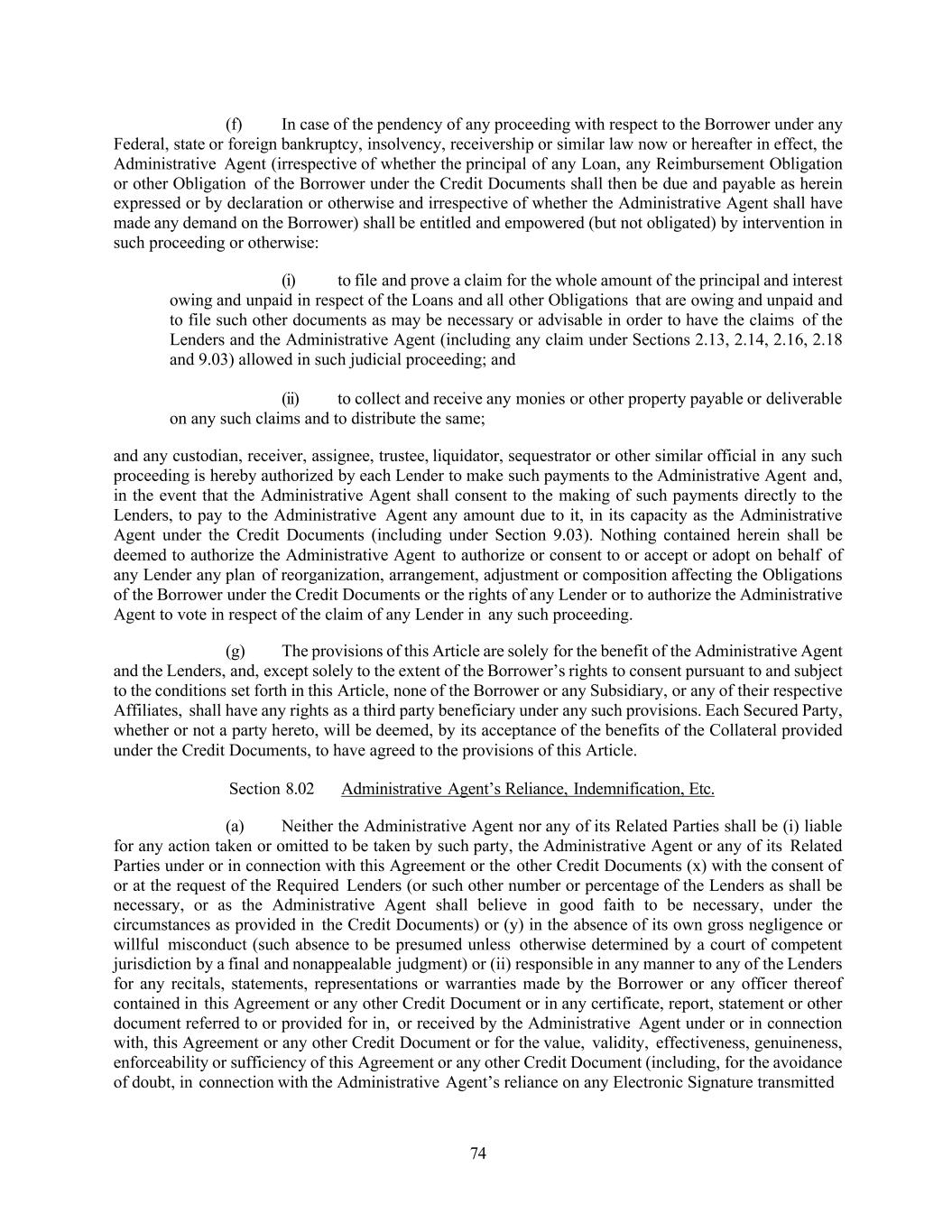 74 (f) In case of the pendency of any proceeding with respect to the Borrower under any Federal, state or foreign bankruptcy, insolvency, receivership or similar law now or hereafter in effect, the Administrative Agent (irrespective of whether the principal of any Loan, any Reimbursement Obligation or other Obligation of the Borrower under the Credit Documents shall then be due and payable as herein expressed or by declaration or otherwise and irrespective of whether the Administrative Agent shall have made any demand on the Borrower) shall be entitled and empowered (but not obligated) by intervention in such proceeding or otherwise: (i) to file and prove a claim for the whole amount of the principal and interest owing and unpaid in respect of the Loans and all other Obligations that are owing and unpaid and to file such other documents as may be necessary or advisable in order to have the claims of the Lenders and the Administrative Agent (including any claim under Sections 2.13, 2.14, 2.16, 2.18 and 9.03) allowed in such judicial proceeding; and (ii) to collect and receive any monies or other property payable or deliverable on any such claims and to distribute the same; and any custodian, receiver, assignee, trustee, liquidator, sequestrator or other similar official in any such proceeding is hereby authorized by each Lender to make such payments to the Administrative Agent and, in the event that the Administrative Agent shall consent to the making of such payments directly to the Lenders, to pay to the Administrative Agent any amount due to it, in its capacity as the Administrative Agent under the Credit Documents (including under Section 9.03). Nothing contained herein shall be deemed to authorize the Administrative Agent to authorize or consent to or accept or adopt on behalf of any Lender any plan of reorganization, arrangement, adjustment or composition affecting the Obligations of the Borrower under the Credit Documents or the rights of any Lender or to authorize the Administrative Agent to vote in respect of the claim of any Lender in any such proceeding. (g) The provisions of this Article are solely for the benefit of the Administrative Agent and the Lenders, and, except solely to the extent of the Borrower’s rights to consent pursuant to and subject to the conditions set forth in this Article, none of the Borrower or any Subsidiary, or any of their respective Affiliates, shall have any rights as a third party beneficiary under any such provisions. Each Secured Party, whether or not a party hereto, will be deemed, by its acceptance of the benefits of the Collateral provided under the Credit Documents, to have agreed to the provisions of this Article. Section 8.02 Administrative Agent’s Reliance, Indemnification, Etc. (a) Neither the Administrative Agent nor any of its Related Parties shall be (i) liable for any action taken or omitted to be taken by such party, the Administrative Agent or any of its Related Parties under or in connection with this Agreement or the other Credit Documents (x) with the consent of or at the request of the Required Lenders (or such other number or percentage of the Lenders as shall be necessary, or as the Administrative Agent shall believe in good faith to be necessary, under the circumstances as provided in the Credit Documents) or (y) in the absence of its own gross negligence or willful misconduct (such absence to be presumed unless otherwise determined by a court of competent jurisdiction by a final and nonappealable judgment) or (ii) responsible in any manner to any of the Lenders for any recitals, statements, representations or warranties made by the Borrower or any officer thereof contained in this Agreement or any other Credit Document or in any certificate, report, statement or other document referred to or provided for in, or received by the Administrative Agent under or in connection with, this Agreement or any other Credit Document or for the value, validity, effectiveness, genuineness, enforceability or sufficiency of this Agreement or any other Credit Document (including, for the avoidance of doubt, in connection with the Administrative Agent’s reliance on any Electronic Signature transmitted