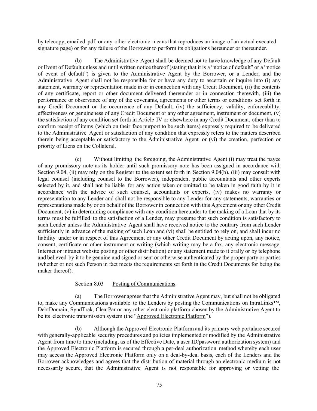 75 by telecopy, emailed pdf. or any other electronic means that reproduces an image of an actual executed signature page) or for any failure of the Borrower to perform its obligations hereunder or thereunder. (b) The Administrative Agent shall be deemed not to have knowledge of any Default or Event of Default unless and until written notice thereof (stating that it is a “notice of default” or a “notice of event of default”) is given to the Administrative Agent by the Borrower, or a Lender, and the Administrative Agent shall not be responsible for or have any duty to ascertain or inquire into (i) any statement, warranty or representation made in or in connection with any Credit Document, (ii) the contents of any certificate, report or other document delivered thereunder or in connection therewith, (iii) the performance or observance of any of the covenants, agreements or other terms or conditions set forth in any Credit Document or the occurrence of any Default, (iv) the sufficiency, validity, enforceability, effectiveness or genuineness of any Credit Document or any other agreement, instrument or document, (v) the satisfaction of any condition set forth in Article IV or elsewhere in any Credit Document, other than to confirm receipt of items (which on their face purport to be such items) expressly required to be delivered to the Administrative Agent or satisfaction of any condition that expressly refers to the matters described therein being acceptable or satisfactory to the Administrative Agent or (vi) the creation, perfection or priority of Liens on the Collateral. (c) Without limiting the foregoing, the Administrative Agent (i) may treat the payee of any promissory note as its holder until such promissory note has been assigned in accordance with Section 9.04, (ii) may rely on the Register to the extent set forth in Section 9.04(b), (iii) may consult with legal counsel (including counsel to the Borrower), independent public accountants and other experts selected by it, and shall not be liable for any action taken or omitted to be taken in good faith by it in accordance with the advice of such counsel, accountants or experts, (iv) makes no warranty or representation to any Lender and shall not be responsible to any Lender for any statements, warranties or representations made by or on behalf of the Borrower in connection with this Agreement or any other Credit Document, (v) in determining compliance with any condition hereunder to the making of a Loan that by its terms must be fulfilled to the satisfaction of a Lender, may presume that such condition is satisfactory to such Lender unless the Administrative Agent shall have received notice to the contrary from such Lender sufficiently in advance of the making of such Loan and (vi) shall be entitled to rely on, and shall incur no liability under or in respect of this Agreement or any other Credit Document by acting upon, any notice, consent, certificate or other instrument or writing (which writing may be a fax, any electronic message, Internet or intranet website posting or other distribution) or any statement made to it orally or by telephone and believed by it to be genuine and signed or sent or otherwise authenticated by the proper party or parties (whether or not such Person in fact meets the requirements set forth in the Credit Documents for being the maker thereof). Section 8.03 Posting of Communications. (a) The Borrower agrees that the Administrative Agent may, but shall not be obligated to, make any Communications available to the Lenders by posting the Communications on IntraLinks™, DebtDomain, SyndTrak, ClearPar or any other electronic platform chosen by the Administrative Agent to be its electronic transmission system (the “Approved Electronic Platform”). (b) Although the Approved Electronic Platform and its primary web portalare secured with generally-applicable security procedures and policies implemented or modified by the Administrative Agent from time to time (including, as of the Effective Date, a user ID/password authorization system) and the Approved Electronic Platform is secured through a per-deal authorization method whereby each user may access the Approved Electronic Platform only on a deal-by-deal basis, each of the Lenders and the Borrower acknowledges and agrees that the distribution of material through an electronic medium is not necessarily secure, that the Administrative Agent is not responsible for approving or vetting the