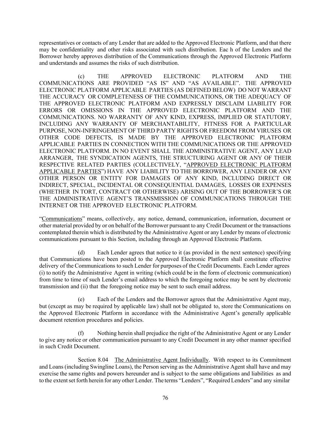 76 representatives or contacts of any Lender that are added to the Approved Electronic Platform, and that there may be confidentiality and other risks associated with such distribution. Eac h of the Lenders and the Borrower hereby approves distribution of the Communications through the Approved Electronic Platform and understands and assumes the risks of such distribution. (c) THE APPROVED ELECTRONIC PLATFORM AND THE COMMUNICATIONS ARE PROVIDED “AS IS” AND “AS AVAILABLE”. THE APPROVED ELECTRONIC PLATFORM APPLICABLE PARTIES (AS DEFINED BELOW) DO NOT WARRANT THE ACCURACY OR COMPLETENESS OF THE COMMUNICATIONS, OR THE ADEQUACY OF THE APPROVED ELECTRONIC PLATFORM AND EXPRESSLY DISCLAIM LIABILITY FOR ERRORS OR OMISSIONS IN THE APPROVED ELECTRONIC PLATFORM AND THE COMMUNICATIONS. NO WARRANTY OF ANY KIND, EXPRESS, IMPLIED OR STATUTORY, INCLUDING ANY WARRANTY OF MERCHANTABILITY, FITNESS FOR A PARTICULAR PURPOSE, NON-INFRINGEMENT OF THIRD PARTY RIGHTS OR FREEDOM FROM VIRUSES OR OTHER CODE DEFECTS, IS MADE BY THE APPROVED ELECTRONIC PLATFORM APPLICABLE PARTIES IN CONNECTION WITH THE COMMUNICATIONS OR THE APPROVED ELECTRONIC PLATFORM. IN NO EVENT SHALL THE ADMINISTRATIVE AGENT, ANY LEAD ARRANGER, THE SYNDICATION AGENTS, THE STRUCTURING AGENT OR ANY OF THEIR RESPECTIVE RELATED PARTIES (COLLECTIVELY, “APPROVED ELECTRONIC PLATFORM APPLICABLE PARTIES”) HAVE ANY LIABILITY TO THE BORROWER, ANY LENDER OR ANY OTHER PERSON OR ENTITY FOR DAMAGES OF ANY KIND, INCLUDING DIRECT OR INDIRECT, SPECIAL, INCIDENTAL OR CONSEQUENTIAL DAMAGES, LOSSES OR EXPENSES (WHETHER IN TORT, CONTRACT OR OTHERWISE) ARISING OUT OF THE BORROWER’S OR THE ADMINISTRATIVE AGENT’S TRANSMISSION OF COMMUNICATIONS THROUGH THE INTERNET OR THE APPROVED ELECTRONIC PLATFORM. “Communications” means, collectively, any notice, demand, communication, information, document or other material provided by or on behalf of the Borrower pursuant to any Credit Document or the transactions contemplated therein which is distributed by the Administrative Agent or any Lender by means of electronic communications pursuant to this Section, including through an Approved Electronic Platform. (d) Each Lender agrees that notice to it (as provided in the next sentence) specifying that Communications have been posted to the Approved Electronic Platform shall constitute effective delivery of the Communications to such Lender for purposes of the Credit Documents. Each Lender agrees (i) to notify the Administrative Agent in writing (which could be in the form of electronic communication) from time to time of such Lender’s email address to which the foregoing notice may be sent by electronic transmission and (ii) that the foregoing notice may be sent to such email address. (e) Each of the Lenders and the Borrower agrees that the Administrative Agent may, but (except as may be required by applicable law) shall not be obligated to, store the Communications on the Approved Electronic Platform in accordance with the Administrative Agent’s generally applicable document retention procedures and policies. (f) Nothing herein shall prejudice the right of the Administrative Agent or any Lender to give any notice or other communication pursuant to any Credit Document in any other manner specified in such Credit Document. Section 8.04 The Administrative Agent Individually. With respect to its Commitment and Loans (including Swingline Loans), the Person serving as the Administrative Agent shall have and may exercise the same rights and powers hereunder and is subject to the same obligations and liabilities as and to the extent set forth herein for any other Lender. The terms “Lenders”, “Required Lenders” and any similar