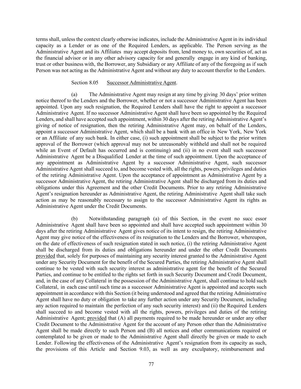 77 terms shall, unless the context clearly otherwise indicates, include the Administrative Agent in its individual capacity as a Lender or as one of the Required Lenders, as applicable. The Person serving as the Administrative Agent and its Affiliates may accept deposits from, lend money to, own securities of, act as the financial advisor or in any other advisory capacity for and generally engage in any kind of banking, trust or other business with, the Borrower, any Subsidiary or any Affiliate of any of the foregoing as if such Person was not acting as the Administrative Agent and without any duty to account therefor to the Lenders. Section 8.05 Successor Administrative Agent. (a) The Administrative Agent may resign at any time by giving 30 days’ prior written notice thereof to the Lenders and the Borrower, whether or not a successor Administrative Agent has been appointed. Upon any such resignation, the Required Lenders shall have the right to appoint a successor Administrative Agent. If no successor Administrative Agent shall have been so appointed by the Required Lenders, and shall have accepted such appointment, within 30 days after the retiring Administrative Agent’s giving of notice of resignation, then the retiring Administrative Agent may, on behalf of the Lenders, appoint a successor Administrative Agent, which shall be a bank with an office in New York, New York or an Affiliate of any such bank. In either case, (i) such appointment shall be subject to the prior written approval of the Borrower (which approval may not be unreasonably withheld and shall not be required while an Event of Default has occurred and is continuing) and (ii) in no event shall such successor Administrative Agent be a Disqualified Lender at the time of such appointment. Upon the acceptance of any appointment as Administrative Agent by a successor Administrative Agent, such successor Administrative Agent shall succeed to, and become vested with, all the rights, powers, privileges and duties of the retiring Administrative Agent. Upon the acceptance of appointment as Administrative Agent by a successor Administrative Agent, the retiring Administrative Agent shall be discharged from its duties and obligations under this Agreement and the other Credit Documents. Prior to any retiring Administrative Agent’s resignation hereunder as Administrative Agent, the retiring Administrative Agent shall take such action as may be reasonably necessary to assign to the successor Administrative Agent its rights as Administrative Agent under the Credit Documents. (b) Notwithstanding paragraph (a) of this Section, in the event no succ essor Administrative Agent shall have been so appointed and shall have accepted such appointment within 30 days after the retiring Administrative Agent gives notice of its intent to resign, the retiring Administrative Agent may give notice of the effectiveness of its resignation to the Lenders and the Borrower, whereupon, on the date of effectiveness of such resignation stated in such notice, (i) the retiring Administrative Agent shall be discharged from its duties and obligations hereunder and under the other Credit Documents provided that, solely for purposes of maintaining any security interest granted to the Administrative Agent under any Security Document for the benefit of the Secured Parties, the retiring Administrative Agent shall continue to be vested with such security interest as administrative agent for the benefit of the Secured Parties, and continue to be entitled to the rights set forth in such Security Document and Credit Document, and, in the case of any Collateral in the possession of the Administrative Agent, shall continue to hold such Collateral, in each case until such time as a successor Administrative Agent is appointed and accepts such appointment in accordance with this Section (it being understood and agreed that the retiring Administrative Agent shall have no duty or obligation to take any further action under any Security Document, including any action required to maintain the perfection of any such security interest) and (ii) the Required Lenders shall succeed to and become vested with all the rights, powers, privileges and duties of the retiring Administrative Agent; provided that (A) all payments required to be made hereunder or under any other Credit Document to the Administrative Agent for the account of any Person other than the Administrative Agent shall be made directly to such Person and (B) all notices and other communications required or contemplated to be given or made to the Administrative Agent shall directly be given or made to each Lender. Following the effectiveness of the Administrative Agent’s resignation from its capacity as such, the provisions of this Article and Section 9.03, as well as any exculpatory, reimbursement and