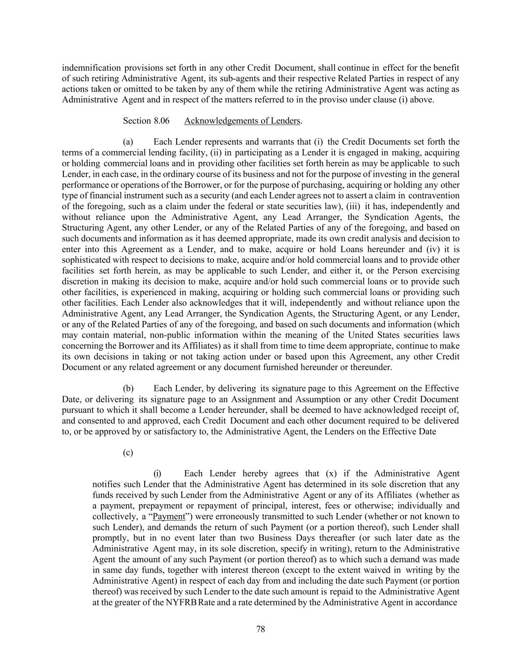 78 indemnification provisions set forth in any other Credit Document, shall continue in effect for the benefit of such retiring Administrative Agent, its sub-agents and their respective Related Parties in respect of any actions taken or omitted to be taken by any of them while the retiring Administrative Agent was acting as Administrative Agent and in respect of the matters referred to in the proviso under clause (i) above. Section 8.06 Acknowledgements of Lenders. (a) Each Lender represents and warrants that (i) the Credit Documents set forth the terms of a commercial lending facility, (ii) in participating as a Lender it is engaged in making, acquiring or holding commercial loans and in providing other facilities set forth herein as may be applicable to such Lender, in each case, in the ordinary course of its business and not for the purpose of investing in the general performance or operations of the Borrower, or for the purpose of purchasing, acquiring or holding any other type of financial instrument such as a security (and each Lender agrees not to assert a claim in contravention of the foregoing, such as a claim under the federal or state securities law), (iii) it has, independently and without reliance upon the Administrative Agent, any Lead Arranger, the Syndication Agents, the Structuring Agent, any other Lender, or any of the Related Parties of any of the foregoing, and based on such documents and information as it has deemed appropriate, made its own credit analysis and decision to enter into this Agreement as a Lender, and to make, acquire or hold Loans hereunder and (iv) it is sophisticated with respect to decisions to make, acquire and/or hold commercial loans and to provide other facilities set forth herein, as may be applicable to such Lender, and either it, or the Person exercising discretion in making its decision to make, acquire and/or hold such commercial loans or to provide such other facilities, is experienced in making, acquiring or holding such commercial loans or providing such other facilities. Each Lender also acknowledges that it will, independently and without reliance upon the Administrative Agent, any Lead Arranger, the Syndication Agents, the Structuring Agent, or any Lender, or any of the Related Parties of any of the foregoing, and based on such documents and information (which may contain material, non-public information within the meaning of the United States securities laws concerning the Borrower and its Affiliates) as it shall from time to time deem appropriate, continue to make its own decisions in taking or not taking action under or based upon this Agreement, any other Credit Document or any related agreement or any document furnished hereunder or thereunder. (b) Each Lender, by delivering its signature page to this Agreement on the Effective Date, or delivering its signature page to an Assignment and Assumption or any other Credit Document pursuant to which it shall become a Lender hereunder, shall be deemed to have acknowledged receipt of, and consented to and approved, each Credit Document and each other document required to be delivered to, or be approved by or satisfactory to, the Administrative Agent, the Lenders on the Effective Date (c) (i) Each Lender hereby agrees that (x) if the Administrative Agent notifies such Lender that the Administrative Agent has determined in its sole discretion that any funds received by such Lender from the Administrative Agent or any of its Affiliates (whether as a payment, prepayment or repayment of principal, interest, fees or otherwise; individually and collectively, a “Payment”) were erroneously transmitted to such Lender (whether or not known to such Lender), and demands the return of such Payment (or a portion thereof), such Lender shall promptly, but in no event later than two Business Days thereafter (or such later date as the Administrative Agent may, in its sole discretion, specify in writing), return to the Administrative Agent the amount of any such Payment (or portion thereof) as to which such a demand was made in same day funds, together with interest thereon (except to the extent waived in writing by the Administrative Agent) in respect of each day from and including the date such Payment (or portion thereof) was received by such Lender to the date such amount is repaid to the Administrative Agent at the greater of the NYFRB Rate and a rate determined by the Administrative Agent in accordance