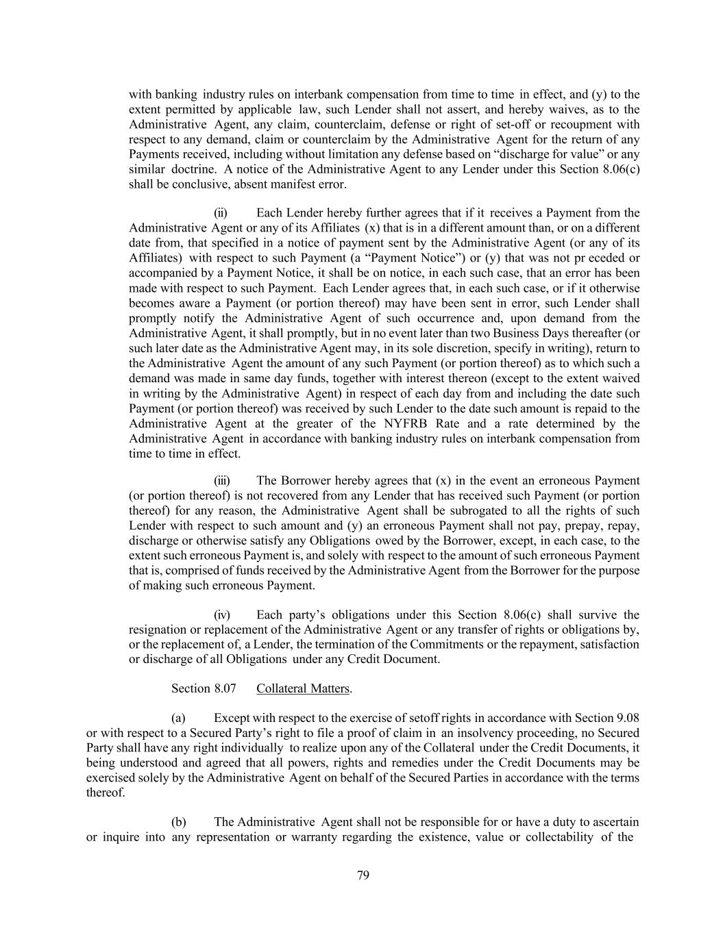 79 with banking industry rules on interbank compensation from time to time in effect, and (y) to the extent permitted by applicable law, such Lender shall not assert, and hereby waives, as to the Administrative Agent, any claim, counterclaim, defense or right of set-off or recoupment with respect to any demand, claim or counterclaim by the Administrative Agent for the return of any Payments received, including without limitation any defense based on “discharge for value” or any similar doctrine. A notice of the Administrative Agent to any Lender under this Section 8.06(c) shall be conclusive, absent manifest error. (ii) Each Lender hereby further agrees that if it receives a Payment from the Administrative Agent or any of its Affiliates (x) that is in a different amount than, or on a different date from, that specified in a notice of payment sent by the Administrative Agent (or any of its Affiliates) with respect to such Payment (a “Payment Notice”) or (y) that was not pr eceded or accompanied by a Payment Notice, it shall be on notice, in each such case, that an error has been made with respect to such Payment. Each Lender agrees that, in each such case, or if it otherwise becomes aware a Payment (or portion thereof) may have been sent in error, such Lender shall promptly notify the Administrative Agent of such occurrence and, upon demand from the Administrative Agent, it shall promptly, but in no event later than two Business Days thereafter (or such later date as the Administrative Agent may, in its sole discretion, specify in writing), return to the Administrative Agent the amount of any such Payment (or portion thereof) as to which such a demand was made in same day funds, together with interest thereon (except to the extent waived in writing by the Administrative Agent) in respect of each day from and including the date such Payment (or portion thereof) was received by such Lender to the date such amount is repaid to the Administrative Agent at the greater of the NYFRB Rate and a rate determined by the Administrative Agent in accordance with banking industry rules on interbank compensation from time to time in effect. (iii) The Borrower hereby agrees that (x) in the event an erroneous Payment (or portion thereof) is not recovered from any Lender that has received such Payment (or portion thereof) for any reason, the Administrative Agent shall be subrogated to all the rights of such Lender with respect to such amount and (y) an erroneous Payment shall not pay, prepay, repay, discharge or otherwise satisfy any Obligations owed by the Borrower, except, in each case, to the extent such erroneous Payment is, and solely with respect to the amount of such erroneous Payment that is, comprised of funds received by the Administrative Agent from the Borrower for the purpose of making such erroneous Payment. (iv) Each party’s obligations under this Section 8.06(c) shall survive the resignation or replacement of the Administrative Agent or any transfer of rights or obligations by, or the replacement of, a Lender, the termination of the Commitments or the repayment, satisfaction or discharge of all Obligations under any Credit Document. Section 8.07 Collateral Matters. (a) Except with respect to the exercise of setoff rights in accordance with Section 9.08 or with respect to a Secured Party’s right to file a proof of claim in an insolvency proceeding, no Secured Party shall have any right individually to realize upon any of the Collateral under the Credit Documents, it being understood and agreed that all powers, rights and remedies under the Credit Documents may be exercised solely by the Administrative Agent on behalf of the Secured Parties in accordance with the terms thereof. (b) The Administrative Agent shall not be responsible for or have a duty to ascertain or inquire into any representation or warranty regarding the existence, value or collectability of the