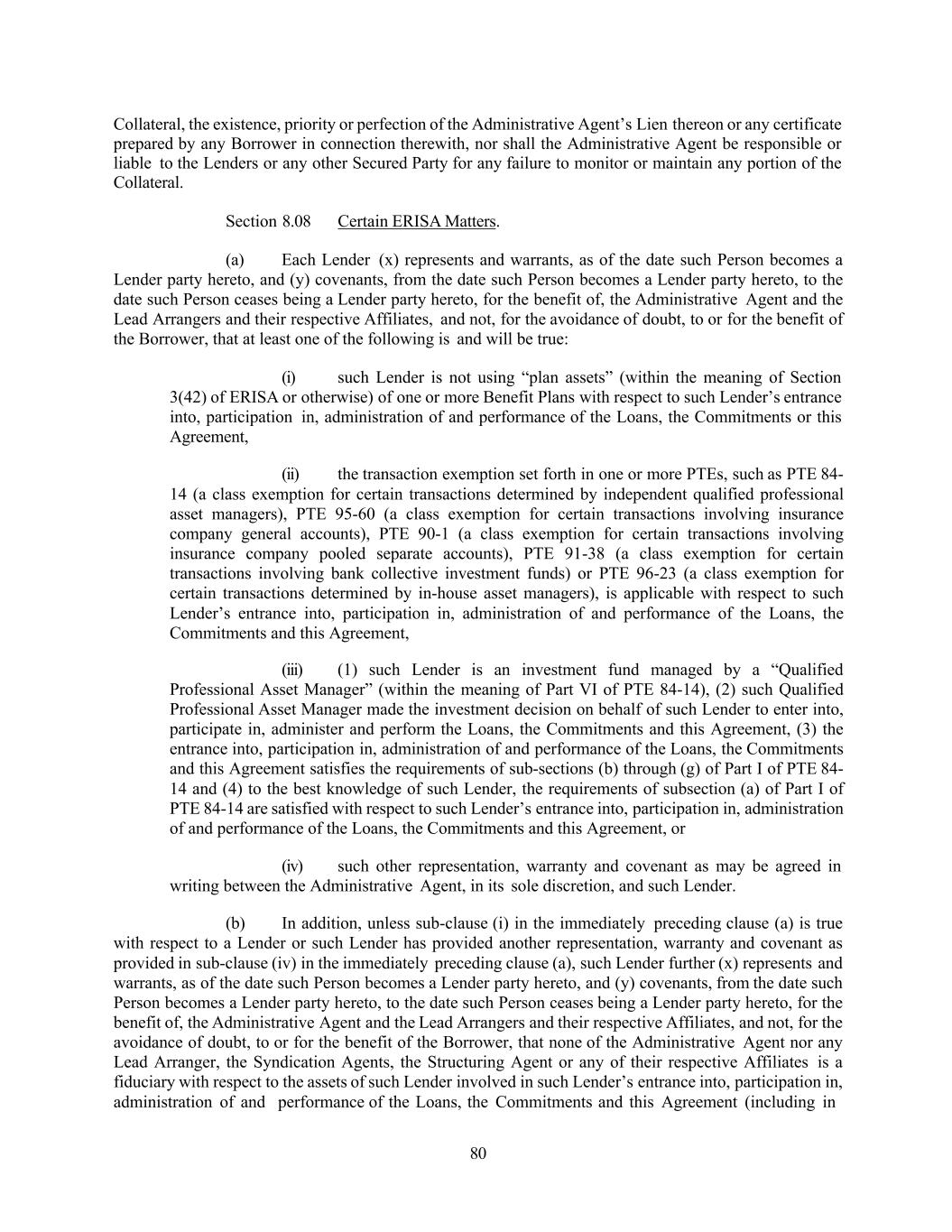 80 Collateral, the existence, priority or perfection of the Administrative Agent’s Lien thereon or any certificate prepared by any Borrower in connection therewith, nor shall the Administrative Agent be responsible or liable to the Lenders or any other Secured Party for any failure to monitor or maintain any portion of the Collateral. Section 8.08 Certain ERISA Matters. (a) Each Lender (x) represents and warrants, as of the date such Person becomes a Lender party hereto, and (y) covenants, from the date such Person becomes a Lender party hereto, to the date such Person ceases being a Lender party hereto, for the benefit of, the Administrative Agent and the Lead Arrangers and their respective Affiliates, and not, for the avoidance of doubt, to or for the benefit of the Borrower, that at least one of the following is and will be true: (i) such Lender is not using “plan assets” (within the meaning of Section 3(42) of ERISA or otherwise) of one or more Benefit Plans with respect to such Lender’s entrance into, participation in, administration of and performance of the Loans, the Commitments or this Agreement, (ii) the transaction exemption set forth in one or more PTEs, such as PTE 84- 14 (a class exemption for certain transactions determined by independent qualified professional asset managers), PTE 95-60 (a class exemption for certain transactions involving insurance company general accounts), PTE 90-1 (a class exemption for certain transactions involving insurance company pooled separate accounts), PTE 91-38 (a class exemption for certain transactions involving bank collective investment funds) or PTE 96-23 (a class exemption for certain transactions determined by in-house asset managers), is applicable with respect to such Lender’s entrance into, participation in, administration of and performance of the Loans, the Commitments and this Agreement, (iii) (1) such Lender is an investment fund managed by a “Qualified Professional Asset Manager” (within the meaning of Part VI of PTE 84-14), (2) such Qualified Professional Asset Manager made the investment decision on behalf of such Lender to enter into, participate in, administer and perform the Loans, the Commitments and this Agreement, (3) the entrance into, participation in, administration of and performance of the Loans, the Commitments and this Agreement satisfies the requirements of sub-sections (b) through (g) of Part I of PTE 84- 14 and (4) to the best knowledge of such Lender, the requirements of subsection (a) of Part I of PTE 84-14 are satisfied with respect to such Lender’s entrance into, participation in, administration of and performance of the Loans, the Commitments and this Agreement, or (iv) such other representation, warranty and covenant as may be agreed in writing between the Administrative Agent, in its sole discretion, and such Lender. (b) In addition, unless sub-clause (i) in the immediately preceding clause (a) is true with respect to a Lender or such Lender has provided another representation, warranty and covenant as provided in sub-clause (iv) in the immediately preceding clause (a), such Lender further (x) represents and warrants, as of the date such Person becomes a Lender party hereto, and (y) covenants, from the date such Person becomes a Lender party hereto, to the date such Person ceases being a Lender party hereto, for the benefit of, the Administrative Agent and the Lead Arrangers and their respective Affiliates, and not, for the avoidance of doubt, to or for the benefit of the Borrower, that none of the Administrative Agent nor any Lead Arranger, the Syndication Agents, the Structuring Agent or any of their respective Affiliates is a fiduciary with respect to the assets of such Lender involved in such Lender’s entrance into, participation in, administration of and performance of the Loans, the Commitments and this Agreement (including in