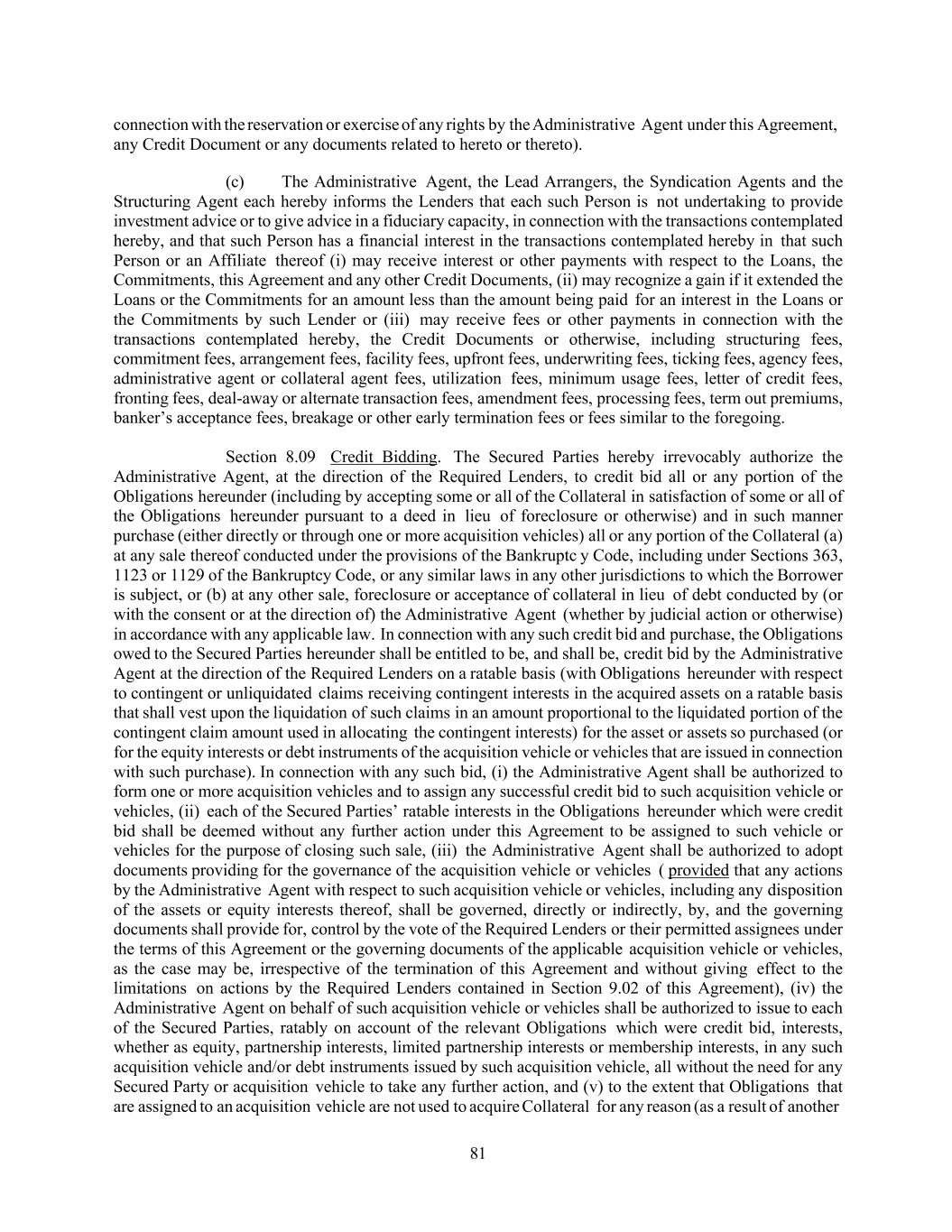 81 connection with the reservation or exercise of any rights by the Administrative Agent under this Agreement, any Credit Document or any documents related to hereto or thereto). (c) The Administrative Agent, the Lead Arrangers, the Syndication Agents and the Structuring Agent each hereby informs the Lenders that each such Person is not undertaking to provide investment advice or to give advice in a fiduciary capacity, in connection with the transactions contemplated hereby, and that such Person has a financial interest in the transactions contemplated hereby in that such Person or an Affiliate thereof (i) may receive interest or other payments with respect to the Loans, the Commitments, this Agreement and any other Credit Documents, (ii) may recognize a gain if it extended the Loans or the Commitments for an amount less than the amount being paid for an interest in the Loans or the Commitments by such Lender or (iii) may receive fees or other payments in connection with the transactions contemplated hereby, the Credit Documents or otherwise, including structuring fees, commitment fees, arrangement fees, facility fees, upfront fees, underwriting fees, ticking fees, agency fees, administrative agent or collateral agent fees, utilization fees, minimum usage fees, letter of credit fees, fronting fees, deal-away or alternate transaction fees, amendment fees, processing fees, term out premiums, banker’s acceptance fees, breakage or other early termination fees or fees similar to the foregoing. Section 8.09 Credit Bidding. The Secured Parties hereby irrevocably authorize the Administrative Agent, at the direction of the Required Lenders, to credit bid all or any portion of the Obligations hereunder (including by accepting some or all of the Collateral in satisfaction of some or all of the Obligations hereunder pursuant to a deed in lieu of foreclosure or otherwise) and in such manner purchase (either directly or through one or more acquisition vehicles) all or any portion of the Collateral (a) at any sale thereof conducted under the provisions of the Bankruptc y Code, including under Sections 363, 1123 or 1129 of the Bankruptcy Code, or any similar laws in any other jurisdictions to which the Borrower is subject, or (b) at any other sale, foreclosure or acceptance of collateral in lieu of debt conducted by (or with the consent or at the direction of) the Administrative Agent (whether by judicial action or otherwise) in accordance with any applicable law. In connection with any such credit bid and purchase, the Obligations owed to the Secured Parties hereunder shall be entitled to be, and shall be, credit bid by the Administrative Agent at the direction of the Required Lenders on a ratable basis (with Obligations hereunder with respect to contingent or unliquidated claims receiving contingent interests in the acquired assets on a ratable basis that shall vest upon the liquidation of such claims in an amount proportional to the liquidated portion of the contingent claim amount used in allocating the contingent interests) for the asset or assets so purchased (or for the equity interests or debt instruments of the acquisition vehicle or vehicles that are issued in connection with such purchase). In connection with any such bid, (i) the Administrative Agent shall be authorized to form one or more acquisition vehicles and to assign any successful credit bid to such acquisition vehicle or vehicles, (ii) each of the Secured Parties’ ratable interests in the Obligations hereunder which were credit bid shall be deemed without any further action under this Agreement to be assigned to such vehicle or vehicles for the purpose of closing such sale, (iii) the Administrative Agent shall be authorized to adopt documents providing for the governance of the acquisition vehicle or vehicles ( provided that any actions by the Administrative Agent with respect to such acquisition vehicle or vehicles, including any disposition of the assets or equity interests thereof, shall be governed, directly or indirectly, by, and the governing documents shall provide for, control by the vote of the Required Lenders or their permitted assignees under the terms of this Agreement or the governing documents of the applicable acquisition vehicle or vehicles, as the case may be, irrespective of the termination of this Agreement and without giving effect to the limitations on actions by the Required Lenders contained in Section 9.02 of this Agreement), (iv) the Administrative Agent on behalf of such acquisition vehicle or vehicles shall be authorized to issue to each of the Secured Parties, ratably on account of the relevant Obligations which were credit bid, interests, whether as equity, partnership interests, limited partnership interests or membership interests, in any such acquisition vehicle and/or debt instruments issued by such acquisition vehicle, all without the need for any Secured Party or acquisition vehicle to take any further action, and (v) to the extent that Obligations that are assigned to an acquisition vehicle are not used to acquire Collateral for any reason (as a result of another
