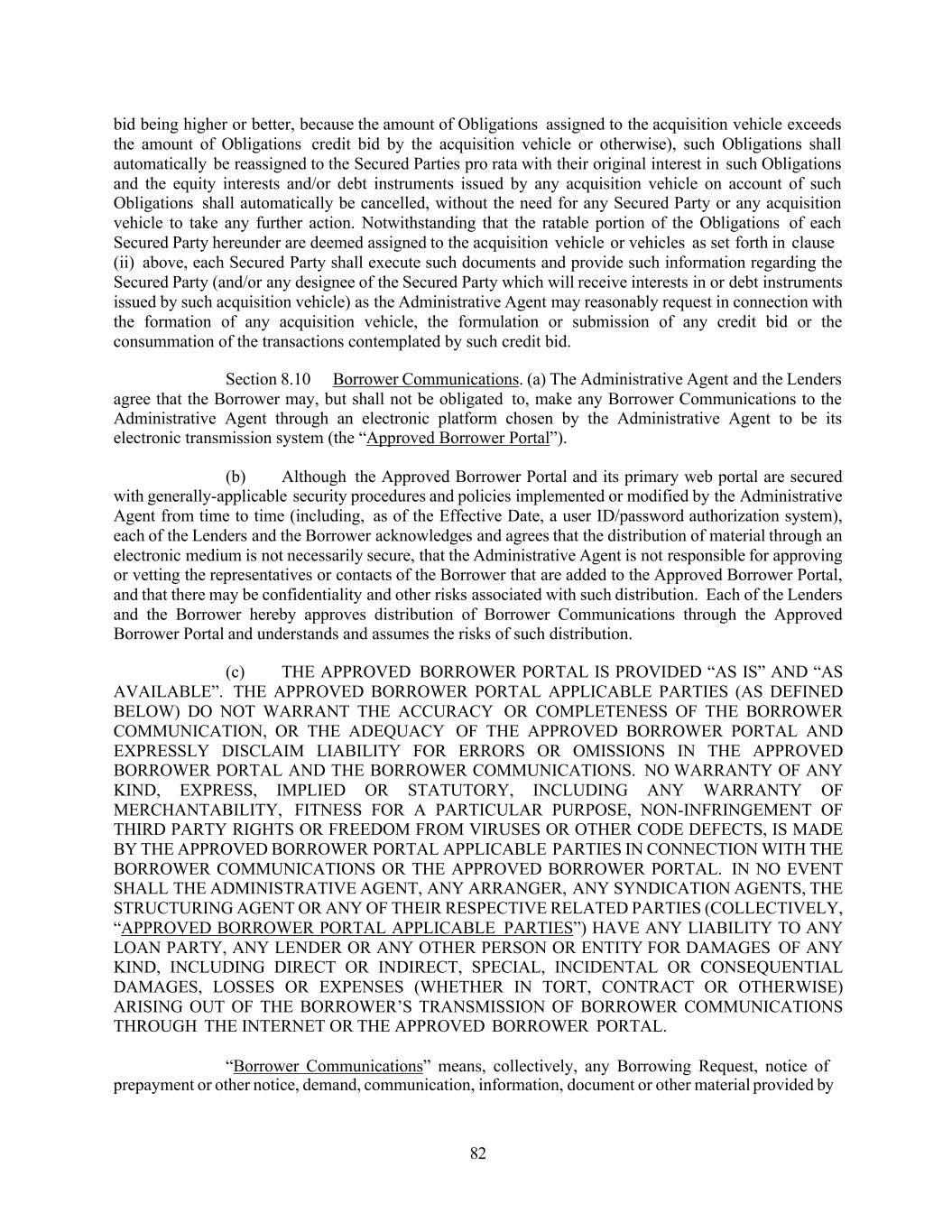82 bid being higher or better, because the amount of Obligations assigned to the acquisition vehicle exceeds the amount of Obligations credit bid by the acquisition vehicle or otherwise), such Obligations shall automatically be reassigned to the Secured Parties pro rata with their original interest in such Obligations and the equity interests and/or debt instruments issued by any acquisition vehicle on account of such Obligations shall automatically be cancelled, without the need for any Secured Party or any acquisition vehicle to take any further action. Notwithstanding that the ratable portion of the Obligations of each Secured Party hereunder are deemed assigned to the acquisition vehicle or vehicles as set forth in clause (ii) above, each Secured Party shall execute such documents and provide such information regarding the Secured Party (and/or any designee of the Secured Party which will receive interests in or debt instruments issued by such acquisition vehicle) as the Administrative Agent may reasonably request in connection with the formation of any acquisition vehicle, the formulation or submission of any credit bid or the consummation of the transactions contemplated by such credit bid. Section 8.10 Borrower Communications. (a) The Administrative Agent and the Lenders agree that the Borrower may, but shall not be obligated to, make any Borrower Communications to the Administrative Agent through an electronic platform chosen by the Administrative Agent to be its electronic transmission system (the “Approved Borrower Portal”). (b) Although the Approved Borrower Portal and its primary web portal are secured with generally-applicable security procedures and policies implemented or modified by the Administrative Agent from time to time (including, as of the Effective Date, a user ID/password authorization system), each of the Lenders and the Borrower acknowledges and agrees that the distribution of material through an electronic medium is not necessarily secure, that the Administrative Agent is not responsible for approving or vetting the representatives or contacts of the Borrower that are added to the Approved Borrower Portal, and that there may be confidentiality and other risks associated with such distribution. Each of the Lenders and the Borrower hereby approves distribution of Borrower Communications through the Approved Borrower Portal and understands and assumes the risks of such distribution. (c) THE APPROVED BORROWER PORTAL IS PROVIDED “AS IS” AND “AS AVAILABLE”. THE APPROVED BORROWER PORTAL APPLICABLE PARTIES (AS DEFINED BELOW) DO NOT WARRANT THE ACCURACY OR COMPLETENESS OF THE BORROWER COMMUNICATION, OR THE ADEQUACY OF THE APPROVED BORROWER PORTAL AND EXPRESSLY DISCLAIM LIABILITY FOR ERRORS OR OMISSIONS IN THE APPROVED BORROWER PORTAL AND THE BORROWER COMMUNICATIONS. NO WARRANTY OF ANY KIND, EXPRESS, IMPLIED OR STATUTORY, INCLUDING ANY WARRANTY OF MERCHANTABILITY, FITNESS FOR A PARTICULAR PURPOSE, NON-INFRINGEMENT OF THIRD PARTY RIGHTS OR FREEDOM FROM VIRUSES OR OTHER CODE DEFECTS, IS MADE BY THE APPROVED BORROWER PORTAL APPLICABLE PARTIES IN CONNECTION WITH THE BORROWER COMMUNICATIONS OR THE APPROVED BORROWER PORTAL. IN NO EVENT SHALL THE ADMINISTRATIVE AGENT, ANY ARRANGER, ANY SYNDICATION AGENTS, THE STRUCTURING AGENT OR ANY OF THEIR RESPECTIVE RELATED PARTIES (COLLECTIVELY, “APPROVED BORROWER PORTAL APPLICABLE PARTIES”) HAVE ANY LIABILITY TO ANY LOAN PARTY, ANY LENDER OR ANY OTHER PERSON OR ENTITY FOR DAMAGES OF ANY KIND, INCLUDING DIRECT OR INDIRECT, SPECIAL, INCIDENTAL OR CONSEQUENTIAL DAMAGES, LOSSES OR EXPENSES (WHETHER IN TORT, CONTRACT OR OTHERWISE) ARISING OUT OF THE BORROWER’S TRANSMISSION OF BORROWER COMMUNICATIONS THROUGH THE INTERNET OR THE APPROVED BORROWER PORTAL. “Borrower Communications” means, collectively, any Borrowing Request, notice of prepayment or other notice, demand, communication, information, document or other material provided by