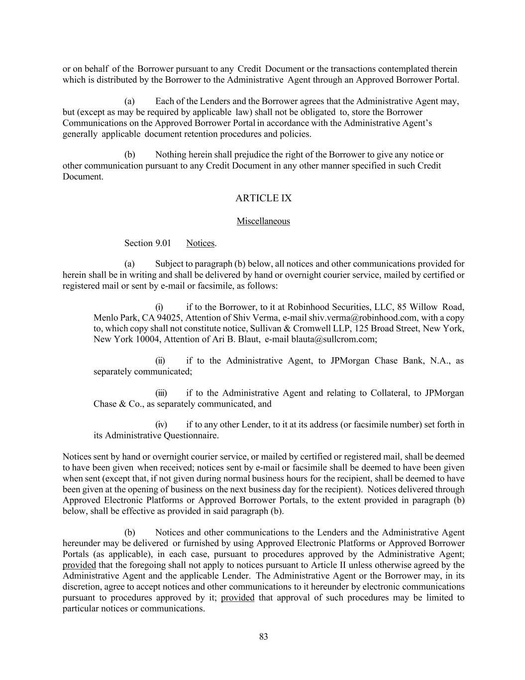 83 or on behalf of the Borrower pursuant to any Credit Document or the transactions contemplated therein which is distributed by the Borrower to the Administrative Agent through an Approved Borrower Portal. (a) Each of the Lenders and the Borrower agrees that the Administrative Agent may, but (except as may be required by applicable law) shall not be obligated to, store the Borrower Communications on the Approved Borrower Portal in accordance with the Administrative Agent’s generally applicable document retention procedures and policies. (b) Nothing herein shall prejudice the right of the Borrower to give any notice or other communication pursuant to any Credit Document in any other manner specified in such Credit Document. ARTICLE IX Miscellaneous Section 9.01 Notices. (a) Subject to paragraph (b) below, all notices and other communications provided for herein shall be in writing and shall be delivered by hand or overnight courier service, mailed by certified or registered mail or sent by e-mail or facsimile, as follows: (i) if to the Borrower, to it at Robinhood Securities, LLC, 85 Willow Road, Menlo Park, CA 94025, Attention of Shiv Verma, e-mail shiv.verma@robinhood.com, with a copy to, which copy shall not constitute notice, Sullivan & Cromwell LLP, 125 Broad Street, New York, New York 10004, Attention of Ari B. Blaut, e-mail blauta@sullcrom.com; (ii) if to the Administrative Agent, to JPMorgan Chase Bank, N.A., as separately communicated; (iii) if to the Administrative Agent and relating to Collateral, to JPMorgan Chase & Co., as separately communicated, and (iv) if to any other Lender, to it at its address (or facsimile number) set forth in its Administrative Questionnaire. Notices sent by hand or overnight courier service, or mailed by certified or registered mail, shall be deemed to have been given when received; notices sent by e-mail or facsimile shall be deemed to have been given when sent (except that, if not given during normal business hours for the recipient, shall be deemed to have been given at the opening of business on the next business day for the recipient). Notices delivered through Approved Electronic Platforms or Approved Borrower Portals, to the extent provided in paragraph (b) below, shall be effective as provided in said paragraph (b). (b) Notices and other communications to the Lenders and the Administrative Agent hereunder may be delivered or furnished by using Approved Electronic Platforms or Approved Borrower Portals (as applicable), in each case, pursuant to procedures approved by the Administrative Agent; provided that the foregoing shall not apply to notices pursuant to Article II unless otherwise agreed by the Administrative Agent and the applicable Lender. The Administrative Agent or the Borrower may, in its discretion, agree to accept notices and other communications to it hereunder by electronic communications pursuant to procedures approved by it; provided that approval of such procedures may be limited to particular notices or communications.